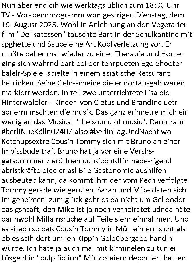 20.08.2025 11:45 Nun aber endlcih wie werktags üblich zum 18:00 Uhr TV - Vorabendprogramm vom gestrigen Dienstag, dem 19. August 2025. Wohl in Anlehnung an den Vegetarier film "Delikatessen" täuschte Bart in der Schulkantine mit spghette und Sauce eine Art Kopfverletzung vor. Er mußte daher mal wieder zu einer Therapie und Homer ging sich währnd bart bei der tehrpueten Ego-Shooter balelr-Spiele spielte in einem asiatische Retsurant betrinken. Seine Geld-scheine die er dortausgab waren markiert worden. In teil zwo unterrichtete Lisa die Hinterwäldler - Kinder von Cletus und Brandine uetr adnerm mschten die musik. Das ganz erinnetre mich ein wenig an das Musical "the sound of music". Dann kam #berliNueKölln02407 also #berlinTagUndNacht wo Ketchupsextre Cousin Tommy sich mit Bruno an einer Imbissbude traf. Bruno hat ja vor eine Vershs-gatsornomer z eröffnen udnsiochtdfür häde-rigend abristkräfte diee er asl Bile Gastonomie aushilfen ausbeuteb kann, da kommt ihm der vom Pech verfolgte Tommy gerade wie gerufen. Sarah und Mike daten sich im geheimen, zum glück geht es da nicht um Gel doder das gshcäft, den Mike ist ja noch verheiratet udnda häte dannwohl Milla nsrüche auf Teile sienr einnahmen. Und es sitach so daß Cousin Tommy in Müllleimern sicht als ob es scih dort um ien Kippin Geldübergabe handln würde. Ich hate ja auch mal mit kirminelen zu tun ei Lösgeld in "pulp fiction" Müllcotaiern deponiert hatten. https://tvinfo.de/fernsehprogramm/2191527054-die-simpsons https://tvinfo.de/fernsehprogramm/2191527060-die-simpsons [0] "202508201145-0-1.jpg" |