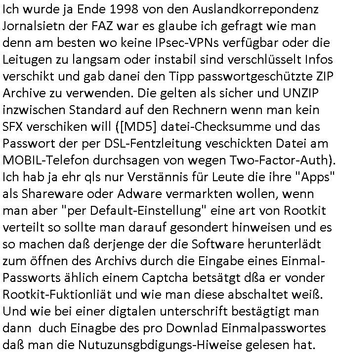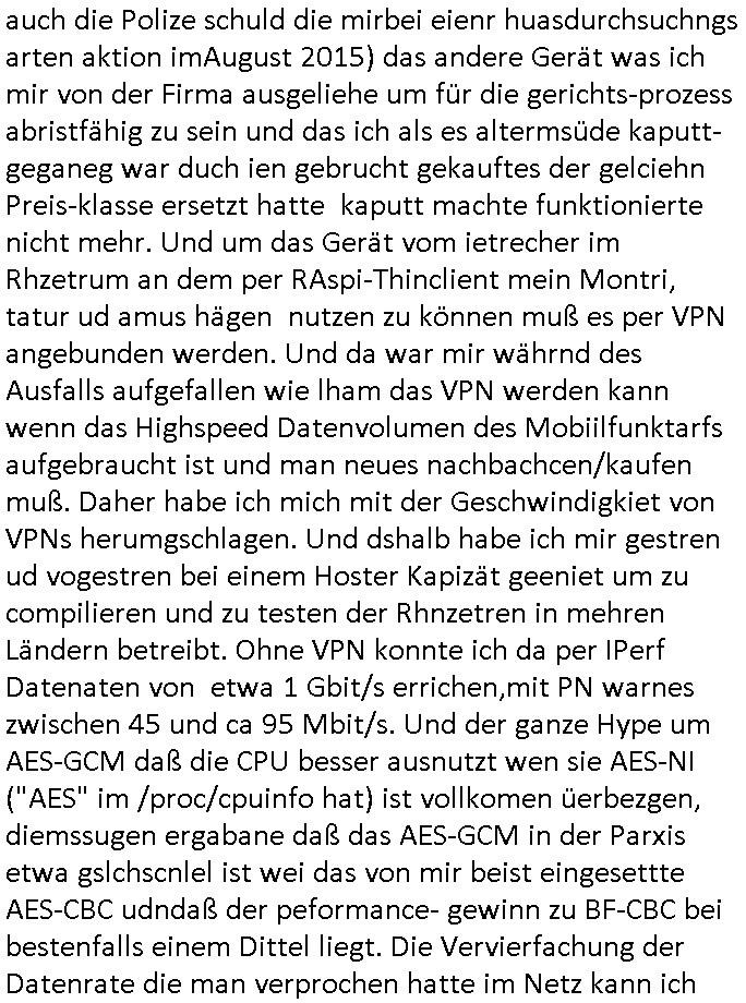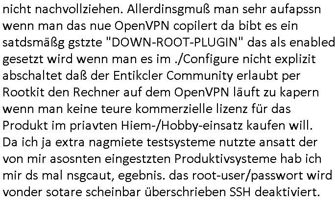 24.08.2025 04:00 Ich habe gestern verunsichert darüber daß im Intrenet über die Geschwindgkeit von hardwarebeschleunigtem AES-NI/CGM was OpenVPN - TLS/SSL VPN Tunnel angeht möglicherweise Falschinformation kursieren ein OpenSSL compiliert und ein OpenVPN. Ich slbst nutze OpenVPN um auf der Strecke von meiner Wohnung zu dem Windows-Mietrechner im Rechenzentrum etwa für Ausdrucke, für Bildschirmaus- und Tastatur/Maus-eingaben des RasPI Thin-Clients den ich mir gebastelt hatte als die von mir benutzen Rechner die mein Bruder und meine Familie mir zur Verfügung getsellt hatten udn die ehemalige Firma beschlagnahmt worden waren. Die korrupte ReGIERung/Justiz/Polizei ist hier also mal wieder der Hauptschuldige. Auch weil sie das grundgesetzlich eigentlich garantierte Fernmeldgeheimnis verletzt wieich aus Erfharung weiß. Ansonsten tät es auch eine unverschlüsselter, wesentlich einfacherer GRE / IP(in)IP-Tunnel der performanter ist. Ich habe ja gesagt daß es für die Teleworker-Homeoffice artige RDP Bildschirm-ausgabe mit ca 1024x768 in 16 bit Farbe aureicht was die ganz bllge < 16/1 MBit/s T-(a)DSL Leitung hergibt wenn man keine Videos / Bewegt-bilder (vor allem mit Ton) anschauen muß (Video - Streaming) daß hat bestfalsl die qulit eisn ruckeldne animerten GIFs. Und daß die < 16 MBits/s Leitung ja nur ca. < 1 Mbit/s im Upstream hat (vom Provider Versprochen warn bis zu 2 Mbit/s druch das Upgrade auf Annex-J, am weit enefreen DSLAM kann es nicht liegen, der graue Schltkasten von der Tlekom in dem die glasfasern enden steht nur wenige Meter neben dem Haus udn ich ich hab als man meine Leitung sabtierete temoprär 25m CAT5 kabel flegende durch Treppenhasu zum Anschcluß in den Keller gelegt udn auf dem die selben gshcnwindgeite bekommen wie durch den damslas gestörten Telefondraht vom Keller in meine Wohnung). Ich hate damsl sogra angereget dem vrmiter, einem Dachdecker vorzsuchalgen ein für Blitz- schlag unempfindlches LWL/Glasfaserkabel hinter der Regenrinne unsichtbar versteckt nach unten zu führen um es dann die 3-4 m unter der Einfahrt aufdem iege Grundtsück zum benachbarten grauen Schaltkasten der Telekom zu führen der wie gesagt nur wenige Meter entfernt steht und per Gals Ruchtung DeCIX Ring ange-bunden ist, 250 m von der Eruoüpäschn Zentralbnk EZB entfernt sollte ja genug GAsfaterKapaziät verbuddelt sein. Das ganze muß abndpbetensprsam genug sien daß ich notfals wenn das DSL-Kabel ausfällt auch über Mobilfunk (Highspeed Datenvolumen das geld koste, "gigabytes") in ienr stark fuktionsreduzierten Fassung weiterarbeiten kann. Und als das DSL Kabel tatsächlich ausfiel mal wieder vor einigen wochen hab ich bermekt wie lahm das Ausdrucken weiklichswerden kann wenn ich vom angemieteten Windows Recher aus zu Hause den Billigt Ducker be dem das naze gerät bilerg war als die nachfülltetenpatronen nutze. Daß ich den nutze daran ist auch die Polize schuld die mirbei eienr huasdurchsuchngs arten aktion imAugust 2015) das andere Gerät was ich mir von der Firma ausgeliehe um für die gerichts-prozess abristfähig zu sein und das ich als es altermsüde kaputt-geganeg war duch ien gebrucht gekauftes der gelciehn Preis-klasse ersetzt hatte kaputt machte funktionierte nicht mehr. Und um das Gerät vom ietrecher im Rhzetrum an dem per RAspi-Thinclient mein Montri, tatur ud amus hägen nutzen zu können muß es per VPN angebunden werden. Und da war mir währnd des Ausfalls aufgefallen wie lham das VPN werden kann wenn das Highspeed Datenvolumen des Mobiilfunktarfs aufgebraucht ist und man neues nachbachcen/kaufen muß. Daher habe ich mich mit der Geschwindigkiet von VPNs herumgschlagen. Und dshalb habe ich mir gestren ud vogestren bei einem Hoster Kapizät geeniet um zu compilieren und zu testen der Rhnzetren in mehren Ländern betreibt. Ohne VPN konnte ich da per IPerf Datenaten von etwa 1 Gbit/s errichen,mit PN warnes zwischen 45 und ca 95 Mbit/s. Und der ganze Hype um AES-GCM daß die CPU besser ausnutzt wen sie AES-NI ("AES" im /proc/cpuinfo hat) ist vollkomen üerbezgen, diemssugen ergabane daß das AES-GCM in der Parxis etwa gslchscnlel ist wei das von mir beist eingesettte AES-CBC udndaß der peformance- gewinn zu BF-CBC bei bestenfalls einem Dittel liegt. Die Vervierfachung der Datenrate die man verprochen hatte im Netz kann ich nicht nachvollziehen. Allerdinsgmuß man sehr aufapssn wenn man das nue OpenVPN copilert da bibt es ein satdsmäßg gstzte "DOWN-ROOT-PLUGIN" das als enabled gesetzt wird wenn man es im ./Configure nicht explizit abschaltet daß der Entikcler Community erlaubt per Rootkit den Rechner auf dem OpenVPN läuft zu kapern wenn man keine teure kommerzielle lizenz für das Produkt im priavten Hiem-/Hobby-einsatz kaufen will. Da ich ja extra nagmiete testsysteme nutzte ansatt der von mir asosnten eingestzten Produktivsysteme hab ich mir ds mal nsgcaut, egebnis. das root-user/passwort wird vonder sotare scheinbar überschrieben SSH deaktiviert. https://openvpn.net/community/ Version 2.6.14 https://build.openvpn.net/downloads/releases/ [0] "202508240400-0-1.jpg" [1] "202508240400-0-2.jpg" [2] "202508240400-0-3.jpg" [3] "202508240400-0-4.jpg" [4] "202508240400-0-5.jpg" [5] "202508240400-0-6.jpg" |