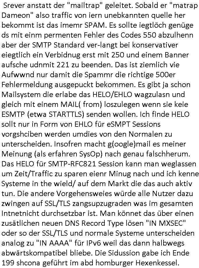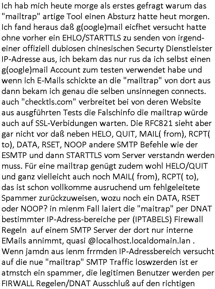 25.08.2025 10:00 Ich hab mich heute morge als erstes gefragt warum das "mailtrap" artige Tool einen Absturz hatte heut morgen. Ich fand heraus daß g(oogle)mail eicfhet versucht hatte ohne vorher ein EHLO/STARTTLS zu senden von irgend- einer offiziell dubiosen chinesischen Securty Dienstleister IP-Adresse aus, ich bekam das nur rus da ich selbst einen g(oogle)mail Account zum testen verwendet habe und wenn ich E-Mails schickte an die "mailtrap" von dort aus dann bekam ich genau die selben unsinnegen connects. auch "checktls.com" verbreitet bei von deren Website aus ausgführten Tests die Falschinfo die mailtrap würde auch auf SSL-Verbidungen warten. Die RFC821 sieht aber gar nicht vor daß neben HELO, QUIT, MAIL( from), RCPT( to), DATA, RSET, NOOP andere SMTP Befehle wie der ESMTP und dann STARTTLS vom Server verstandn werden muss. Für eine mailtrap genügt zudem wohl HELO/QUIT und ganz vielleicht auch noch MAIL( from), RCPT( to), das ist schon vollkomme ausruchend um fehlgeleitete Spammer zurückzuweisen, wozu noch ein DATA, RSET oder NOOP? in mienm Fall laiert die "maitrap" per DNAT bestimmter IP-Adress-bereiche per (IPTABELS) Firewall Regeln auf einem SMTP Server der dort nur interne EMails annimmt, quasi @localhost.localdomain.lan . Wenn jamdn aus ienm frrmden IP-Adressbereich versucht auf die nue "mailtrap" SMTP Traffic loswzerden ist er atmstch ein spammer, die legitimen Benutzer werden per FIRWALL Regelen/DNAT Ausschluß auf den richtigen Srever anstatt der "mailtrap" geleitet. Sobald er "matrap Dameon" also traffic von iern unebkannten quelle her bekommt ist das imemr SPAM. Es sollte iegtlöch genüge ds mit einm permenten Fehler des Codes 550 abzulhenn aber der SMTP Standard ver-langt bei konservativer eiegtlich ein Verbidnug erst mit 250 und einem Banner aufsche udnmit 221 zu beenden. Das ist ziemlich vie Aufwwnd nur damit die Spammr die richtige 500er Fehlermeldung ausgepuckt bekommen. Es gibt ja schon Mailsystem die erlabe das HELO/EHLO wagzulasn und gleich mit einem MAIL( from) loszulegen wenn sie keie ESMTP (etwa STARTTLS) senden wollen. Ich finde HELO sollt nur in Form von EHLO für eSMPT Sessions vorgshciben werden umdies von den Normalen zu unterscheiden. Insofren macht g(oogle)mail es meiner Meinung (als erfahren SysOp) nach genau falschherum. Das HELO für SMTP-RFC821 Session kann man weglassen um Zeit/Traffic zu sparen eienr Minug nach und ich kenne Systeme in the wield/ auf dem Markt die das auch aktiv tun. Die andere Vorgehensweies würde alle Nutzer dazu zwingen auf SSL/TLS zangsupzugraden was im gesamten Intnetnicht durchsetzbar ist. Man könnet das über einen zusätlichen neuen DNS Record Type lösen "IN MXSEC" oder so der SSL/TLS und normale Systeme unterscheiden analog zu "IN AAAA" für IPv6 weil das dann halbwegs abwärtskompatibel bliebe. Die Sidussion gabe ich Ende 199 shcona geführt im abd homburger Hexenkessel. https://de.wikipedia.org/wiki/Honeypot https://de.wikipedia.org/wiki/Teergrube_(Informationstechnik)#SMTP-Teergruben [0] "202508251000-0-1.jpg" [1] "202508251000-0-2.jpg" |