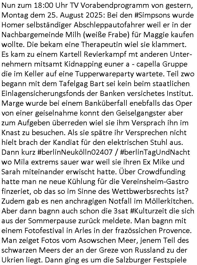 Nun zum 18:00 Uhr TV Vorabendprogramm von gestern, Montag dem 25. August 2025: Bei den #Simpsons wurde Homer selbständiger Abschleppautofahrer weil er in der Nachbargemeinde Milh (weiße Frabe) für Maggie kaufen wollte. Die bekam eine Therapeutin wiel sie klammert. Es kam zu einem Kartell Revierkampf mt anderen Unter-nehmern mitsamt Kidnapping euner a - capella Gruppe die im Keller auf eine Tupperwareparty wartete. Teil zwo begann mit dem Tafelgag Bart sei kein beim staatlichen Einlagensicherungsfonds der Banken versichetes Institut. Marge wurde bei einem Banküberfall enebfalls das Oper von einer geiselnahme konnt den Geiselgangster aber zum Aufgeben überreden wiel sie ihm Versprach ihn im Knast zu besuchen. Als sie spätre ihr Versprechen nicht hielt brach der Kandiat für den elektrischen Stuhl aus. Dann kurz #berlinNeukölln02407 / #berlinTagUndNacht wo Mila extrems sauer war weil sie ihren Ex Mike und Sarah miteinander erwischt hatte. Über Crowdfunding hatte man ne neue Kühlung für die Vereinsheim-Gastro finzeriet, ob das so im Sinne des Wettbwerbsrechts ist? Zudem gab es nen anchragigen Notfall im Möllerkitchen. Aber dann bagnn auch schon die 3sat #Kulturzeit die sich aus der Sommerpause zurück meldete. Man bagnn mit einem Fotofestival in Arles in der frazössichen Provence. Man zeiget Fotos vom Asowschen Meer, jenem Teil des schwarzen Meers der an der Greze von Russland zu der Ukrien liegt. Dann ging es um die Salzburger Festspiele