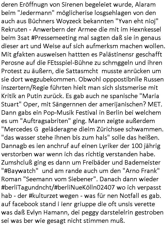 deren Eröffnugn von Sirenen begeleiet wurde, Alaram beim "Jedermann" möglicherise losgsehlagen von den auch aus Büchners Woyzeck bekannten "Yvan eht nioj" Rekruten - Anwerbern der Armee die mit im Hexnkessel beim 3sat #Pressemeeting mal sagten daß sie in genaus dieser art und Weise auf sich aufmerksm machen wollen. Mit gfakten ausweisen hattten es Palästinensr geschafft Perosne auf die FEtsspiel-Bühne zu schmggeln und ihren Protest zu äußern, die Sattasmcht musste anrücken um sie dort wegzubekommen. Obwohl opppostibnlle Russen inszertern/Regie führten hielt man sich slstsmerise mit Kritik an Putin zurück. Es gab auch ne spanische "Maria Stuart" Oper, mit Sängernnen der amerijanischen? MET. Dann gabs ein Pop-Musik Festival in Berlin bei welchem es um "Auftragsabriten" ging. Mann zeigte außerdem "Mercedes G geläderagne dieim Zürichsee schwammen. "das wasser stehe ihnen bis zum hals" solle das heißen. Dannagb es ien anchruf auf einen Lyriker der 100 jährig verstorben war wenn ich das richtig verstanden habe. Zumshcluß ging es dann um Freibäder und Bademeister "#Baywatch" und am rande auch um den "Arno Frank" Roman "Seemann vom Siebener". Danach dann wieder #berliTagundncht/#berliNueKölln02407 wo ich verpasst hab - der #kulturzet wegen - was für nen Notfall es gab. auf facebook stand i ienr griuppe die oft unsis verette was daß Evlyn Hamann, dei peggy darstelelrin gestroben sei was ber wie gesagt nicht stimmen muß.