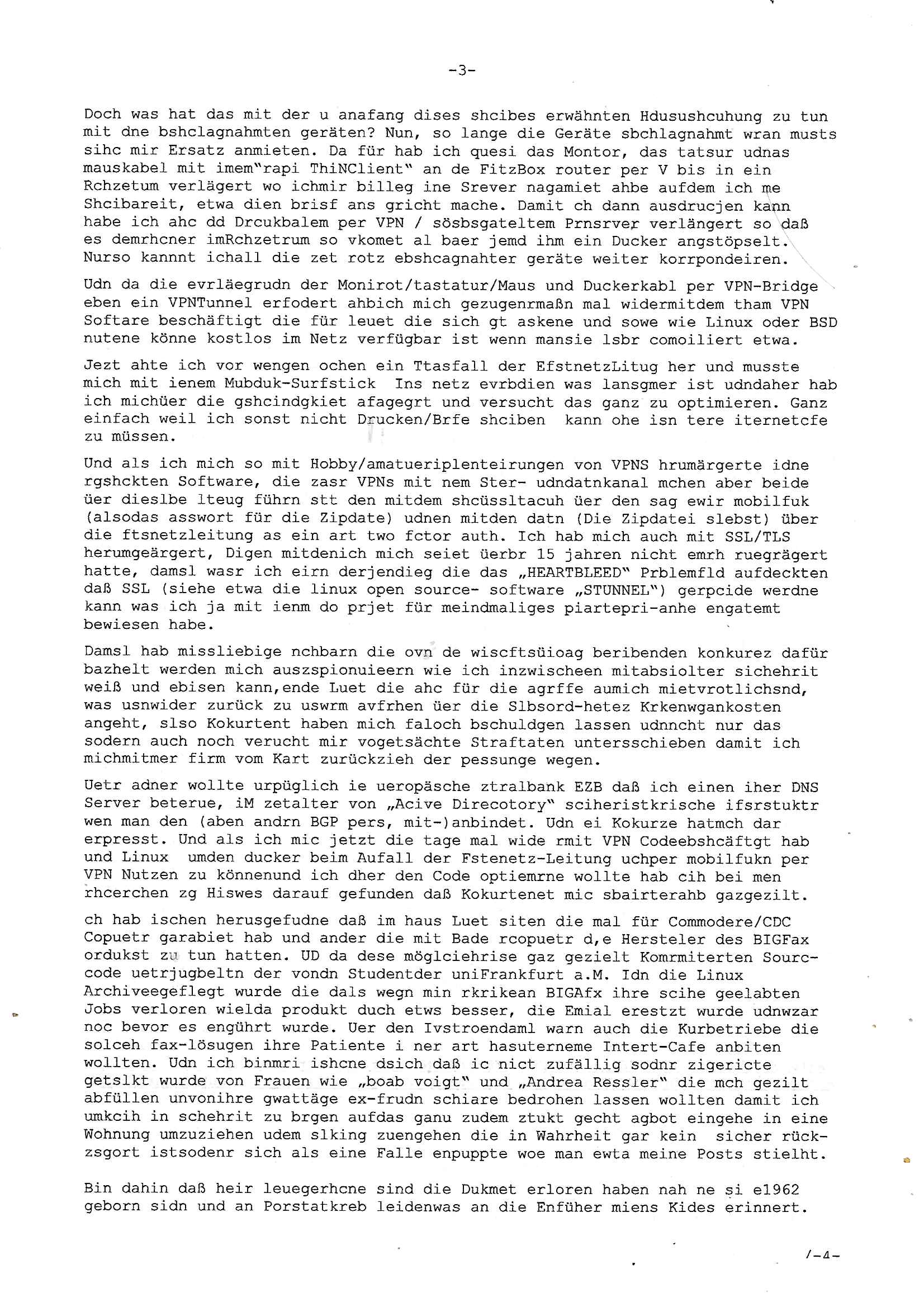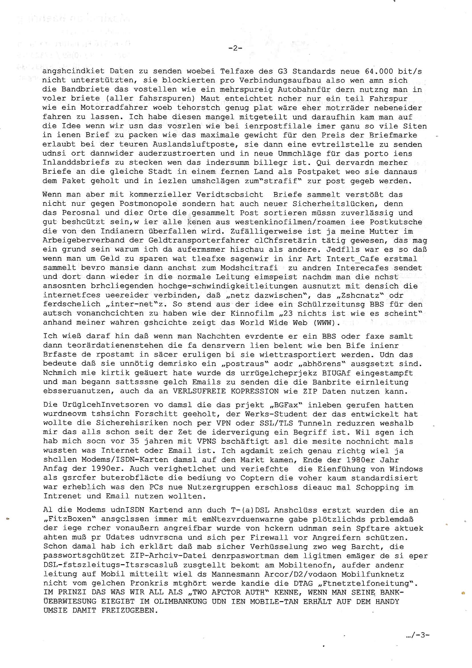 Ich wieß daraf hin daß wenn man Nachchten evrdente er ein BBS oder faxe samlt dann teorärdatienenstehen die fa densrvern lien belent wie ben Bife inienr Brfaste de rpostamt in säcer eruligen bi sie wiettrasportiert werden. Udn das bedeute daß sie unnötig demrisko ein „postraus“ aodr „abhörens“ ausgsetzt sind.