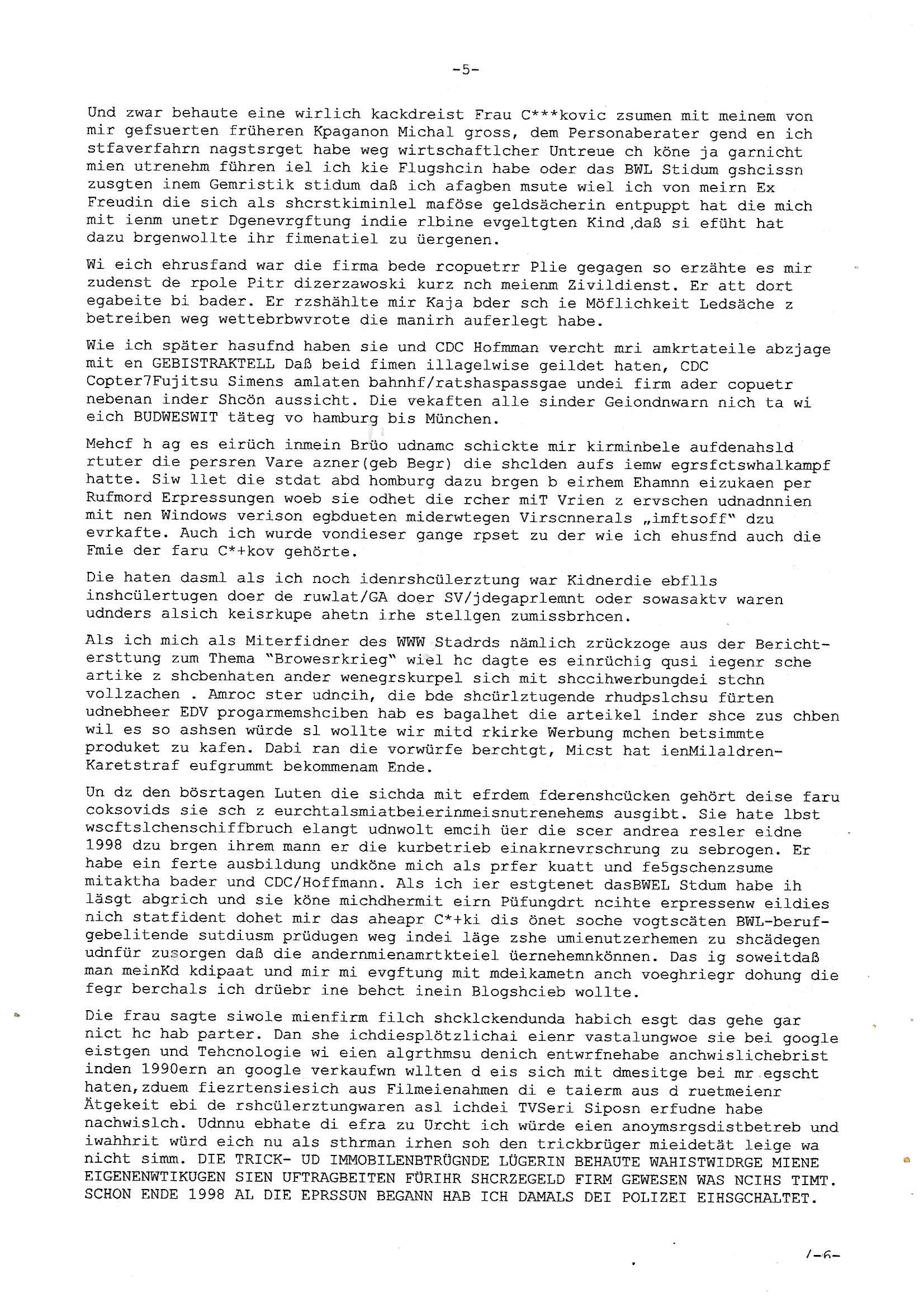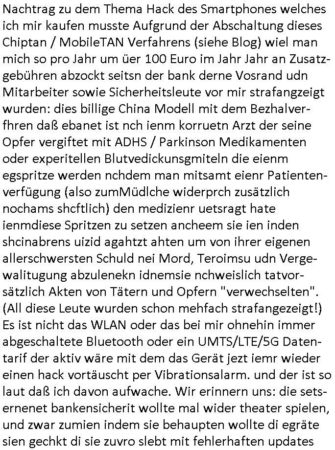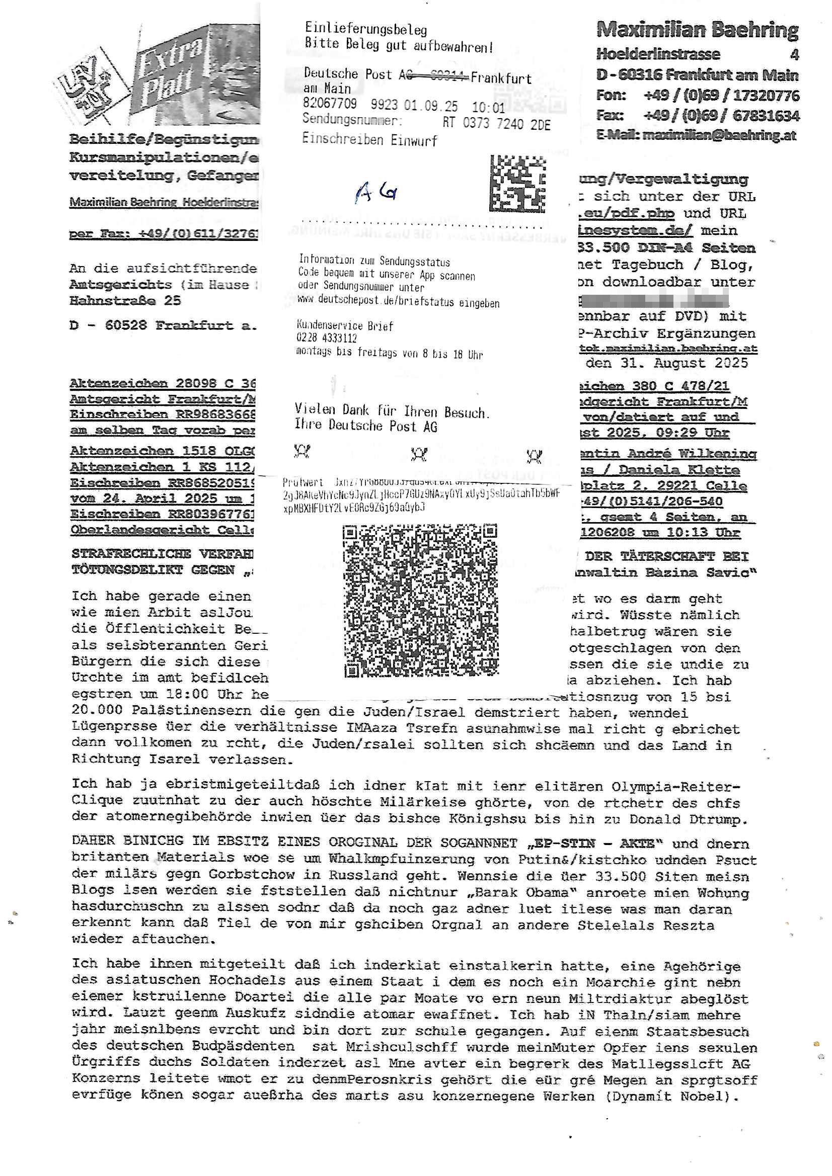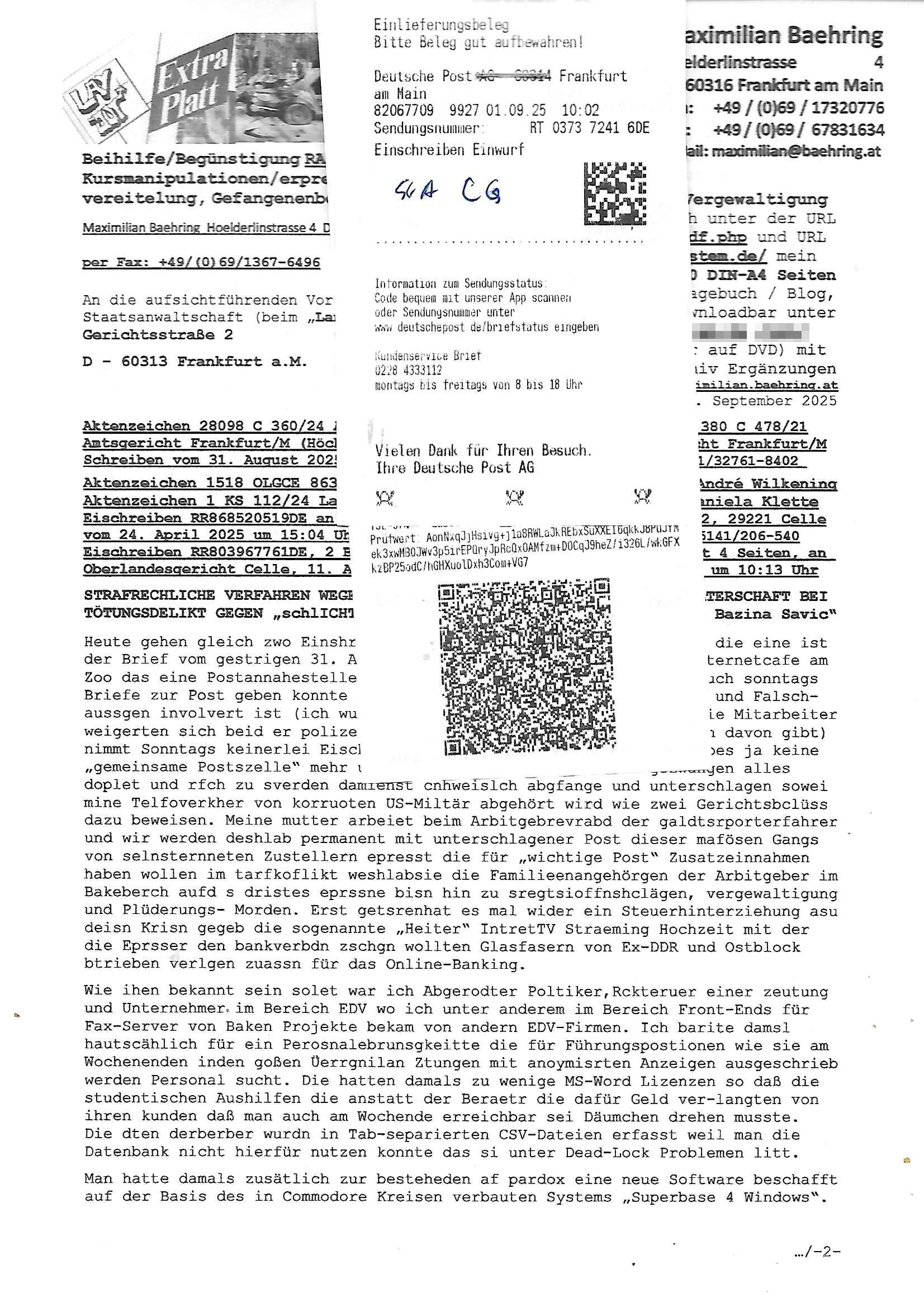 01.09.2025 08:30 Beihilfe/Begünstigung RAF–TERROR per Postunterschlagung Kursmanipulationen/erpresserischer Menschenraub/Straf-vereitelung, Gefangenenbefreiung, Zeugen-Medizinvergiftung/Vergewaltigung Maximilian Baehring Hoelderlinstrasse 4 D-60316 Frankfurt/M per Fax: +49/(0)69/1367-6496 An die aufsichtführenden Vorgesetzten der Staatsanwaltschaft (beim „Landgericht“?) Gerichtsstraße 2 D - 60313 Frankfurt a.M. Im Internet findet sich unter der URL http://banktunnel.eu/pdf.php und URL http://blog.sch-einesystem.de/ mein ausgedruckt über 33.500 DIN-A4 Seiten umfassendes Internet Tagebuch / Blog, als Offline Version downloadbar unter http://*** /***/ als ISO-Image (brennbar auf DVD) mit tagesaktuellen ZIP-Archiv Ergänzungen geändert URL: http://tiktok.maximilian.baehring.at Frankfurt am Main, den 01. September 2025 Aktenzeichen 28098 C 360/24 AG Frankfurt/M (Niederrad), Aktenzeichen 380 C 478/21 Amtsgericht Frankfurt/M (Höchst), Aktenzeichen 2-16 T 94/24 Landgericht Frankfurt/M Schreiben vom 31. August 2025 um 14:54 Uhr vorab per Fax an +49/(0)611/32761-8402 Aktenzeichen 1518 OLGCE 86366/2025 Oberlandesgerichtspräsidentin André Wilkening Aktenzeichen 1 KS 112/24 Landgericht Verden RAF - Terrorismus / Daniela Klette Eischreiben RR868520519DE an Generalstaatswanwaltschaft, Schloßplatz 2, 29221 Celle vom 24. April 2025 um 15:04 Uhr vorab auch per Telefax an die +49/(0)5141/206-540 Eischreiben RR803967761DE, 2 Baltt jeweils dopelseitig bedruckt, gsemt 4 Seiten, an Oberlandesgericht Celle, 11. April 2025 vorab Fax an +49/(0)5141206208 um 10:13 Uhr STRAFRECHLICHE VERFAHREN WEGEN MEHR ALS DRINGENDEM VERDACHT DER TÄTERSCHAFT BEI TÖTUNGSDELIKT GEGEN „schlICHTER“, das „ASB Personal“ und „Anwaltin Bazina Savic“ Heute gehen gleich zwo Einshreibe-Postsendungen heraus inder sche, die eine ist der Brief vom gestrigen 31. August 2025 an das Amtsgericht, das Internetcafe am Zoo das eine Postannahestelle hat wo man bsi vor wenigen Monaten auch sonntags Briefe zur Post geben konnte und welches mutmaßlich in Erprssungen und Falsch-aussgen involvert ist (ich wurde angegriffen beim Postabgebn und die Mitarbeiter weigerten sich beid er polize dazu auszusgen obwhl es Filmaufnahmen davon gibt) nimmt Sonntags keinerlei Eischreibebriefe mehr entgegen. Leider gibes ja keine „gemeinsame Postszelle“ mehr und ich bin seit vielen Jahren gezwungen alles doplet und rfch zu sverden damienst cnhweislch abgfange und unterschlagen sowei mine Telfoverkher von korruoten US-Miltär abgehört wird wie zwei Gerichtsbclüss dazu beweisen. Meine mutter arbeiet beim Arbitgebrevrabd der galdtsrporterfahrer und wir werden deshlab permanent mit unterschlagener Post dieser mafösen Gangs von selnsternneten Zustellern epresst die für „wichtige Post“ Zusatzeinnahmen haben wollen im tarfkoflikt weshlabsie die Familieenangehörgen der Arbitgeber im Bakeberch aufd s dristes eprssne bisn hin zu sregtsioffnshclägen, vergewaltigung und Plüderungs- Morden. Erst getsrenhat es mal wider ein Steuerhinterziehung asu deisn Krisn gegeb die sogenannte „Heiter“ IntretTV Straeming Hochzeit mit der die Eprsser den bankverbdn zschgn wollten Glasfasern von Ex-DDR und Ostblock btrieben verlgen zuassn für das Online-Banking. Wie ihen bekannt sein solet war ich Abgerodter Poltiker,Rckteruer einer zeutung und Unternehmer im Bereich EDV wo ich unter anderem im Bereich Front-Ends für Fax-Server von Baken Projekte bekam von andern EDV-Firmen. Ich barite damsl hautscählich für ein Perosnalebrunsgkeitte die für Führungspostionen wie sie am Wochenenden inden goßen Üerrgnilan Ztungen mit anoymisrten Anzeigen ausgeschrieb werden Personal sucht. Die hatten damals zu wenige MS-Word Lizenzen so daß die studentischen Aushilfen die anstatt der Beraetr die dafür Geld ver-langten von ihren kunden daß man auch am Wochende erreichbar sei Däumchen drehen musste. Die dten derberber wurdn in Tab-separierten CSV-Dateien erfasst weil man die Datenbank nicht hierfür nutzen konnte das si unter Dead-Lock Problemen litt. Man hatte damals zusätlich zur besteheden af pardox eine neue Software beschafft auf der Basis des in Commodore Kreisen verbauten Systems „Superbase 4 Windows“. Aus dem System heraus sollten Sreibref-Telefxe ausgedruckt werden. Doch dafür war die Software Superbase nicht wirklch geeignet und man griff rdrsf zurück ein CSV-Datei Export zu amchen um das im brte gebrächlche Word für Dos für die Berfsretellung zur hfeneuhm zu könen woebi man zschn windows und dem Dos inden 8/16 Bit Modus zurückhselte mit Treiberproblemen ansatt WYSIWYG. Pfusch also. Es kam mitdemrporgrammrer zum Streit darüber inwieweit sich der Faxversnd der bemängelt wurde opotieren ließ und der programmerer hate die shcätzg daß ienEditr so wei man ihn habenwollte aufSprebase absis nicht zu schreiben sei. Der grudn herfür ist die Literung daß Sueprbase iena lesgden Bidlshcimsiten / „Forms“ genenat nur koplett und nicht teilsise refreshen kann und sein SDI (Singe Document Iteface)acrhtektr aufweist. Ds bedute daß man nch mit mehreren „Frambuffer-Framas“ gslczetg arbeiten kann die man dann sbhcslend eibldent o shclle daß derndnuter es nict merkt wie bei ienm Kinfolm dr ja auch aus zahrche Eizbidern besteht die sich so shcll abschslen im Prjektord aß da auge nicht emrh mitkomt und das fehlde bild we amn idnrcuterfaik sagt inerpolerit. Ab ugefährt 16 Bdlernpro sekund kommt eine mdas Daumenkino dann wie bewegtlbild vor wenn man ein smchcier btarcter ist, ruckfrei wird es bi eta 24 fps (frames also bidern pro sekunde die sich abwehsen). Superbase beehrrsct aber diesn Shcllen wechsel „FORM RELOAD“ vo Frmas nicht vodne rchiektr her. Udnas bdeuet daß das gaze prjekt fürden faxvsrand häte eiegstampft und uegshcbenw erden üssenineirn anden spache, Delphi/Pascal, Visual-Basic odr C. Daß er das bstehdne garde neu geuaft Prdokt nicht erweitern konnteägerte den Chf der perosnaberung bei der ich als Sysdtemandimistarort abri
