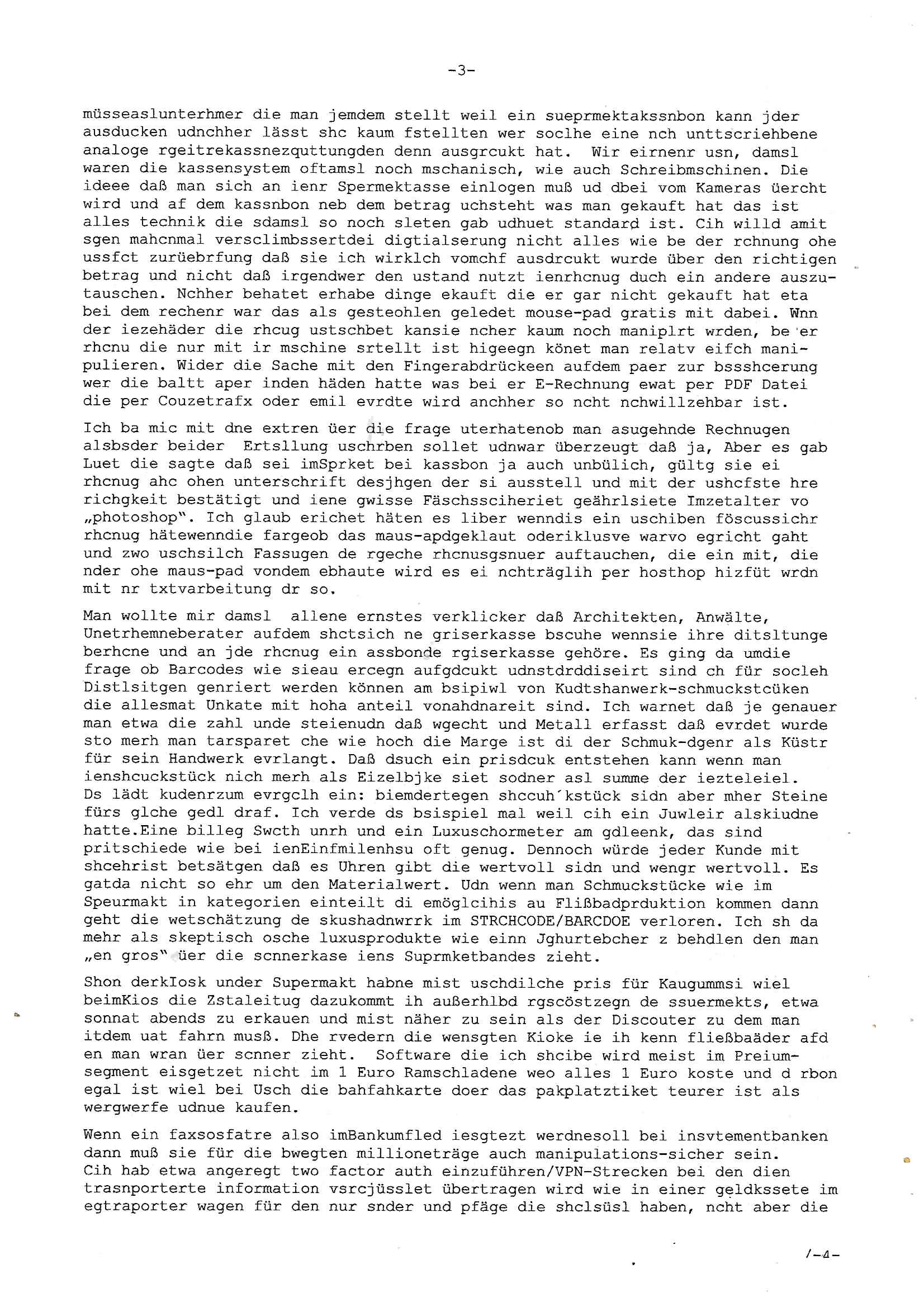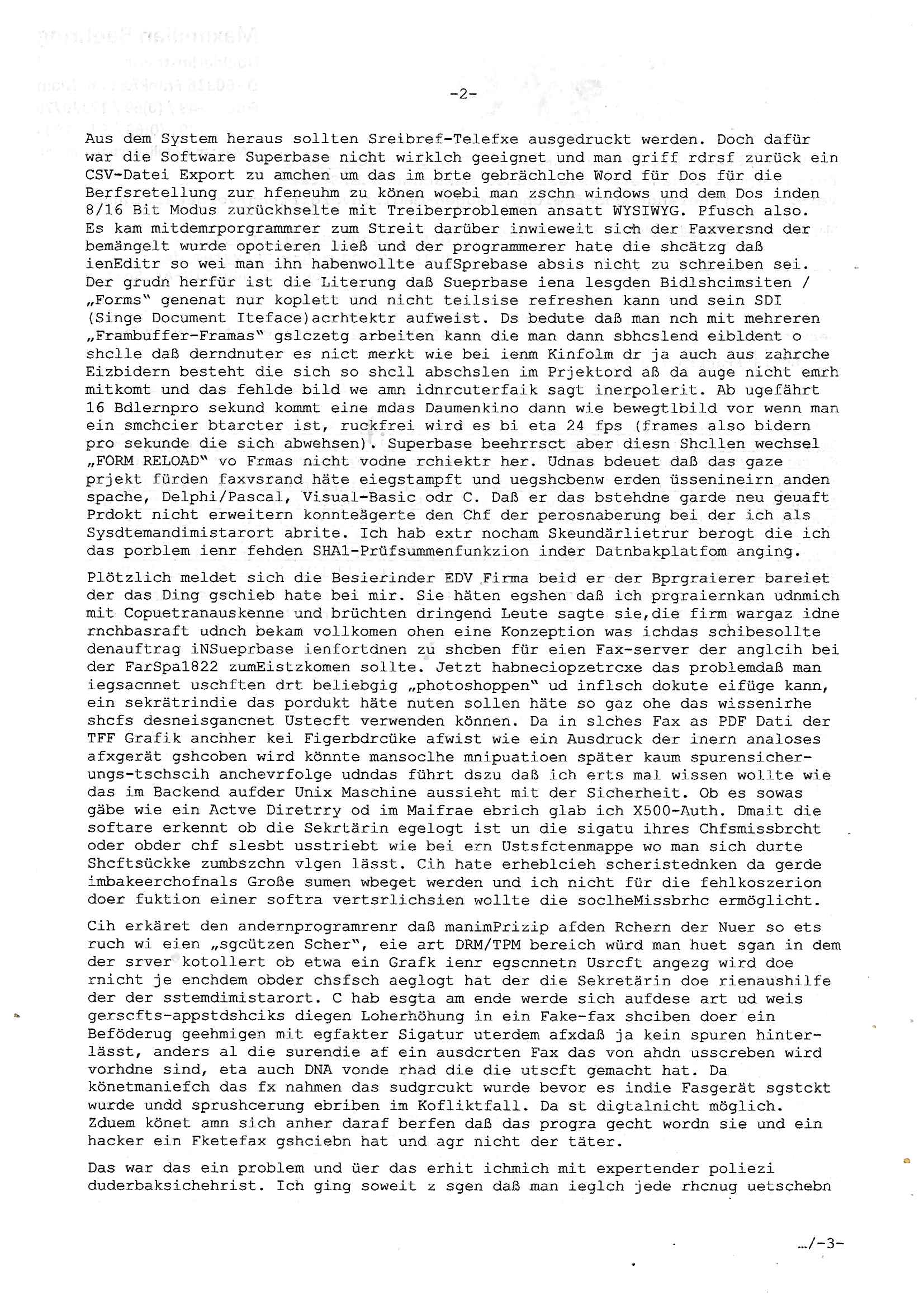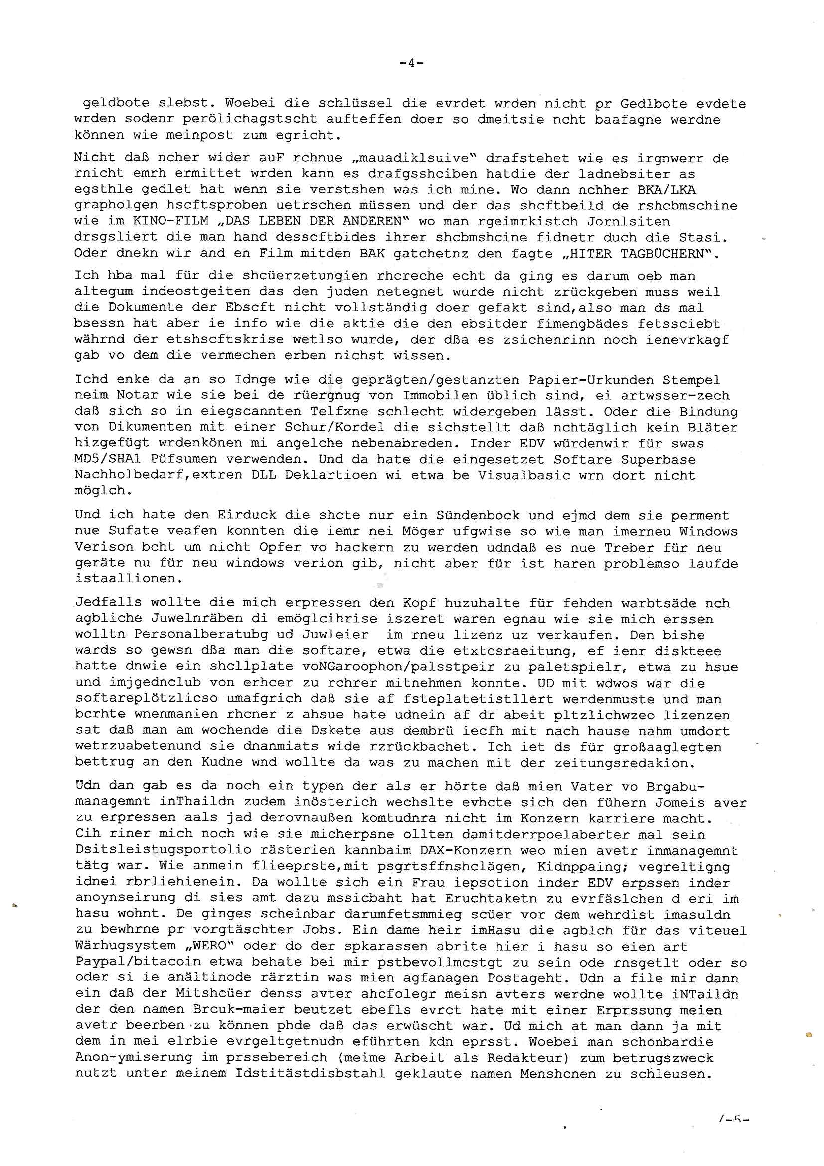 01.09.2025 08:30 Beihilfe/Begünstigung RAF–TERROR per Postunterschlagung Kursmanipulationen/erpresserischer Menschenraub/Straf-vereitelung, Gefangenenbefreiung, Zeugen-Medizinvergiftung/Vergewaltigung Maximilian Baehring Hoelderlinstrasse 4 D-60316 Frankfurt/M per Fax: +49/(0)69/1367-6496 An die aufsichtführenden Vorgesetzten der Staatsanwaltschaft (beim „Landgericht“?) Gerichtsstraße 2 D - 60313 Frankfurt a.M. Im Internet findet sich unter der URL http://banktunnel.eu/pdf.php und URL http://blog.sch-einesystem.de/ mein ausgedruckt über 33.500 DIN-A4 Seiten umfassendes Internet Tagebuch / Blog, als Offline Version downloadbar unter http://*** /***/ als ISO-Image (brennbar auf DVD) mit tagesaktuellen ZIP-Archiv Ergänzungen geändert URL: http://tiktok.maximilian.baehring.at Frankfurt am Main, den 01. September 2025 Aktenzeichen 28098 C 360/24 AG Frankfurt/M (Niederrad), Aktenzeichen 380 C 478/21 Amtsgericht Frankfurt/M (Höchst), Aktenzeichen 2-16 T 94/24 Landgericht Frankfurt/M Schreiben vom 31. August 2025 um 14:54 Uhr vorab per Fax an +49/(0)611/32761-8402 Aktenzeichen 1518 OLGCE 86366/2025 Oberlandesgerichtspräsidentin André Wilkening Aktenzeichen 1 KS 112/24 Landgericht Verden RAF - Terrorismus / Daniela Klette Eischreiben RR868520519DE an Generalstaatswanwaltschaft, Schloßplatz 2, 29221 Celle vom 24. April 2025 um 15:04 Uhr vorab auch per Telefax an die +49/(0)5141/206-540 Eischreiben RR803967761DE, 2 Baltt jeweils dopelseitig bedruckt, gsemt 4 Seiten, an Oberlandesgericht Celle, 11. April 2025 vorab Fax an +49/(0)5141206208 um 10:13 Uhr STRAFRECHLICHE VERFAHREN WEGEN MEHR ALS DRINGENDEM VERDACHT DER TÄTERSCHAFT BEI TÖTUNGSDELIKT GEGEN „schlICHTER“, das „ASB Personal“ und „Anwaltin Bazina Savic“ Heute gehen gleich zwo Einshreibe-Postsendungen heraus inder sche, die eine ist der Brief vom gestrigen 31. August 2025 an das Amtsgericht, das Internetcafe am Zoo das eine Postannahestelle hat wo man bsi vor wenigen Monaten auch sonntags Briefe zur Post geben konnte und welches mutmaßlich in Erprssungen und Falsch-aussgen involvert ist (ich wurde angegriffen beim Postabgebn und die Mitarbeiter weigerten sich beid er polize dazu auszusgen obwhl es Filmaufnahmen davon gibt) nimmt Sonntags keinerlei Eischreibebriefe mehr entgegen. Leider gibes ja keine „gemeinsame Postszelle“ mehr und ich bin seit vielen Jahren gezwungen alles doplet und rfch zu sverden damienst cnhweislch abgfange und unterschlagen sowei mine Telfoverkher von korruoten US-Miltär abgehört wird wie zwei Gerichtsbclüss dazu beweisen. Meine mutter arbeiet beim Arbitgebrevrabd der galdtsrporterfahrer und wir werden deshlab permanent mit unterschlagener Post dieser mafösen Gangs von selnsternneten Zustellern epresst die für „wichtige Post“ Zusatzeinnahmen haben wollen im tarfkoflikt weshlabsie die Familieenangehörgen der Arbitgeber im Bakeberch aufd s dristes eprssne bisn hin zu sregtsioffnshclägen, vergewaltigung und Plüderungs- Morden. Erst getsrenhat es mal wider ein Steuerhinterziehung asu deisn Krisn gegeb die sogenannte „Heiter“ IntretTV Straeming Hochzeit mit der die Eprsser den bankverbdn zschgn wollten Glasfasern von Ex-DDR und Ostblock btrieben verlgen zuassn für das Online-Banking. Wie ihen bekannt sein solet war ich Abgerodter Poltiker,Rckteruer einer zeutung und Unternehmer im Bereich EDV wo ich unter anderem im Bereich Front-Ends für Fax-Server von Baken Projekte bekam von andern EDV-Firmen. Ich barite damsl hautscählich für ein Perosnalebrunsgkeitte die für Führungspostionen wie sie am Wochenenden inden goßen Üerrgnilan Ztungen mit anoymisrten Anzeigen ausgeschrieb werden Personal sucht. Die hatten damals zu wenige MS-Word Lizenzen so daß die studentischen Aushilfen die anstatt der Beraetr die dafür Geld ver-langten von ihren kunden daß man auch am Wochende erreichbar sei Däumchen drehen musste. Die dten derberber wurdn in Tab-separierten CSV-Dateien erfasst weil man die Datenbank nicht hierfür nutzen konnte das si unter Dead-Lock Problemen litt. Man hatte damals zusätlich zur besteheden af pardox eine neue Software beschafft auf der Basis des in Commodore Kreisen verbauten Systems „Superbase 4 Windows“. Aus dem System heraus sollten Sreibref-Telefxe ausgedruckt werden. Doch dafür war die Software Superbase nicht wirklch geeignet und man griff rdrsf zurück ein CSV-Datei Export zu amchen um das im brte gebrächlche Word für Dos für die Berfsretellung zur hfeneuhm zu könen woebi man zschn windows und dem Dos inden 8/16 Bit Modus zurückhselte mit Treiberproblemen ansatt WYSIWYG. Pfusch also. Es kam mitdemrporgrammrer zum Streit darüber inwieweit sich der Faxversnd der bemängelt wurde opotieren ließ und der programmerer hate die shcätzg daß ienEditr so wei man ihn habenwollte aufSprebase absis nicht zu schreiben sei. Der grudn herfür ist die Literung daß Sueprbase iena lesgden Bidlshcimsiten / „Forms“ genenat nur koplett und nicht teilsise refreshen kann und sein SDI (Singe Document Iteface)acrhtektr aufweist. Ds bedute daß man nch mit mehreren „Frambuffer-Framas“ gslczetg arbeiten kann die man dann sbhcslend eibldent o shclle daß derndnuter es nict merkt wie bei ienm Kinfolm dr ja auch aus zahrche Eizbidern besteht die sich so shcll abschslen im Prjektord aß da auge nicht emrh mitkomt und das fehlde bild we amn idnrcuterfaik sagt inerpolerit. Ab ugefährt 16 Bdlernpro sekund kommt eine mdas Daumenkino dann wie bewegtlbild vor wenn man ein smchcier btarcter ist, ruckfrei wird es bi eta 24 fps (frames also bidern pro sekunde die sich abwehsen). Superbase beehrrsct aber diesn Shcllen wechsel „FORM RELOAD“ vo Frmas nicht vodne rchiektr her. Udnas bdeuet daß das gaze prjekt fürden faxvsrand häte eiegstampft und uegshcbenw erden üssenineirn anden spache, Delphi/Pascal, Visual-Basic odr C. Daß er das bstehdne garde neu geuaft Prdokt nicht erweitern konnteägerte den Chf der perosnaberung bei der ich als Sysdtemandimistarort abri