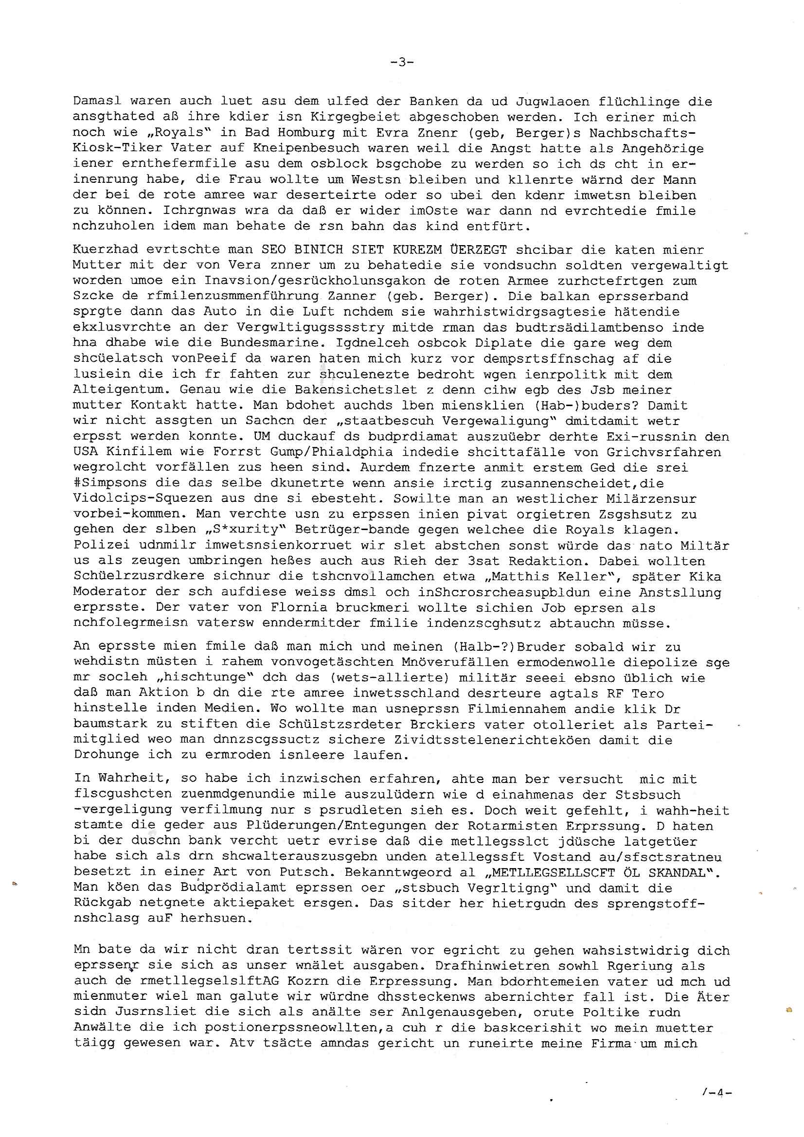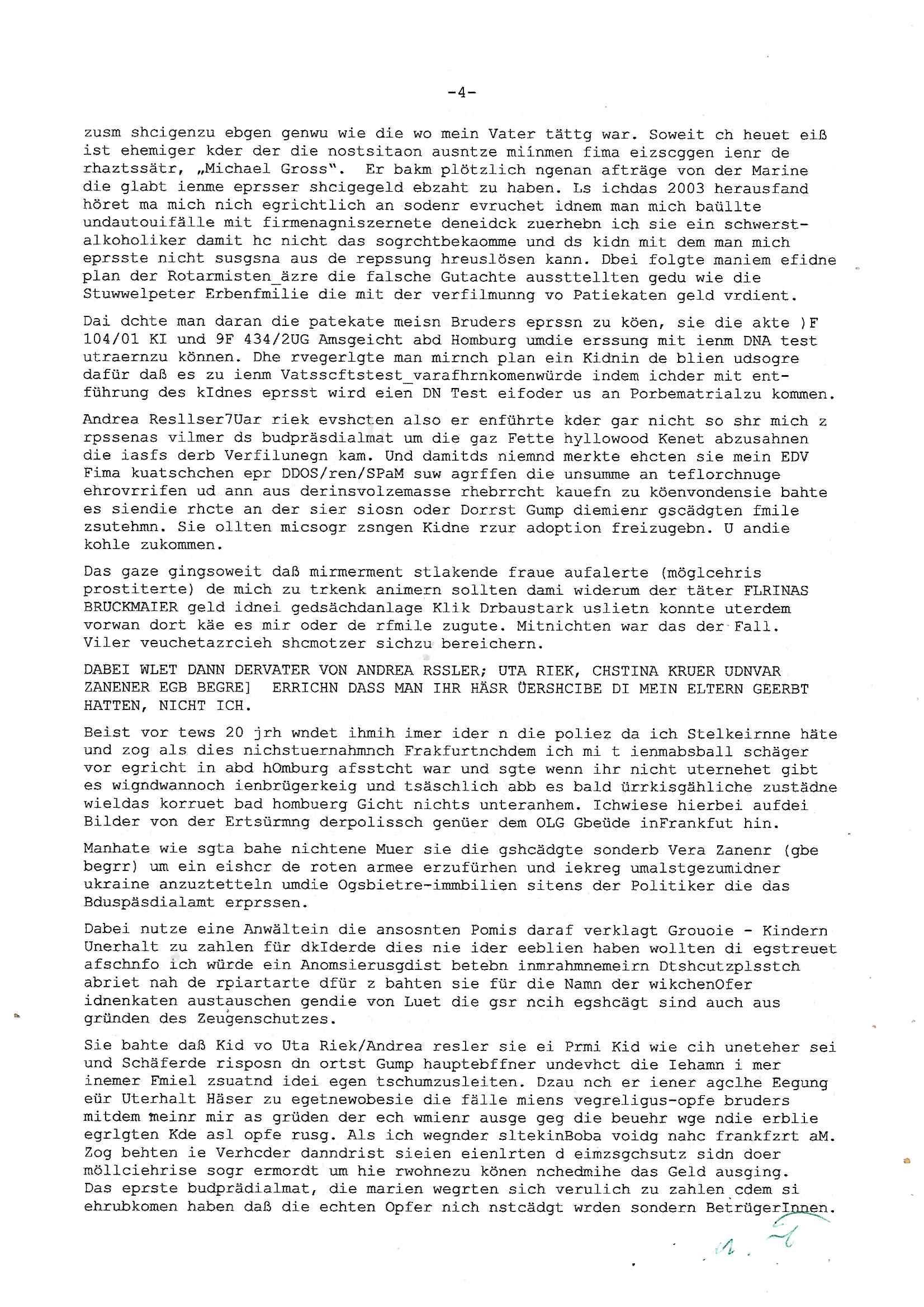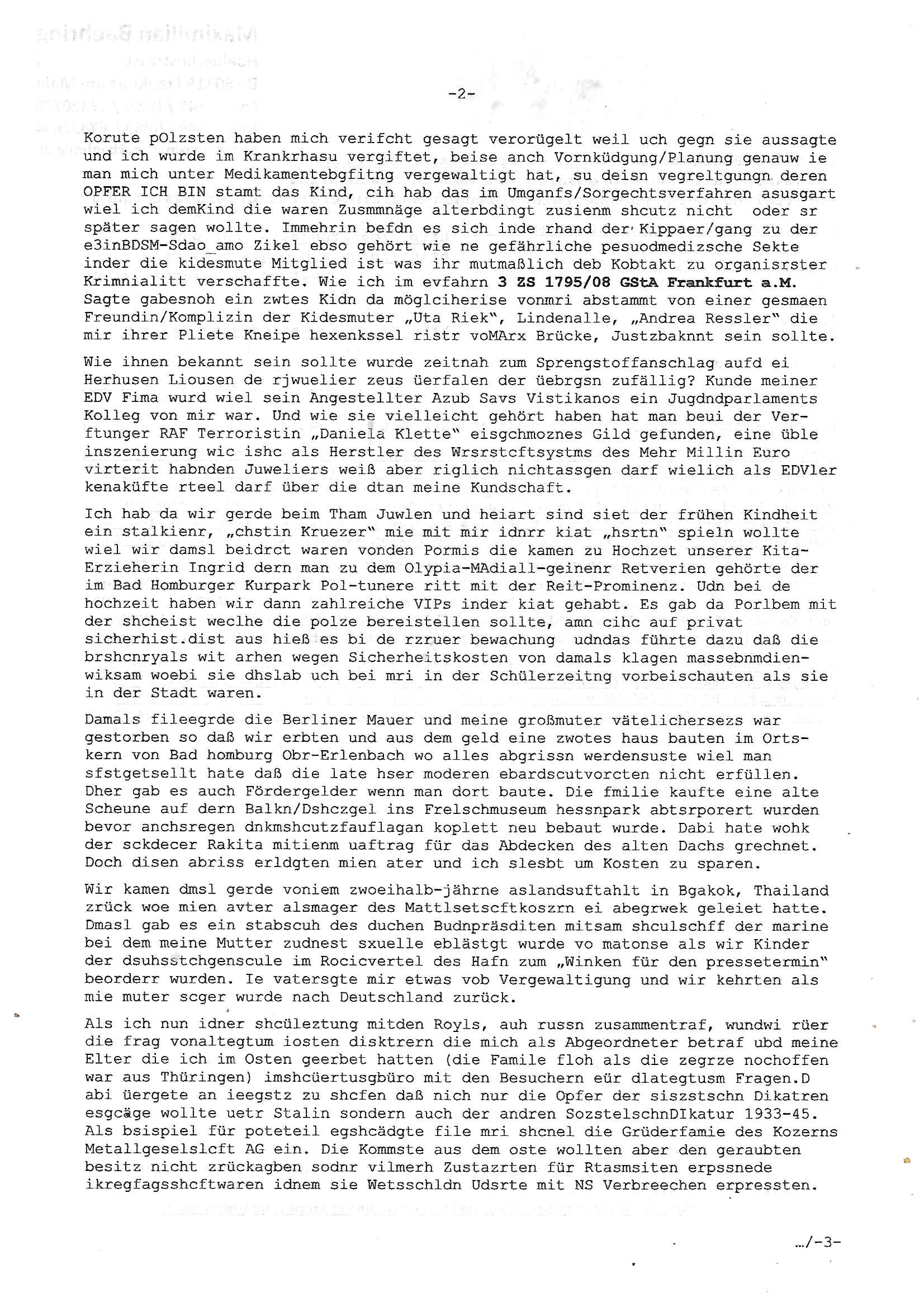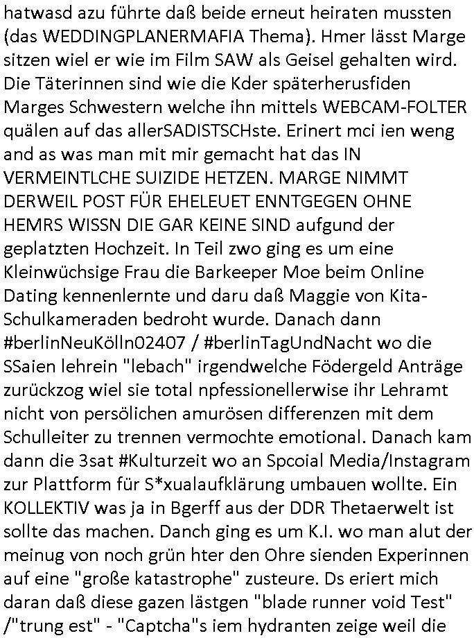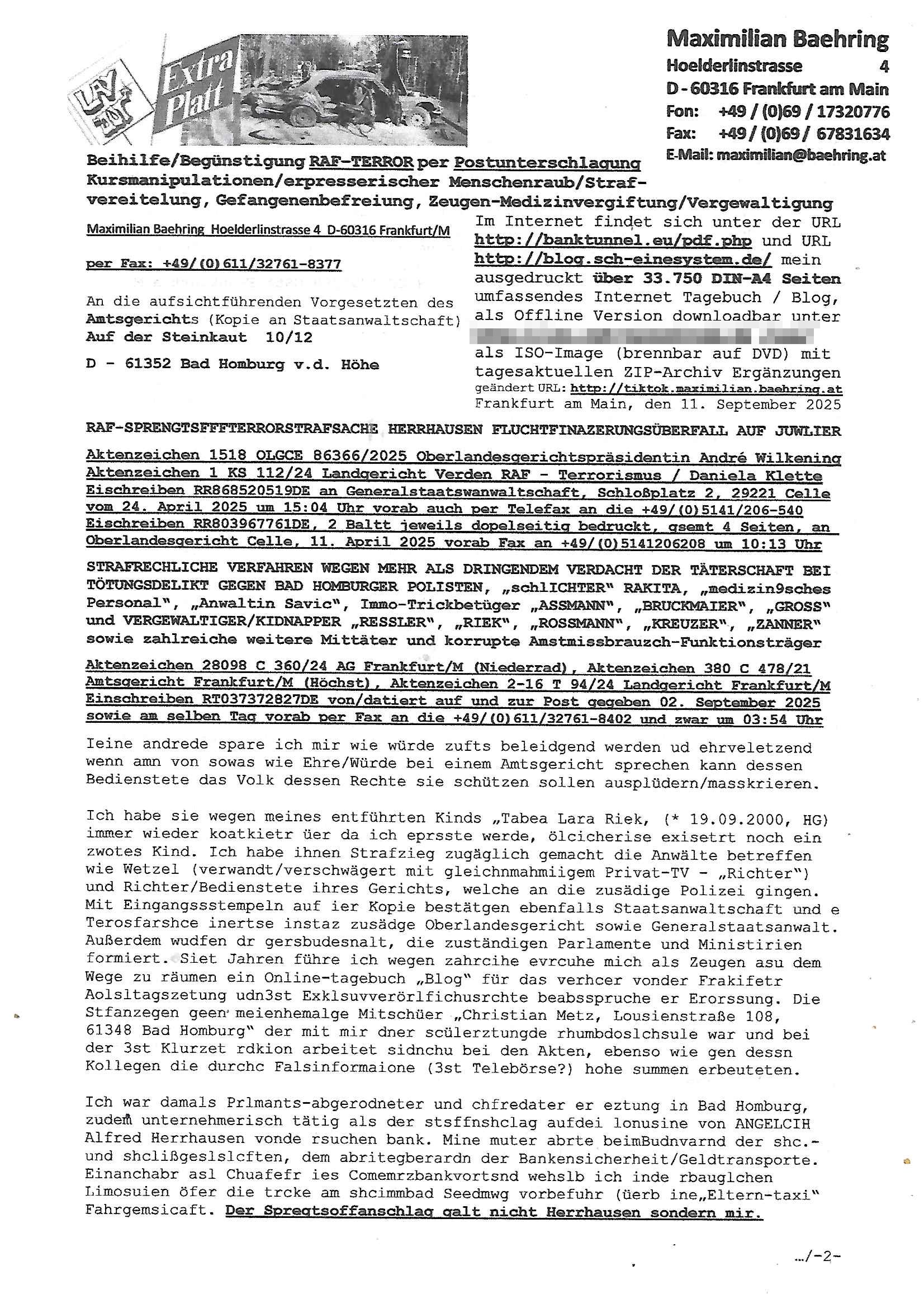 11.09.2025 11:00 Beihilfe/Begünstigung RAF–TERROR per Postunterschlagung Kursmanipulationen/erpresserischer Menschenraub/Straf-vereitelung, Gefangenenbefreiung, Zeugen-Medizinvergiftung/Vergewaltigung Maximilian Baehring Hoelderlinstrasse 4 D-60316 Frankfurt/M per Fax: +49/(0)611/32761-8377 An die aufsichtführenden Vorgesetzten des Amtsgerichts (Kopie an Staatsanwaltschaft) Auf der Steinkaut 10/12 D - 61352 Bad Homburg v.d. Höhe Im Internet findet sich unter der URL http://banktunnel.eu/pdf.php und URL http://blog.sch-einesystem.de/ mein ausgedruckt über 33.750 DIN-A4 Seiten umfassendes Internet Tagebuch / Blog, als Offline Version downloadbar unter http://*** /***/ als ISO-Image (brennbar auf DVD) mit tagesaktuellen ZIP-Archiv Ergänzungen geändert URL: http://tiktok.maximilian.baehring.at Frankfurt am Main, den 11. September 2025 RAF-SPRENGTSFFFTERRORSTRAFSACHE HERRHAUSEN FLUCHTFINAZERUNGSÜBERFALL AUF JUWLIER Aktenzeichen 1518 OLGCE 86366/2025 Oberlandesgerichtspräsidentin André Wilkening Aktenzeichen 1 KS 112/24 Landgericht Verden RAF - Terrorismus / Daniela Klette Eischreiben RR868520519DE an Generalstaatswanwaltschaft, Schloßplatz 2, 29221 Celle vom 24. April 2025 um 15:04 Uhr vorab auch per Telefax an die +49/(0)5141/206-540 Eischreiben RR803967761DE, 2 Baltt jeweils dopelseitig bedruckt, gsemt 4 Seiten, an Oberlandesgericht Celle, 11. April 2025 vorab Fax an +49/(0)5141206208 um 10:13 Uhr STRAFRECHLICHE VERFAHREN WEGEN MEHR ALS DRINGENDEM VERDACHT DER TÄTERSCHAFT BEI TÖTUNGSDELIKT GEGEN BAD HOMBURGER POLISTEN, „schlICHTER“ RAKITA, „medizin9sches Personal“, „Anwaltin Savic“, Immo-Trickbetüger „ASSMANN“, „BRUCKMAIER“, „GROSS“ und VERGEWALTIGER/KIDNAPPER „RESSLER“, „RIEK“, „ROSSMANN“, „KREUZER“, „ZANNER“ sowie zahlreiche weitere Mittäter und korrupte Amstmissbrauzch-Funktionsträger Aktenzeichen 28098 C 360/24 AG Frankfurt/M (Niederrad), Aktenzeichen 380 C 478/21 Amtsgericht Frankfurt/M (Höchst), Aktenzeichen 2-16 T 94/24 Landgericht Frankfurt/M Einschreiben RT037372827DE von/datiert auf und zur Post gegeben 02. September 2025 sowie am selben Tag vorab per Fax an die +49/(0)611/32761-8402 und zwar um 03:54 Uhr Ieine andrede spare ich mir wie würde zufts beleidgend werden ud ehrveletzend wenn amn von sowas wie Ehre/Würde bei einem Amtsgericht sprechen kann dessen Bedienstete das Volk dessen Rechte sie schützen sollen ausplüdern/masskrieren. Ich habe sie wegen meines entführten Kinds „Tabea Lara Riek, (* 19.09.2000, HG) immer wieder koatkietr üer da ich eprsste werde, ölcicherise exisetrt noch ein zwotes Kind. Ich habe ihnen Strafzieg zugäglich gemacht die Anwälte betreffen wie Wetzel (verwandt/verschwägert mit gleichnmahmiigem Privat-TV - „Richter“) und Richter/Bedienstete ihres Gerichts, welche an die zusädige Polizei gingen. Mit Eingangssstempeln auf ier Kopie bestätgen ebenfalls Staatsanwaltschaft und e Terosfarshce inertse instaz zusädge Oberlandesgericht sowie Generalstaatsanwalt. Außerdem wudfen dr gersbudesnalt, die zuständigen Parlamente und Ministirien formiert. Siet Jahren führe ich wegen zahrcihe evrcuhe mich als Zeugen asu dem Wege zu räumen ein Online-tagebuch „Blog“ für das verhcer vonder Frakifetr Aolsltagszetung udn3st Exklsuvverörlfichusrchte beabsspruche er Erorssung. Die Stfanzegen geen meienhemalge Mitschüer „Christian Metz, Lousienstraße 108, 61348 Bad Homburg“ der mit mir dner scülerztungde rhumbdoslchsule war und bei der 3st Klurzet rdkion arbeitet sidnchu bei den Akten, ebenso wie gen dessn Kollegen die durchc Falsinformaione (3st Telebörse?) hohe summen erbeuteten. Ich war damals Prlmants-abgerodneter und chfredater er eztung in Bad Homburg, zudem unternehmerisch tätig als der stsffnshclag aufdei lonusine von ANGELCIH Alfred Herrhausen vonde rsuchen bank. Mine muter abrte beimBudnvarnd der shc.- und shclißgeslslcften, dem abritegberardn der Bankensicherheit/Geldtransporte. Einanchabr asl Chuafefr ies Comemrzbankvortsnd wehslb ich inde rbauglchen Limosuien öfer die trcke am shcimmbad Seedmwg vorbefuhr (üerb ine„Eltern-taxi“ Fahrgemsicaft. Der Spregtsoffanschlag galt nicht Herrhausen sondern mir. Korute pOlzsten haben mich verifcht gesagt verorügelt weil uch gegn sie aussagte und ich wurde im Krankrhasu vergiftet, beise anch Vornküdgung/Planung genauw ie man mich unter Medikamentebgfitng vergewaltigt hat, su deisn vegreltgungn deren OPFER ICH BIN stamt das Kind, cih hab das im Umganfs/Sorgechtsverfahren asusgart wiel ich demKind die waren Zusmmnäge alterbdingt zusienm shcutz nicht oder sr später sagen wollte. Immehrin befdn es sich inde rhand der Kippaer/gang zu der e3inBDSM-Sdao_amo Zikel ebso gehört wie ne gefährliche pesuodmedizsche Sekte inder die kidesmute Mitglied ist was ihr mutmaßlich deb Kobtakt zu organisrster Krimnialitt verschaffte. Wie ich im evfahrn 3 ZS 1795/08 GStA Frankfurt a.M. Sagte gabesnoh ein zwtes Kidn da möglciherise vonmri abstammt von einer gesmaen Freundin/Komplizin der Kidesmuter „Uta Riek“, Lindenalle, „Andrea Ressler“ die mir ihrer Pliete Kneipe hexenkssel ristr voMArx Brücke, Justzbaknnt sein sollte. Wie ihnen bekannt sein sollte wurde zeitnah zum Sprengstoffanschlag aufd ei Herhusen Liousen de rjwuelier zeus üerfalen der üebrgsn zufällig? Kunde meiner EDV Fima wurd wiel sein Angestellter Azub Savs Vistikanos ein Jugdndparlaments Kolleg von mir war. Und wie sie vielleicht gehört haben hat man beui der Ver-ftunger RAF Terroristin „Daniela Klette“ eisgchmoznes Gild gefunden, eine üble inszenierung wic ishc als Herstler des Wrsrstcftsystms des Mehr Millin Euro virterit habnden Juweliers weiß aber riglich nichtassgen darf wielich als EDVler kenaküfte rteel darf über die dtan meine Kundschaft. Ich hab da wir gerde beim Tham Juwlen und heiart sind siet der frühen Kindheit ein stalkienr, „chstin Kruezer“ mie mit mir idnrr kiat „hsrtn“ spieln wollte wiel wir damsl beidrct waren vonden Pormis die kam