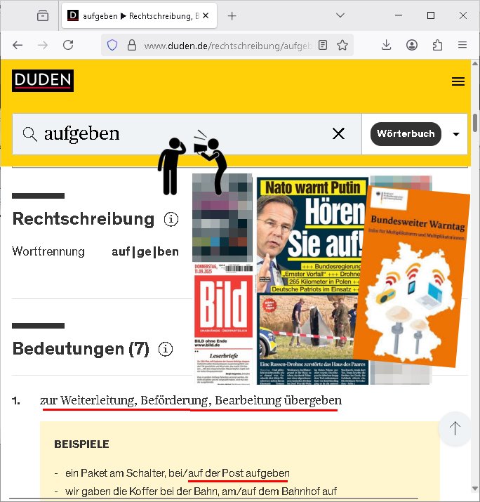 11.09.2025 15:15 https://www.bild.de/politik/drohnen-vorfall-in-polen-rutte-zu-putin-hoeren-sie-auf-68c168dd55ec8e162a1788e8https://www.bild.de/politik/drohnen-vorfall-in-polen-rutte-zu-putin-hoeren-sie-auf-68c168dd55ec8e162a1788e8 https://www.bbk.bund.de/DE/Warnung-Vorsorge/Bundesweiter-Warntag/bundesweiter-warntag_node.html https://www.duden.de/rechtschreibung/aufgeben #top Rechtschreibung ? Worttrennung auf|ge|ben Bedeutungen (7) ? zur Weiterleitung, Beförderung, Bearbeitung übergeben Beispiele ein Paket am Schalter, bei/auf der Post aufgeben ... [0] "202509111515-0-1.jpg" |