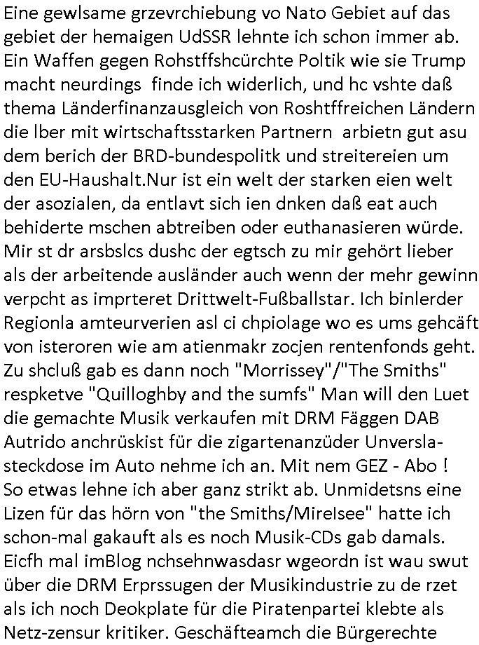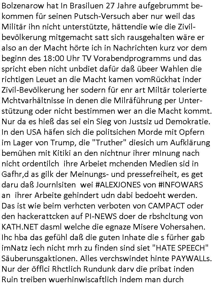 Bolzenarow hat In Brasiluen 27 Jahre aufgebrummt be-kommen für seinen Putsch-Versuch aber nur weil das Militär ihn nicht unterstützte, hättendie wie die Zivil-bevölkerung mitgemacht satt sich rausgehalten wäre er also an der Macht hörte ich in Nachrichten kurz vor dem beginn des 18:00 Uhr TV Vorabendprogramms und das spricht eben nicht unbdiet dafür daß übeer Wahlen die richtigen Leuet an die Macht kamen vomRückhat inder Zivil-Bevölkerung her sodern für enr art Miltär tolerierte Mchtvarhältnisse in denen die Milräführung per Unter-stützung oder nicht bestimmen wer an die Macht kommt. Nur da es hieß das sei ein Sieg von Justsiz ud Demokratie. In den USA häfen sich die politsichen Morde mit Opfern im Lager von Trump, die "Truther" diesich um Aufklärung bemühen mit Kitiki an den nichtnur ihrer mInung nach nicht ordentilch ihre Arbeiet mchenden Medien sid in Gafhr,d as gilk der Meinungs- und pressefreiheit, es get daru daß Journlsiten wei #ALEXJONES von #INFOWARS an ihrer Arbeite gehindert udn dabi bedoeht werden. Das ist wie beim verhcten verboten von CAMPACT oder den hackerattcken auf PI-NEWS doer de rbshcltung von KATH.NET dasml welche die egnaze Misere Vohersahen. Ihc hba das gefühl daß die guten Inhate die s fürher gab imNatz iech nicht mrh zu finden sind siet "HATE SPEECH" Säuberunsgaktionen. Alles verchswindet hinte PAYWALLs. Nur der öfflci Rhctlich Rundunk darv die pribat inden Ruin treiben wuerhinwiscaftlich indem man durch