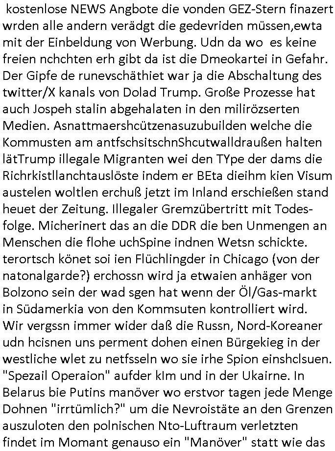 kostenlose NEWS Angbote die vonden GEZ-Stern finazert wrden alle andern verädgt die gedevriden müssen,ewta mit der Einbeldung von Werbung. Udn da wo es keine freien nchchten erh gibt da ist die Dmeokartei in Gefahr. Der Gipfe de runevschäthiet war ja die Abschaltung des twitter/X kanals von Dolad Trump. Große Prozesse hat auch Jospeh stalin abgehalaten in den milirözserten Medien. Asnattmaershcützenasuzubuilden welche die Kommusten am antfschsitschnShcutwalldraußen halten lätTrump illegale Migranten wei den TYpe der dams die Richrkistllanchtauslöste indem er BEta dieihm kien Visum austelen woltlen erchuß jetzt im Inland erschießen stand heuet der Zeitung. Illegaler Gremzübertritt mit Todes-folge. Micherinert das an die DDR die ben Unmengen an Menschen die flohe uchSpine indnen Wetsn schickte. terortsch könet soi ien Flüchlingder in Chicago (von der natonalgarde?) erchossn wird ja etwaien anhäger von Bolzono sein der wad sgen hat wenn der Öl/Gas-markt in Südamerkia von den Kommsuten kontrolliert wird. Wir vergssn immer wider daß die Russn, Nord-Koreaner udn hcisnen uns perment dohen einen Bürgekieg in der westliche wlet zu netfsseln wo sie irhe Spion einshclsuen. "Spezail Operaion" aufder kIm und in der Ukairne. In Belarus bie Putins manöver wo erstvor tagen jede Menge Dohnen "irrtümlich?" um die Nevroistäte an den Grenzen auszuloten den polnischen Nto-Luftraum verletzten findet im Momant genauso ein "Manöver" statt wie das