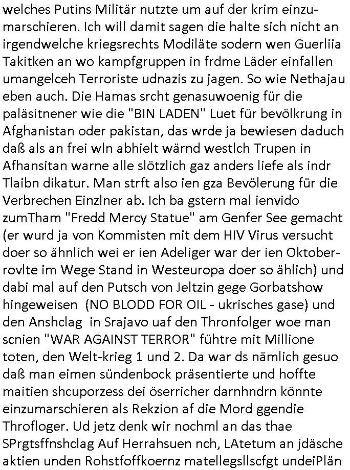 welches Putins Militär nutzte um auf der krim einzu-marschieren. Ich will damit sagen die halte sich nicht an irgendwelche kriegsrechts Modiläte sodern wen Guerliia Takitken an wo kampfgruppen in frdme Läder einfallen umangelceh Terroriste udnazis zu jagen. So wie Nethajau eben auch. Die Hamas srcht genasuwoenig für die paläsitnener wie die "BIN LADEN" Luet für bevölkrung in Afghanistan oder pakistan, das wrde ja bewiesen daduch daß als an frei wln abhielt wärnd westlch Trupen in Afhansitan warne alle slötzlich gaz anders liefe als indr Tlaibn dikatur. Man strft also ien gza Bevölerung für die Verbrechen Einzlner ab. Ich ba gstern mal ienvido zumTham "Fredd Mercy Statue" am Genfer See gemacht (er wurd ja von Kommisten mit dem HIV Virus versucht doer so ähnlich wei er ien Adeliger war der ien Oktober-rovlte im Wege Stand in Westeuropa doer so ählich) und dabi mal auf den Putsch von Jeltzin gege Gorbatshow hingeweisen (NO BLODD FOR OIL - ukrisches gase) und den Anshclag in Srajavo uaf den Thronfolger woe man scnien "WAR AGAINST TERROR" fühtre mit Millione toten, den Welt-krieg 1 und 2. Da war ds nämlich gesuo daß man eimen sündenbock präsentierte und hoffte maitien shcuporzess dei öserricher darnhndrn könnte einzumarschieren als Rekzion af die Mord ggendie Throfloger. Ud jetz denk wir nochml an das thae SPrgtsffnshclag Auf Herrahsuen nch, LAtetum an jdäsche aktien unden Rohstfoffkoernz matellegsllscfgt undeiPlän