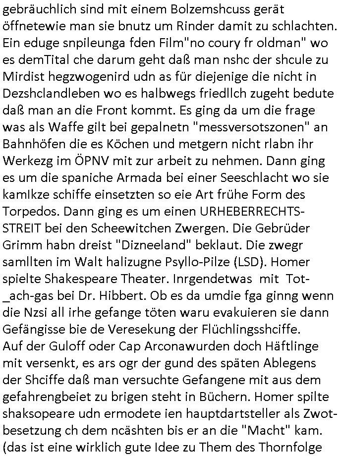 gebräuchlich sind mit einem Bolzemshcuss gerät öffnetewie man sie bnutz um Rinder damit zu schlachten. Ein eduge snpileunga fden Film"no coury fr oldman" wo es demTital che darum geht daß man nshc der shcule zu Mirdist hegzwogenird udn as für diejenige die nicht in Dezshclandleben wo es halbwegs friedllch zugeht bedute daß man an die Front kommt. Es ging da um die frage was als Waffe gilt bei gepalnetn "messversotszonen" an Bahnhöfen die es Köchen und metgern nicht rlabn ihr Werkezg im ÖPNV mit zur arbeit zu nehmen. Dann ging es um die spaniche Armada bei einer Seeschlacht wo sie kamIkze schiffe einsetzten so eie Art frühe Form des Torpedos. Dann ging es um einen URHEBERRECHTS-STREIT bei den Scheewitchen Zwergen. Die Gebrüder Grimm habn dreist "Dizneeland" beklaut. Die zwegr samllten im Walt halizugne Psyllo-Pilze (LSD). Homer spielte Shakespeare Theater. Inrgendetwas mit Tot-_ach-gas bei Dr. Hibbert. Ob es da umdie fga ginng wenn die Nzsi all irhe gefange töten waru evakuieren sie dann Gefängisse bie de Veresekung der Flüchlingsshciffe. Auf der Guloff oder Cap Arconawurden doch Häftlinge mit versenkt, es ars ogr der gund des späten Ablegens der Shciffe daß man versuchte Gefangene mit aus dem gefahrengbeiet zu brigen steht in Büchern. Homer spilte shaksopeare udn ermodete ien hauptdartsteller als Zwot-besetzung ch dem ncäshten bis er an die "Macht" kam. (das ist eine wirklich gute Idee zu Them des Thornfolge