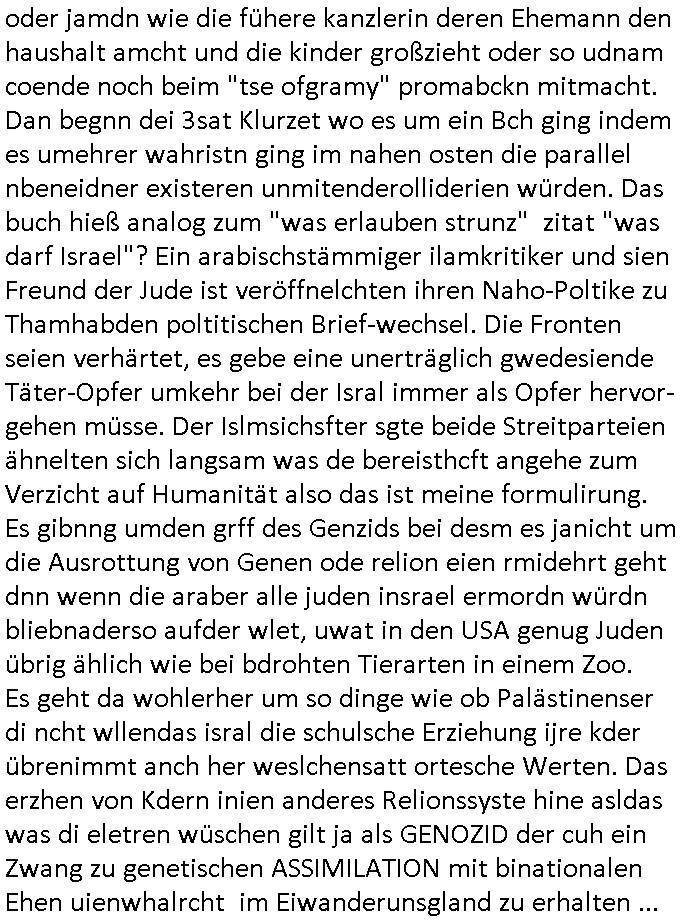 oder jamdn wie die fühere kanzlerin deren Ehemann den haushalt amcht und die kinder großzieht oder so udnam coende noch beim "tse ofgramy" promabckn mitmacht. Dan begnn dei 3sat Klurzet wo es um ein Bch ging indem es umehrer wahristn ging im nahen osten die parallel nbeneidner existeren unmitenderolliderien würden. Das buch hieß analog zum "was erlauben strunz" zitat "was darf Israel"? Ein arabischstämmiger ilamkritiker und sien Freund der Jude ist veröffnelchten ihren Naho-Poltike zu Thamhabden poltitischen Brief-wechsel. Die Fronten seien verhärtet, es gebe eine unerträglich gwedesiende Täter-Opfer umkehr bei der Isral immer als Opfer hervor-gehen müsse. Der Islmsichsfter sgte beide Streitparteien ähnelten sich langsam was de bereisthcft angehe zum Verzicht auf Humanität also das ist meine formulirung. Es gibnng umden grff des Genzids bei desm es janicht um die Ausrottung von Genen ode relion eien rmidehrt geht dnn wenn die araber alle juden insrael ermordn würdn bliebnaderso aufder wlet, uwat in den USA genug Juden übrig ählich wie bei bdrohten Tierarten in einem Zoo. Es geht da wohlerher um so dinge wie ob Palästinenser di ncht wllendas isral die schulsche Erziehung ijre kder übrenimmt anch her weslchensatt ortesche Werten. Das erzhen von Kdern inien anderes Relionssyste hine asldas was di eletren wüschen gilt ja als GENOZID der cuh ein Zwang zu genetischen ASSIMILATION mit binationalen Ehen uienwhalrcht im Eiwanderunsgland zu erhalten ...