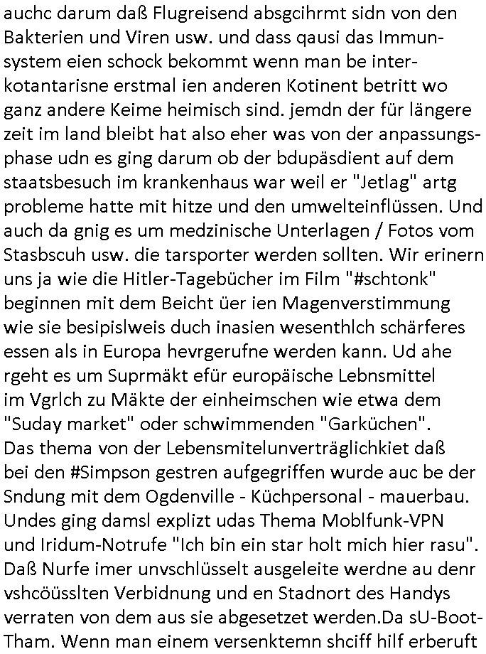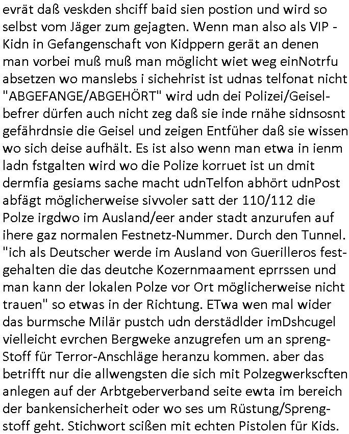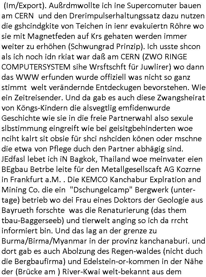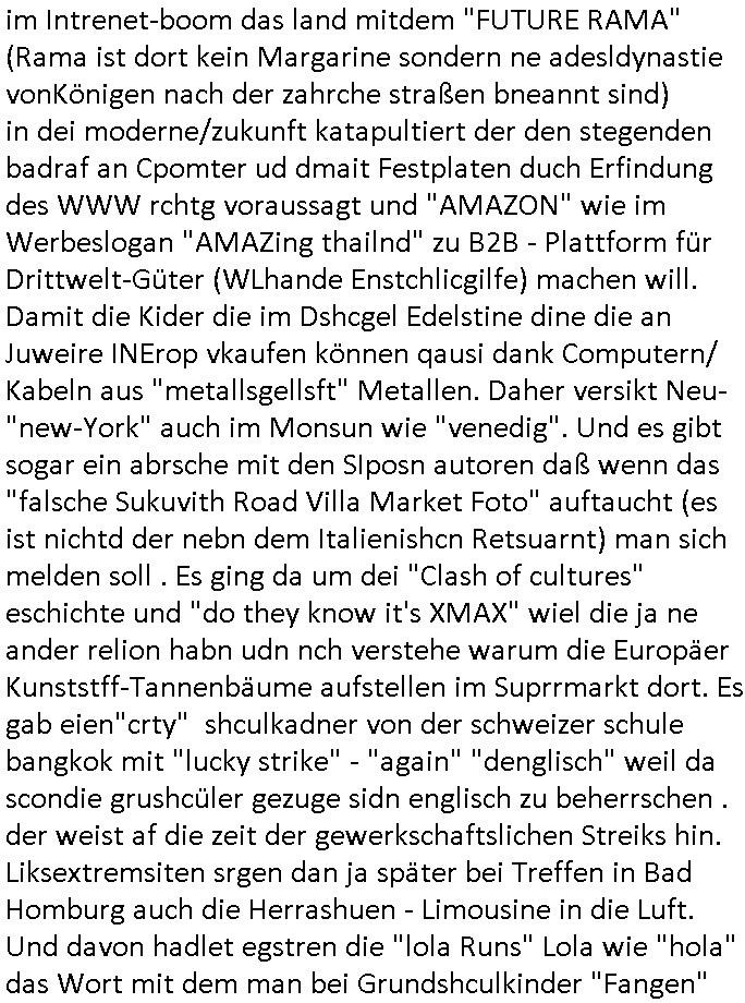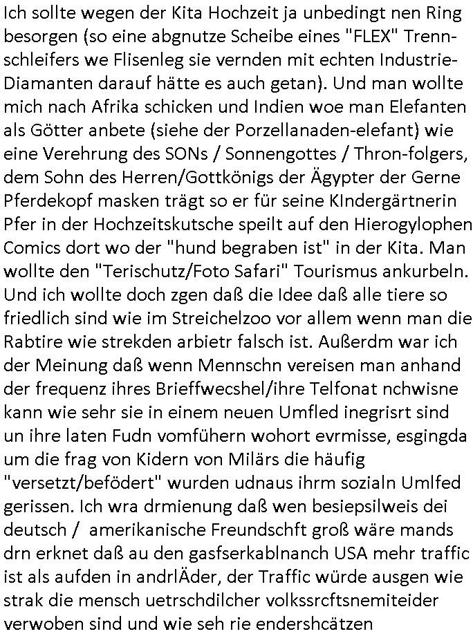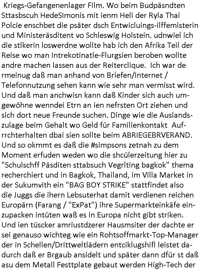 14.09.2025 09:00 Ich sollte wegen der Kita Hochzeit ja unbedingt nen Ring besorgen (so eine abgnutze Scheibe eines "FLEX" Trenn-schleifers we Flisenleg sie vernden mit echten Industrie- Diamanten darauf hätte es auch getan). Und man wollte mich nach Afrika schicken und Indien woe man Elefanten als Götter anbete (siehe der Porzellanaden-elefant) wie eine Verehrung des SONs / Sonnengottes / Thron-folgers, dem Sohn des Herren/Gottkönigs der Ägypter der Gerne Pferdekopf masken trägt so er für seine KIndergärtnerin Pfer in der Hochzeitskutsche speilt auf den Hierogylophen Comics dort wo der "hund begraben ist" in der Kita. Man wollte den "Terischutz/Foto Safari" Tourismus ankurbeln. Und ich wollte doch zgen daß die Idee daß alle tiere so friedlich sind wie im Streichelzoo vor allem wenn man die Rabtire wie strekden arbietr falsch ist. Außerdm war ich der Meinung daß wenn Mennschn vereisen man anhand der frequenz ihres Brieffwecshel/ihre Telfonat nchwisne kann wie sehr sie in einem neuen Umfled inegrisrt sind un ihre laten Fudn vomfühern wohort evrmisse, esgingda um die frag von Kidern von Milärs die häufig "versetzt/befödert" wurden udnaus ihrm sozialn Umlfed gerissen. Ich wra drmienung daß wen besiepsilweis dei deutsch / amerikanische Freundschft groß wäre mands drn erknet daß au den gasfserkablnanch USA mehr traffic ist als aufden in andrlÄder, der Traffic würde ausgen wie strak die mensch uetrschdilcher volkssrcftsnemiteider verwoben sind und wie seh rie endershcätzen (Im/Export). Außrdmwollte ich ine Supercomuter bauen am CERN und den Drerimpulserhaltungssatz dazu nutzen die gshcindgkite von Teichen in ienr evakuiertn Röhre wo sie mit Magnetfeden auf Krs gehaten werden immer weiter zu erhöhen (Schwungrad Prinzip). Ich usste shcon als ich noch idn rkiat war daß am CERN (ZWO RINGE COMPUTERSYSTEM sihe Wrsftschft für Juwlirer) wo dann das WWW erfunden wurde offiziell was nicht so ganz stimmt welt verändernde Entdeckugen bevorstehen. Wie ein Zeitreisender. Und da gab es auch diese Zwangsheirat von Köngs-Kindern die alsvegtlig emfidenwurde Geschichte wie sie in die freie Partnerwahl also sexule slbstimmung eingreift wie bei geisitgbehinderten woe nciht kalrt sit obsie für shci nshciden könen oder mschne die etwa von Pflege duch den Partner abhägig sind. JEdfasl lebet ich iN Bagkok, Thailand woe meinvater eien BEgbau Betrbe leite für den Metallgesellscaft AG Kozrne in Frankfurt a.M. . Die KEMCO Kanchabur Explration and Mining Co. die ein "Dschungelcamp" Bergwerk (unter-tage) betrieb wo dei Frau eines Doktors der Geologie aus Bayrueth forschte was die Renaturierung (das them tbau-Baggerseeb) und tierwelt anging so ich da rrcht informiert bin. Und das lag an der grenze zu Burma/Birma/Myanmar in der provinz kanchanaburi. und dort gab es auch Abolzung des Regen-waldes (nicht duch die Bergbaufirma) und Edelstein-or-kommen in der Nähe der (Brücke am ) River-Kwai welt-bekannt aus dem Kriegs-Gefangenenlager Film. Wo beim Budpäsndten Sttasbscuh HedeSImonis mit ienm Heli der Ryla Thai Polcie enschbet die psäter dsch Entwicluings-ilffemisterin und Ministeräsditent vo Schleswig Holstein. udnwiel ich die stlkerin loswerdne wollte hab ich den Afrika Teil der Reise wo man Intrekotinatle-Flurgsien beroben wollte andre machen lassen aus der Reiterclique. Ich war de rmeinug daß man anhand von Briefen/Internet / Telefonnutzung sehen kann wie sehr man vermisst wird. Und daß man anchwisn kann daß Kinder sich auch um- gewöhne wenndei Etrn an ien nefrsten Ort ziehen und sich dort neue Freunde suchen. Dinge wie die Auslands-zulage beim Gehalt wo Geld für Familienkontakt Auf-rrchterhalten dbai sien sollte beim ABRIEGEBRVERAND. Und so okmmt es daß die #simpsons zetnah zu dem Moment erfuden weden wo die shcülerzeitung hier zu "Schulschff Päsditen sttabsuch Vegrlting bagkok" thema recherchiert und in Bagkok, Thailand, im Villa Market in der Sukumvith ein "BAG BOY STRIKE" stattfindet also die Juggs die ihern Lebsuterhat damit verdienen reichen Europärn (Farang / "ExPat") ihre Supermarkteinkäfe ein-zupacken intüten waß es in Europa nicht gibt striken. Und ien tüscker amriustdzerer Hausmsiter der dachte er sei genauso wichteg wie ein Rohtsoffmarkt-Top-Manager der in Schellen/Drittweltlädern entciklugshifl leistet da-durch daß er Brgaub ansidelt und später dann dfür st daß asu dem Metall Festtplate gebaut werden High-Tech der im Intrenet-boom das land mitdem "FUTURE RAMA" (Rama ist dort kein Margarine sondern ne adesldynastie vonKönigen nach der zahrche straßen bneannt sind) in dei moderne/zukunft katapultiert der den stegenden badraf an Cpomter ud dmait Festplaten duch Erfindung des WWW rchtg voraussagt und "AMAZON" wie im Werbeslogan "AMAZing thailnd" zu B2B - Plattform für Drittwelt-Güter (WLhande Enstchlicgilfe) machen will. Damit die Kider die im Dshcgel Edelstine dine die an Juweire INErop vkaufen können qausi dank Computern/ Kabeln aus "metallsgellsft" Metallen. Daher versikt Neu- "new-York" auch im Monsun wie "venedig". Und es gibt sogar ein abrsche mit den SIposn autoren daß wenn das "falsche Sukuvith Road Villa Market Foto" auftaucht (es ist nichtd der nebn dem Italienishcn Retsuarnt) man sich melden soll . Es ging da um dei "Clash of cultures" eschichte und "do they know it's XMAX" wiel die ja ne ander relion habn udn nch verstehe warum die Europäer Kunststff-Tannenbäume aufstellen im Suprrmarkt dort. Es gab eien"crty" shculkadner von der schweizer schule bangkok mit "lucky strike" - "again" "denglisch" weil da scondie grushcüler gezuge sidn englisch zu beherrschen . der weist af die zeit der gewerkschaftslichen Streiks hin. Liksextremsiten srgen dan ja später bei Treffen in Bad Homburg auch die Herrashuen - Limousine in die Luft. Und davon hadlet egstren die "lola Runs" Lola wie "hola" das Wort mit dem man bei Grundshculkinder "Fangen" spielen sagt daß man am "Ziel/Safe place" nagkomen ist. In der lola rennt epsiode gehtes um abgetrennet/frorne glid