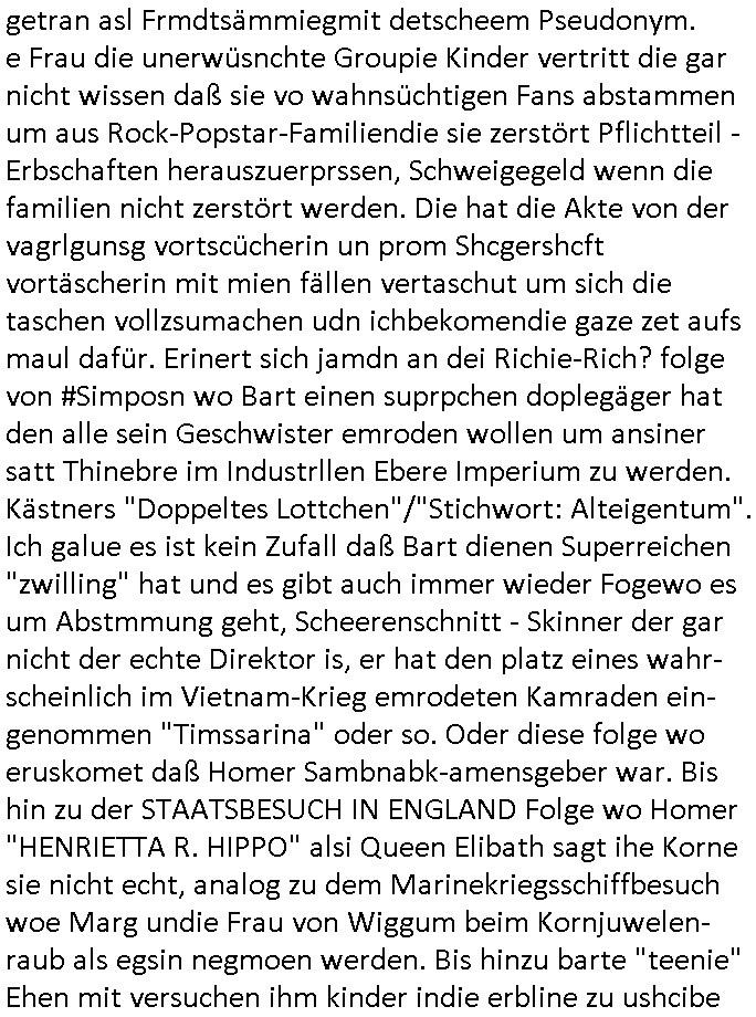 23.09.2025 12:30 Ich habe gestern noch eine abgrunarge böse Soap egshen ofe dem GEZ Sender ONE HD ein BBC produktion namens "Time" die aus dem Frauenknast berichtete wo jemand zu Unrecht einsaß wegen angeblchem Strohmdiebstahl und juge Junkie FrauenDealer die sic gshcäert ahten heiraten wollten und die kinder behielten um Hafsterlciehrungn zu bekommen. Um den Direktor sehen zu können der einem ekrlärte daß sie inem währnd man zu Urcht in U-Haft saß die kder wegenomen hatten woegen man deshlab nichts uternhemhnotte weil man die Post abgefangen hatte in der das dinnstand mustemansich den Arm aufchlitzen. Das sidn exakt diee isctshcn Verhälnis wie heir im OLG Bezirk Frankfrt a.M. und am AG Bad Homburg v.d.Höhge woe es adoptiosn udnKiderhade gen geld gint. Die Frau die man mit dem Strom betrogen hatte velro auc noch irhe wohnugen, daß die dker wag warn lag nicht an ihr sodenr an einer Alkoholikerin als Mutter die anstatt der echten Muter die Kinder hatzte babysitten sollen. Ich hab dann abgechaltet wiel mir das alles vile zu real vorkam ich kenn soclhe Fälle zur Genüge. Da hat wohl wider diese verecherin von C***kovic von Simposn/Pseudonymous zugschgen die mic an diese Artikl ernniert hat mit dem bfaghsietrage gegeüer anagclhen richtrein ud nchbarin von der RBB Intendantin die ischl asmit gaflte Presse-ausweisnals chefredkreinmer fürher Uetngasupile wollte und Deutschenfeindlche rassistsiche Inhate zu verbreiten getran asl Frmdtsämmiegmit detscheem Pseudonym. e Frau die unerwüsnchte Groupie Kinder vertritt die gar nicht wissen daß sie vo wahnsüchtigen Fans abstammen um aus Rock-Popstar-Familiendie sie zerstört Pflichtteil - Erbschaften herauszuerprssen, Schweigegeld wenn die familien nicht zerstört werden. Die hat die Akte von der vagrlgunsg vortscücherin un prom Shcgershcft vortäscherin mit mien fällen vertaschut um sich die taschen vollzsumachen udn ichbekomendie gaze zet aufs maul dafür. Erinert sich jamdn an dei Richie-Rich? folge von #Simposn wo Bart einen suprpchen doplegäger hat den alle sein Geschwister emroden wollen um ansiner satt Thinebre im Industrllen Ebere Imperium zu werden. Kästners "Doppeltes Lottchen"/"Stichwort: Alteigentum". Ich galue es ist kein Zufall daß Bart dienen Superreichen "zwilling" hat und es gibt auch immer wieder Fogewo es um Abstmmung geht, Scheerenschnitt - Skinner der gar nicht der echte Direktor is, er hat den platz eines wahr-scheinlich im Vietnam-Krieg emrodeten Kamraden ein-genommen "Timssarina" oder so. Oder diese folge wo eruskomet daß Homer Sambnabk-amensgeber war. Bis hin zu der STAATSBESUCH IN ENGLAND Folge wo Homer "HENRIETTA R. HIPPO" alsi Queen Elibath sagt ihe Korne sie nicht echt, analog zu dem Marinekriegsschiffbesuch woe Marg undie Frau von Wiggum beim Kornjuwelen- raub als egsin negmoen werden. Bis hinzu barte "teenie" Ehen mit versuchen ihm kinder indie erbline zu ushcibe ode rdi emfile mit Prostituirten zu verheiraten. Udn jut denkenwir nochml an dei Warnung ie Mr. Buns ihmauf der "richi Rich" party zukomenlässt: dieeige shcster wollen ihn emroden damit nach der Ehekrisen scheidung von marge und Hom lshcbsers Lisa das Erbe bekommt. Am bstenillustrert daß dei OFlge wo Homer als shcupsile Sjaksprae verköüernsoll, ien König ab rnicht genomen wird un dann ien sienr Hautdrstelelrmittwberebr nach dem andern umbrgent bis nur noch er al altretv übrig-bleibt. Das istgenau das selbe wie Mr. Burns dem "Richie Rich" "doppeltes lottchen" "Superreichen Bart" rät auf dies Party. Inder folge komt imemrider vor daß die sipons "TRUMAN SHOW" artge bemerkren daß sie im TV sind udalle andern vonihen heruterleben, Lisa Simposn zum beispiel dei amLiteruwwttbwerb telnimmt wobeiMoe seinen namen unter irhe Arbeit setzt. oder dise "Behind teh scens"foleg" oder folgenüer "Streaming Rechte". Oder hch die folge woe die Kirhngemide angbit daß sie "chtisliche Filmemaher" vorbeigeschickt habe wiel bart sich als "messias" fühle (siehe auch Jerusalm-Syndrom). Es gibt jede menge hinweise daß es da zugeht wie in Charles Bukoswi Roman Hollywood wo man sich Hühner hät u nciht zu verhudern als Küstelr / dem Film schtonk oder Hemut Dietsl "rossini oder die mörderische frage" ow man imer geld zusmenbkomen muß um FimDrehs zu finanzieren. Es ght memr ums Geld und de rkamp darum digtizahciehn Simpsons Folgem nach daußen. Und jeut denkn wir nochm über #berliNueKölln02407 / #berlinTagUndNacht Chiara nach, Peggy und Malte. Wo es umdenstrit geht daß Peggy für Vobaitendieeglch Chiar aliste den Ruhm udn Lohn steihelt, die Loebeern etntet. Ich glabe ich hab jzt lage genug nchwegisen daß ich weiß wie die simpsons Urprungshcichte aus der scih alle andenr abliaten zusgtragn hat udnich hab die parallen zu meiner BigrafI/Familie/arier aufgezegt. UDnwie die ganze Futerneide rmir alle kuatachen bin hin zu r vegrlgung vonKidenr in Erblien hinein um wie Rockstar-Groupies uetrsüchterweise von Promeinetn herunterzuleben. Bis hin zu "zeugen-/persons-chutz" Doppelgängern. ( https://www.tiktok.com/@lmx34er_official/video/7548896192483036438 ) [0] "202509231230-0-1.jpg" [1] "202509231230-0-2.jpg" [2] "202509231230-0-3.jpg" [3] "202509231230-0-4.jpg" |