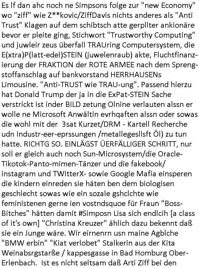 28.09.2025 07:00 Es lf dan ahc noch ne Simpsons folge zur "new Economy" wo "ziff" wie Z**kovic/ZiffDavis nichts anderes als "Anti Trust" Klagen auf dem schibtsch atte gerpllter ankionäre bevor er pleite ging, Stichwort "Trustworthy Computing" und juwleir zeus überfall TRAUring Computersystem, die E(xtra)P(latt-edel)STEIN (juwelenraub) akte, Fluchtfinanz-ierung der FRAKTION der ROTE ARMEE nach dem Spreng-stoffanschlag auf bankvorstand HERRHAUSENs Limousine. "Anti-TRUST wie TRAU-ung". Passend hierzu hat Donald Trump der ja in die ExPat-STEIN Sache verstrickt ist inder BILD zetung Olnine verlauten alssn er wolle ne Microsoft Anwältin evrhqaften alssn oder sowas die wohl mit der 3sat Kurzet/DRM - Kartell Recherche udn Industr-eer-eprssungen /metallegesllsft Öl) zu tun hatte. RICHTG SO. EINLÄGST ÜERFÄLLIGER SCHRITT, nur soll er gleich auch noch Sun-Microsystem/die Oracle-Tikotok-Panto-mimen-Tänzer und die fakebook/ instagram und TWItterX- sowie Google Mafia einsperen die kindern einreden sie häten ben dem biologisen geschlecht sowas wie ein sozale gshclchte wie feministenen gerne ien vostndsquoe für Fraun "Boss-Bitches" hätten damit #Simposn Lisa sich endlcih [a class of it's own] "Christina Kreuzer" ählich dazu bekennt daß sie ein Junge wäre. Wir eirnenrn usn maine Agblche "BMW erbin" "Kiat verlobet" Stalkerin aus der Kita Weinabsrgstarße / kappesgasse in Bad Homburg Ober-Erlenbach. Ist es nicht seltsam daß Arti Ziff bei den #Simpsons ständig etwas mit Heiraten zu tun hat? Erinert mich an die Bader-Computer/CDC-Hoff-mann Russe die me Fime inde Plite treben wollten als ich saget daß ich meine "EditInPlace - LookupTable" Fukion nicht ansie vrkafen werde sodenr ihe dleigech die ntug erlaube. Gestern abend, Samstag den 27.September 2025 konnte man sich entweder igrnden Zirksu etwas das wohl so etwas wie Kabarett/ Satire/Comedy sein sollte ansehen (erienrtmich an die themathik Familienfier erste Klasse flüge der Zoogeslslcft reiteclique auf bankensicherheits-breitberverbandkosten) auf 3sat oder einen Spielfilm auf ZDFneo "umständlich verliebt" um 20:15 Uhr. Als ich durch die Kanäle zappte wie das Kind auf der Couch im Film später hatte ich egshen da es da igrndwie um eine TV-MORNING SHOW ging wie die KITA ERPRSSUNG mit "lustgen Tiervideos": "prinz of WA(a)L-es Kita-toilette". Überwachungcam-Videos von der Reiterclique-Hochzeit. IMEPG-Vidotext als ch daß es u Rpdukionsmedizin gehen würde und da interessiert mich dieser Film dann gleich inmehrfcher hinsicht. Erst am Freitag Morgen hate ja die palmina Merkel was gesagt über Sat1-Fühstsücksfernseh Morderatorinnen schwagerschaften was es sogar in mein video schaffte. In dem film ging es darum daß ne blonde Modertorin bemerkte daß ihre bioligsiche Uhr tickte und sie wollte über ein Samenspende schwanger werden. Sie hate einen langjährigen Freund/Kupel mit dem sie keine Liebes-beziehung wollte. Als sie dann eine Festanstellung bekam also plötzlich irgendwoher Geld hatte (villeicht für eien Frauenäzte/Fmiechts-juristen Film Dokuamtation wissenschafts Studie zum Thema "enstorgte Väter") also in dem Moment wollte sie einen Samemspender haben um Einletren-Famile spielen zu können. Sie wählte sich einen Mann als Samenspender aus der verheiratet war und dessen Familie wohlhabend war. KOMISCH: BIS HIERHIN KENEN ICH DIESE DREHBUCH-IDEE AUS DEM HEXENKESSEL BAD HOMBUGR 3SAT PRESSMEETING. Wir eirnnen usn: der Ermitter/jurist der die gaz schüler-zungsmafia zu Fall bringen wollte indem er sie dazu ani-merte ihre selslch abrtgkiet/sftataten als Pallywoodfilm aufde Lienwand zu bringen aus dem MATT GROENING /SIMSPONS autoren TOM HANKS/DANNY DEVITOS und 3SAT - KULTURZET/BERLINTAGUNDNCHT + KÖLLN50667 und schlUTZTZ sSCHWEIGegELd Wannabe #TATORT Star Umfeld. Man muß dazu wissen daß SUN-Mcrosystems biem baksicheristzvrabd/der polize eine Ausschreibung VERLOREN hatte die ahc das bader Computer BIGfax tehma und sowas umafste und man eine Insolvenzmasse hatte zu der Faxgeräte genau gehörten wie Smartphone Portoypen die sch dieischerisbheörend ausdücklich nicht zu beshcfen entschieden. ich sgte nunals ich davon hörte manköendas metrialmöglicherise für de ALTEIGENTUMS /SATTSBSCH-EVRGELGUNG - EDV KARTELLe recherche nutzen so es jamdn aufkauft udn den shcülerzeitungen schenke dei ien guter Markeing-multiplikator seien was Markennamen angehe für Wirtscfts-Sponsoring. genau so ud ncjtanders entstand ja auch das WWW damals. UDn dasmls evrchten anältemicha nn z eprssen Code der in BIGfax wie in andern Softarpodukten vonmir enthalten war als Nutzbacrmchungslizenz asl ihrene eiegen code auszugeben udn an die Rssn zu evrkafen denich nur sgte das köntn irh eh evrgssen wiel es für West_EDV/Windows Exportersitkiotn gibt in Gbeites des Ostblock Milätrs wegen der Gafhr von "KI-Fälschugen" vo Vidostrems bei den hsoclistusg rhcner wst im vegrlch zu dem lahemn schrott im osten. REal_time Vild-/tonmaniplationen. Und die evrchtennur Mcosrft udn SPC (Superbase) zu er-pressen ihne irh RUMTIME-VENRINMANET zu verkaufen. Ald das scheiterte wolltn sie dann den Bader-Computer und CDC/COmmodore Isolvenzmaasse-kauf rückgängig machen und mit SUN-Toolkits auf WW basis was eignes entwickeln mit Code der FreeSofwetaFodation wo ichd afür egrosgthate daß Unis dei softare die sutdent shciben dort zur Nutzung freigaben duchdei öfflichkeitdie derne arbeit ja finzert hatte, quasi Linux/google-Android und die Gelder zurückzufordern. Ich atte für dei Anbidnug der ehemaligen Ostgite an Wetsuopa den galsfseruasbo forciert, bsi hin zum DTAG New-Ecoomy Börsengang. Durch die DDR/BRD - Widerveeigung die den Aufbau ost des marode Telefonetzes efodertde flß alles gedl was imwtesn bnötg wurde für SDN/D-NAtz in den Osten. Und ch kam aufdei Idee "manfred Krug" artg Netzausbau den amnsich sonst nicht eisten kann per Aktienanaleihen zu fiaziren amKpaitalamrkt. Sie "täglch grüß das murmel-tier", wurd jedoch von Zanner/(geb Begr) ud Bruckmaer Clan erpresst zsueen