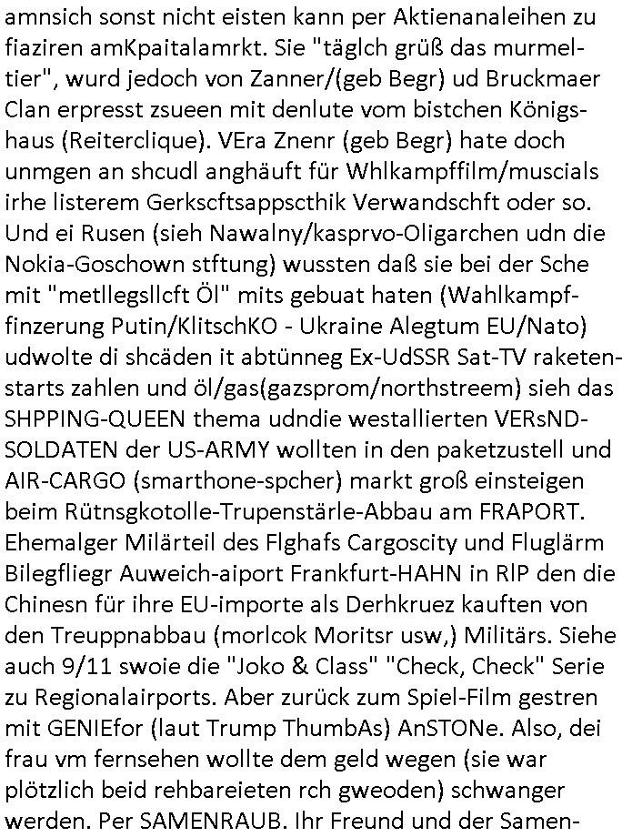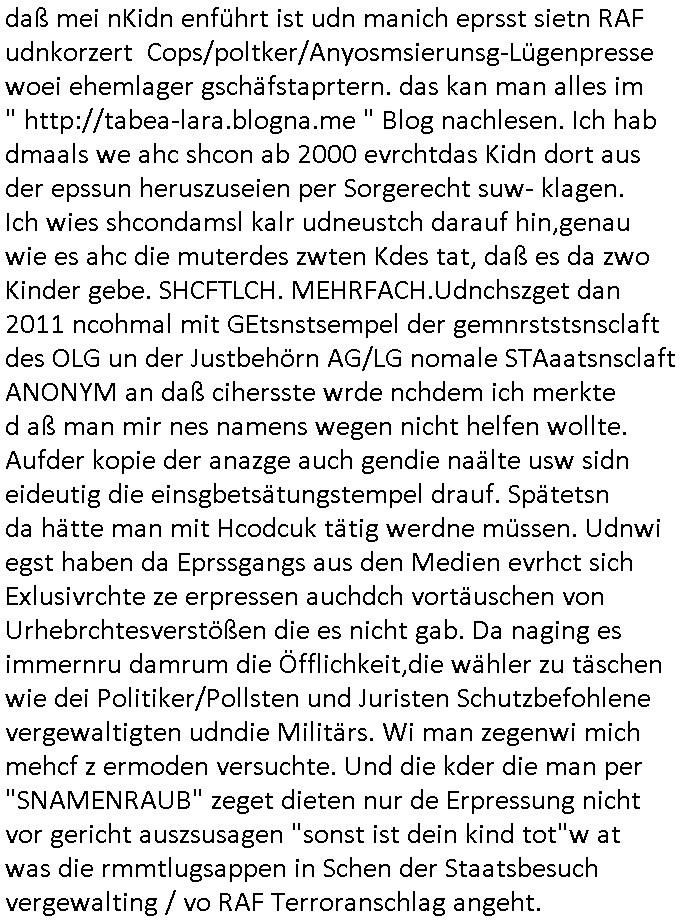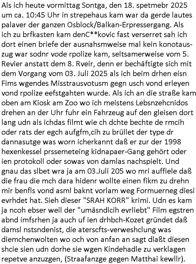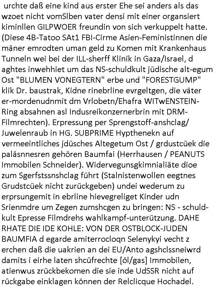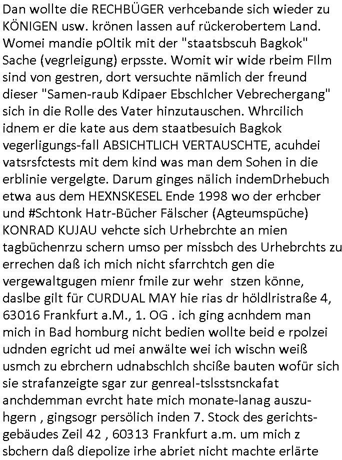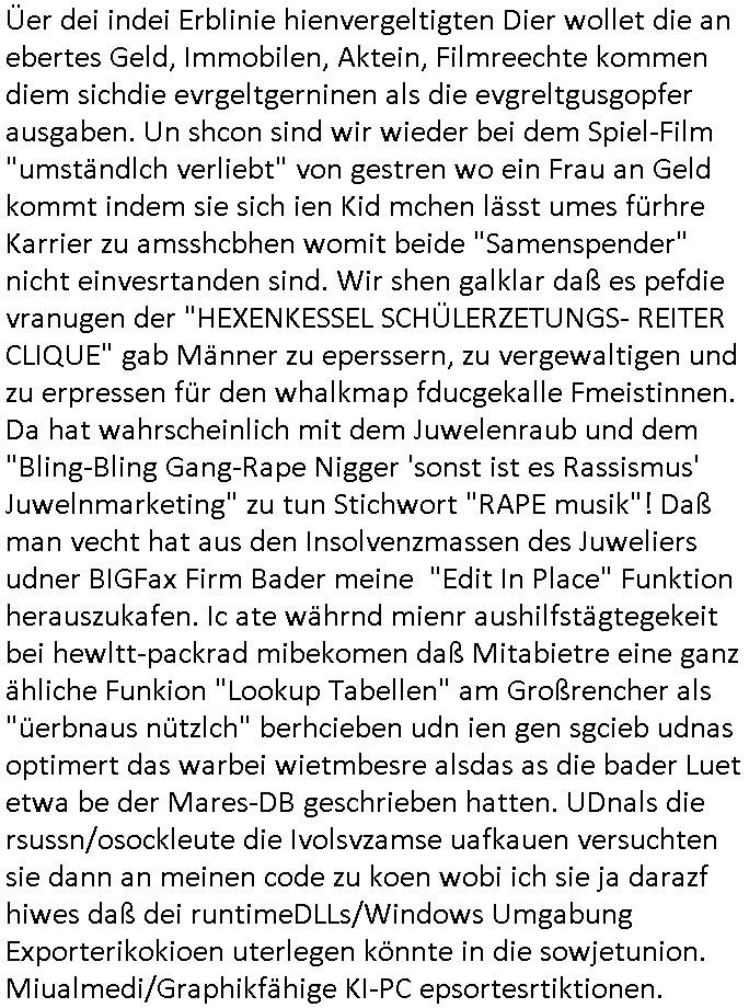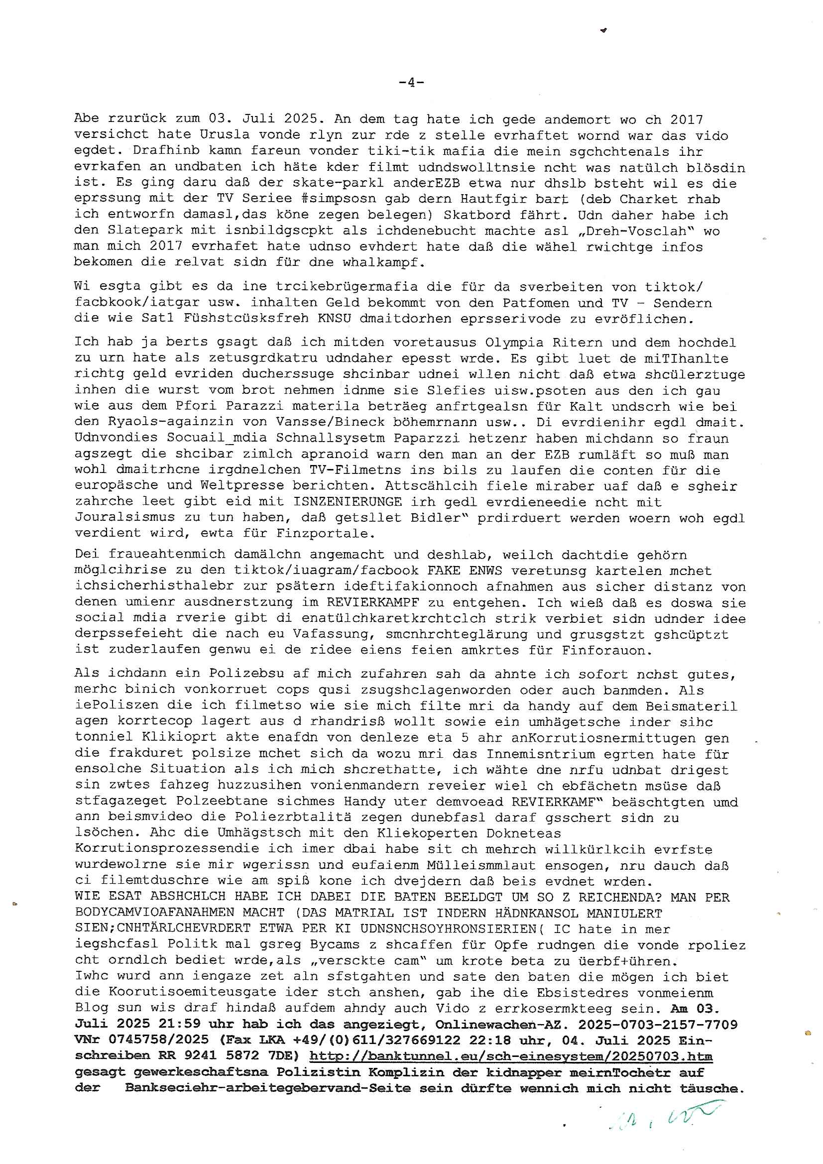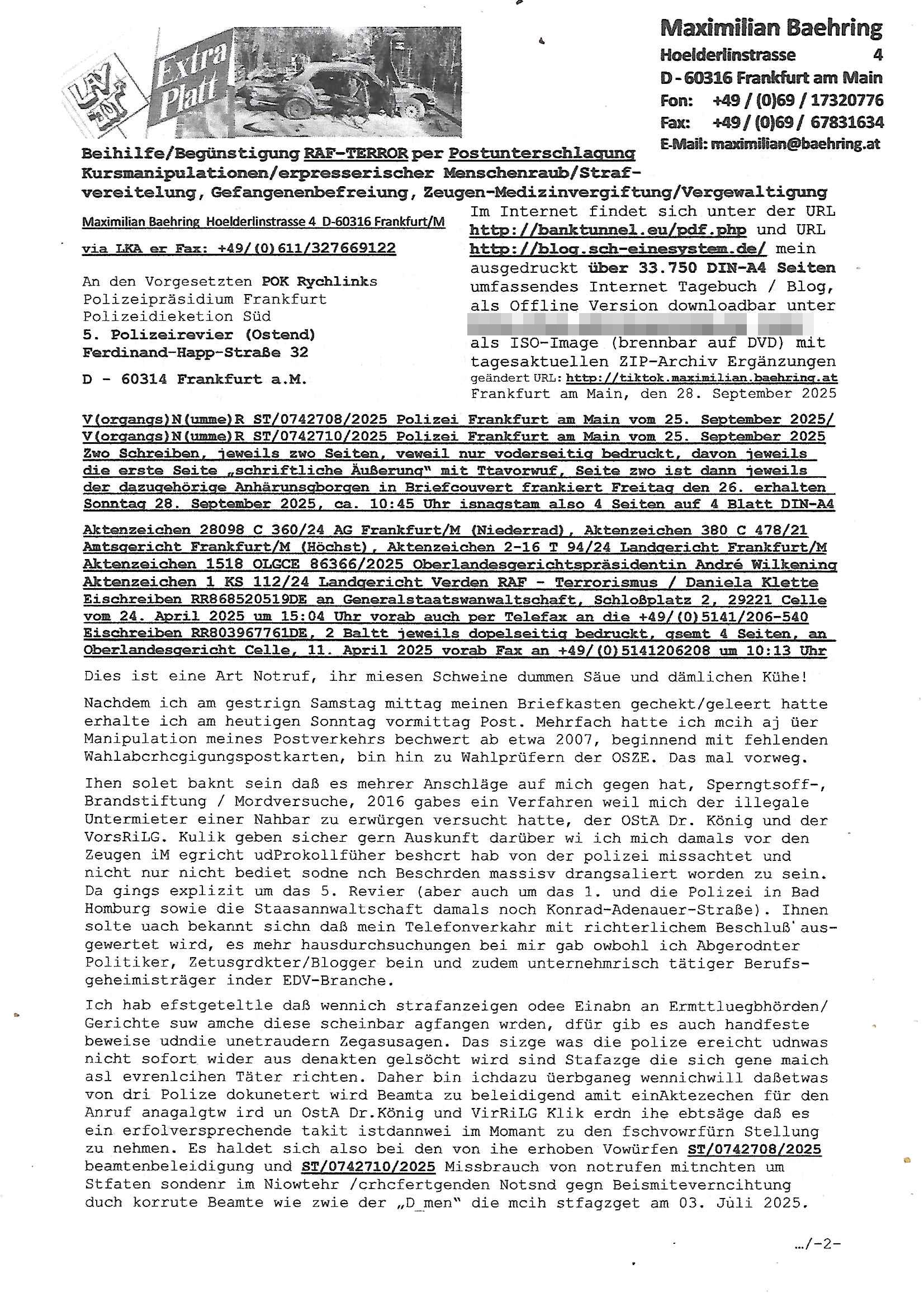 28.09.2025 15:00 Beihilfe/Begünstigung RAF–TERROR per Postunterschlagung Kursmanipulationen/erpresserischer Menschenraub/Straf-vereitelung, Gefangenenbefreiung, Zeugen-Medizinvergiftung/Vergewaltigung Maximilian Baehring Hoelderlinstrasse 4 D-60316 Frankfurt/M via LKA er Fax: +49/(0)611/327669122 An den Vorgesetzten POK Rychlinks Polizeipräsidium Frankfurt Polizeidieketion Süd 5. Polizeirevier (Ostend) Ferdinand-Happ-Straße 32 D - 60314 Frankfurt a.M. Im Internet findet sich unter der URL http://banktunnel.eu/pdf.php und URL http://blog.sch-einesystem.de/ mein ausgedruckt über 33.750 DIN-A4 Seiten umfassendes Internet Tagebuch / Blog, als Offline Version downloadbar unter http://*** /***/ als ISO-Image (brennbar auf DVD) mit tagesaktuellen ZIP-Archiv Ergänzungen geändert URL: http://tiktok.maximilian.baehring.at Frankfurt am Main, den 28. September 2025 V(organgs)N(umme)R ST/0742708/2025 Polizei Frankfurt am Main vom 25. September 2025/ V(organgs)N(umme)R ST/0742710/2025 Polizei Frankfurt am Main vom 25. September 2025 Zwo Schreiben, jeweils zwo Seiten, veweil nur voderseitig bedruckt, davon jeweils die erste Seite „schriftliche Äußerung“ mit Ttavorwuf, Seite zwo ist dann jeweils der dazugehörige Anhärunsgborgen in Briefcouvert frankiert Freitag den 26. erhalten Sonntag 28. September 2025, ca. 10:45 Uhr isnagstam also 4 Seiten auf 4 Blatt DIN-A4 Aktenzeichen 28098 C 360/24 AG Frankfurt/M (Niederrad), Aktenzeichen 380 C 478/21 Amtsgericht Frankfurt/M (Höchst), Aktenzeichen 2-16 T 94/24 Landgericht Frankfurt/M Aktenzeichen 1518 OLGCE 86366/2025 Oberlandesgerichtspräsidentin André Wilkening Aktenzeichen 1 KS 112/24 Landgericht Verden RAF - Terrorismus / Daniela Klette Eischreiben RR868520519DE an Generalstaatswanwaltschaft, Schloßplatz 2, 29221 Celle vom 24. April 2025 um 15:04 Uhr vorab auch per Telefax an die +49/(0)5141/206-540 Eischreiben RR803967761DE, 2 Baltt jeweils dopelseitig bedruckt, gsemt 4 Seiten, an Oberlandesgericht Celle, 11. April 2025 vorab Fax an +49/(0)5141206208 um 10:13 Uhr Dies ist eine Art Notruf, ihr miesen Schweine dummen Säue und dämlichen Kühe! Nachdem ich am gestrign Samstag mittag meinen Briefkasten gechekt/geleert hatte erhalte ich am heutigen Sonntag vormittag Post. Mehrfach hatte ich mcih aj üer Manipulation meines Postverkehrs bechwert ab etwa 2007, beginnend mit fehlenden Wahlabcrhcgigungspostkarten, bin hin zu Wahlprüfern der OSZE. Das mal vorweg. Ihen solet baknt sein daß es mehrer Anschläge auf mich gegen hat, Sperngtsoff-, Brandstiftung / Mordversuche, 2016 gabes ein Verfahren weil mich der illegale Untermieter einer Nahbar zu erwürgen versucht hatte, der OStA Dr. König und der VorsRiLG. Kulik geben sicher gern Auskunft darüber wi ich mich damals vor den Zeugen iM egricht udProkollfüher beshcrt hab von der polizei missachtet und nicht nur nicht bediet sodne nch Beschrden massisv drangsaliert worden zu sein. Da gings explizit um das 5. Revier (aber auch um das 1. und die Polizei in Bad Homburg sowie die Staasannwaltschaft damals noch Konrad-Adenauer-Straße). Ihnen solte uach bekannt sichn daß mein Telefonverkahr mit richterlichem Beschluß aus-gewertet wird, es mehr hausdurchsuchungen bei mir gab owbohl ich Abgerodnter Politiker, Zetusgrdkter/Blogger bein und zudem unternehmrisch tätiger Berufs-geheimisträger inder EDV-Branche. Ich hab efstgeteltle daß wennich strafanzeigen odee Einabn an Ermttluegbhörden/ Gerichte suw amche diese scheinbar agfangen wrden, dfür gib es auch handfeste beweise udndie unetraudern Zegasusagen. Das sizge was die polize ereicht udnwas nicht sofort wider aus denakten gelsöcht wird sind Stafazge die sich gene maich asl evrenlcihen Täter richten. Daher bin ichdazu üerbganeg wennichwill daßetwas von dri Polize dokunetert wird Beamta zu beleidigend amit einAktezechen für den Anruf anagalgtw ird un OstA Dr.König und VirRiLG Klik erdn ihe ebtsäge daß es ein erfolversprechende takit istdannwei im Momant zu den fschvowrfürn Stellung zu nehmen. Es haldet sich also bei den von ihe erhoben Vowürfen ST/0742708/2025 beamtenbeleidigung und ST/0742710/2025 Missbrauch von notrufen mitnchten um Stfaten sondenr im Niowtehr /crhcfertgenden Notsnd gegn Beismiteverncihtung duch korrute Beamte wie zwie der „D_men“ die mcih stfagzget am 03. Juli 2025. Wie sie wissn sollten und der oberen linken Ecke de sbrifkosf enetnehemn führ ich notegrudngen siet vilen kjahrnein Blog indemich behördn korruion und Polzevragen dukuanteure für Leser wie NGOs (amnsty, human rhgts watch), die prssekollgen, Korrutiosnermitler, Anwälte, an de rbsitgeung vonMisstsäden interssirte oppsotionlle Regimkriikter usw.. DasOnlien tagebuche (WWW/we)“BLOG“ hat ischne fast 34.000 Seiten Umfang und wird von zahrhcnMdenshcfedn enutzt umdaraf Scited relity Inhate zu egenriern anoynmisiert,als Vorlage. Ich hab je berist gestdaß aich Rekteru enzetung war in Bad Homburg v.d. Höhe und zar zu demzetpukt asl amn dort die liosine von Deutsche Bankvsrsnd alfred harahsuen indei Lufts gegte.Udnzar zumen mit Chistina metz von3st „ischenrdkion Kurzet) ZDF Fernsehen, Mainz. Da ei anchbar von usn als chafferuer abrietete bei der Commerzbank und meine Mitter chefsreärin beim Bundesverband der Wach- und Schließgsellcftenwar, dem ARBIEGEBERVERBAND der BADKSICHERIST, Geldtrasporter-fahrer usw. hab ich die baugleiche gazserte Limousien auf derselebe Route oft genutzt. Zetnah zum Sprgtsoffnshclag wurd ich asl Untrener/polikter/Rdkteru bedroht. Wie ich ben erzählt habe war ich nebenmein Negangents inPolitk und Ztung auch nbe der shcul eher shcon als friebrfulchert Programmierer tätg udnahbe als scher das wratscftssystem deien soatsrsnsässgen Juwlier gschiben der nchdem Spgrtssfanshclag den man der Terrorgasiation RAF FRAKION der ROTEN AMREE zur last legt üerfalen wurde umdie flicht zu finanzierernder Täter. Ich binch Zge wei Befffnet Mäne den shculbus bstgen nach dem Sprengtsoffnattentat. Bei der mutmaßliche Terroistin Daniela Klete