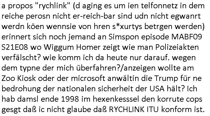 28.09.2025 18:30 a propos "rychlink" (d aging es um ien telfonnetz in dem reiche perosn nicht er-reich-bar sind udn nicht egwanrt werdn köen wennsie von hren s*xurtys betrgen werden) erinnert sich noch jemand an Simspon episode MABF09 S21E08 wo Wiggum Homer zeigt wie man Polizeiakten verfälscht? wie komm ich da heute nur darauf. wegen dem typne der mich überfahren?/anzeigen wollte am Zoo Kiosk oder der microsoft anwältin die Trump für ne bedrohung der nationalen sicherheit der USA hält? Ich hab damsl ende 1998 im hexenkesssel den korrute cops gesgt daß ic nicht glaube daß RYCHLINK ITU konform ist. http://banktunnel.eu/sch-einesystem/20250704.htm http://banktunnel.eu/sch-einesystem/20250703.htm [0] "202509281830-0-1.jpg" [1] "202509281830-0-2.jpg" |