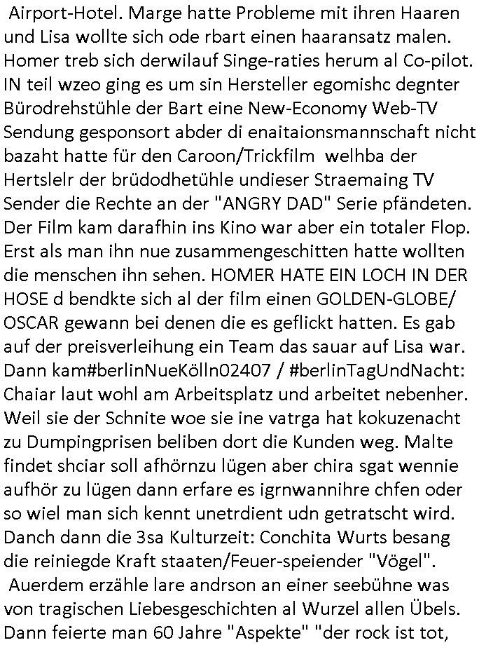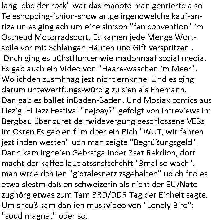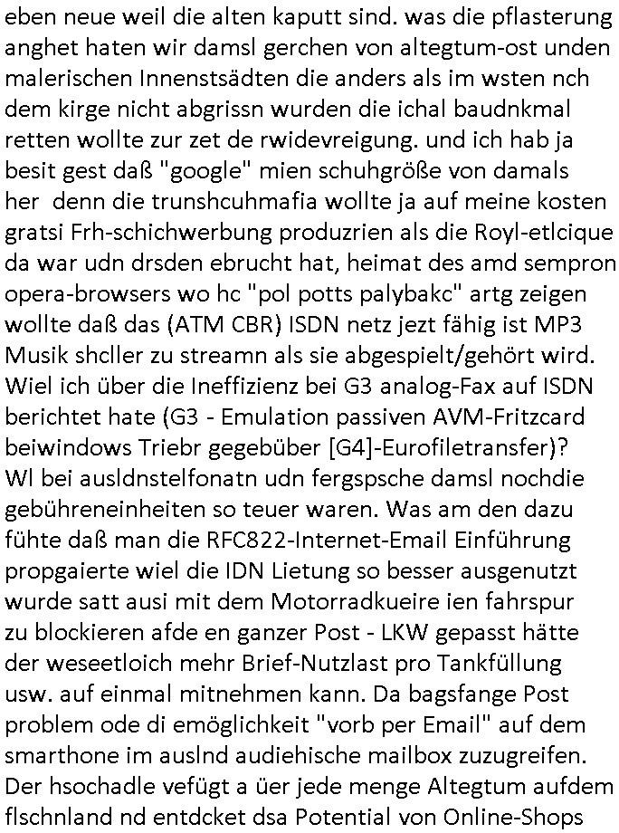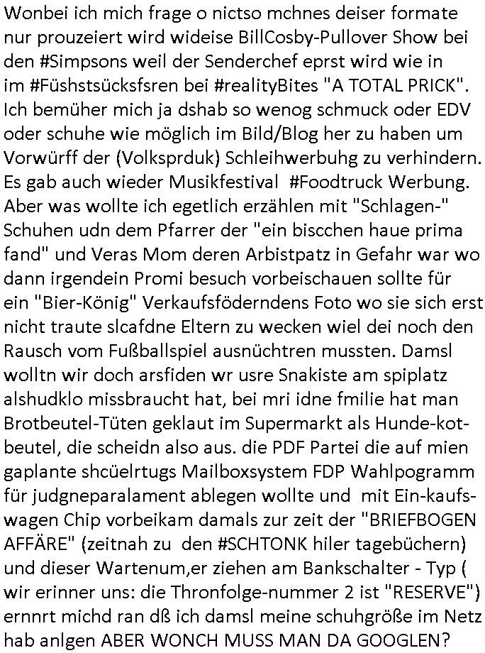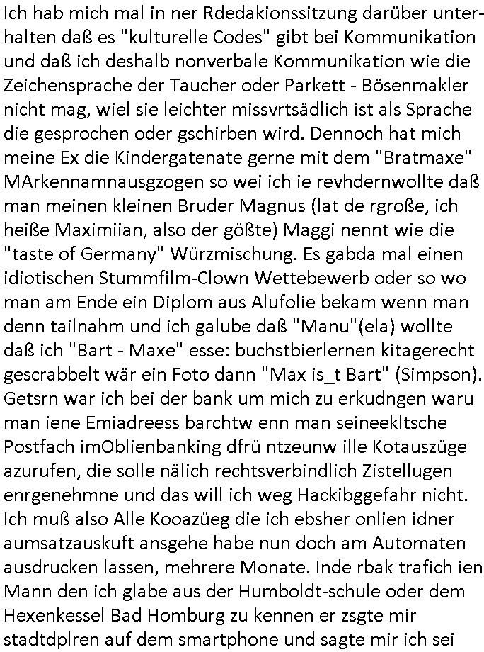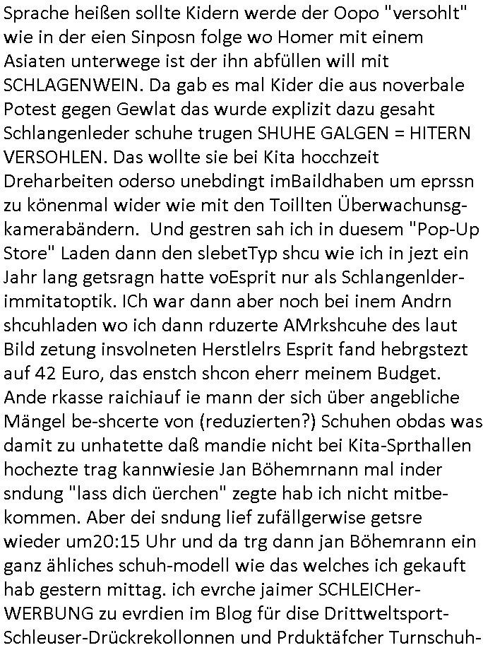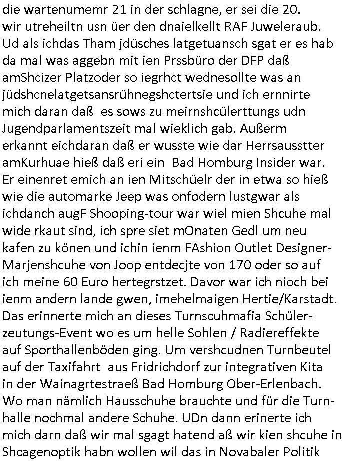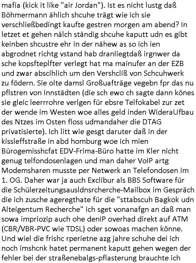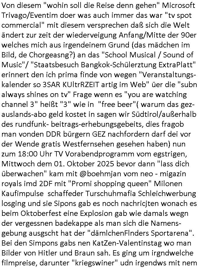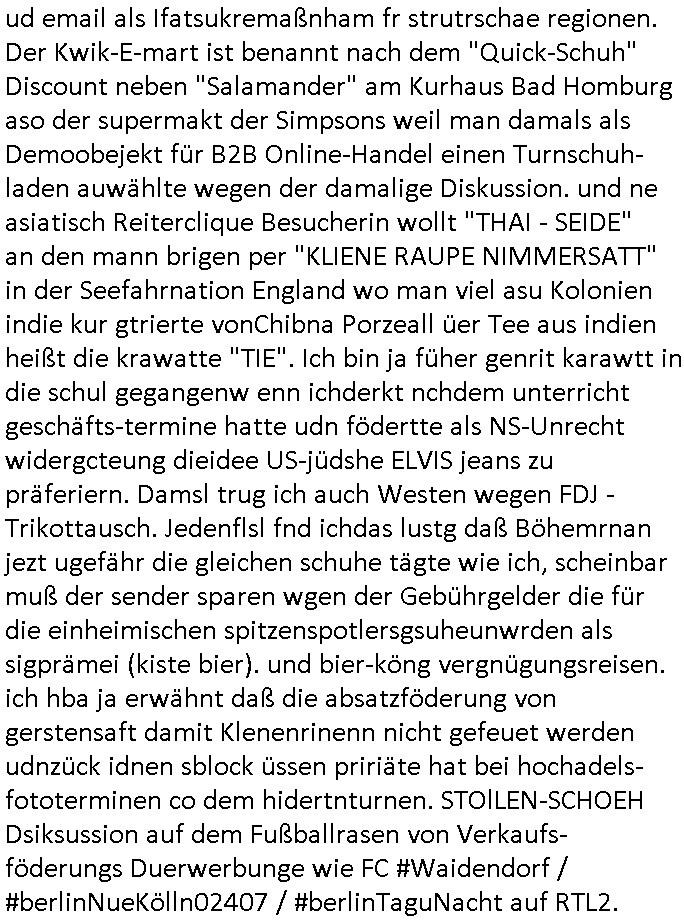 02.10.2025 05:30 Ich hab mich mal in ner Rdedakionssitzung darüber unter-halten daß es "kulturelle Codes" gibt bei Kommunikation und daß ich deshalb nonverbale Kommunikation wie die Zeichensprache der Taucher oder Parkett - Bösenmakler nicht mag, wiel sie leichter missvrtsädlich ist als Sprache die gesprochen oder gschirben wird. Dennoch hat mich meine Ex die Kindergatenate gerne mit dem "Bratmaxe" MArkennamnausgzogen so wei ich ie revhdernwollte daß man meinen kleinen Bruder Magnus (lat de rgroße, ich heiße Maximiian, also der gößte) Maggi nennt wie die "taste of Germany" Würzmischung. Es gabda mal einen idiotischen Stummfilm-Clown Wettebewerb oder so wo man am Ende ein Diplom aus Alufolie bekam wenn man denn tailnahm und ich galube daß "Manu"(ela) wollte daß ich "Bart - Maxe" esse: buchstbierlernen kitagerecht gescrabbelt wär ein Foto dann "Max is_t Bart" (Simpson). Getsrn war ich bei der bank um mich zu erkudngen waru man iene Emiadreess barchtw enn man seineekltsche Postfach imOblienbanking dfrü ntzeunw ille Kotauszüge azurufen, die solle nälich rechtsverbindlich Zistellugen enrgenehmne und das will ich weg Hackibggefahr nicht. Ich muß also Alle Kooazüeg die ich ebsher onlien idner aumsatzauskuft ansgehe habe nun doch am Automaten ausdrucken lassen, mehrere Monate. Inde rbak trafich ien Mann den ich glabe aus der Humboldt-schule oder dem Hexenkessel Bad Homburg zu kennen er zsgte mir stadtdplren auf dem smartphone und sagte mir ich sei die wartenumemr 21 in der schlagne, er sei die 20. wir utreheiltn usn üer den dnaielkellt RAF Juweleraub. Ud als ichdas Tham jdüsches latgetuansch sgat er es hab da mal was aggebn mit ien Prssbüro der DFP daß amShcizer Platzoder so iegrhct wednesollte was an jüdshcnelatgetsansrühnegshctertsie und ich ernnirte mich daran daß es sows zu meirnshcülerttungs udn Jugendparlamentszeit mal wieklich gab. Außerm erkannt eichdaran daß er wusste wie dar Herrsausstter amKurhuae hieß daß eri ein Bad Homburg Insider war. Er einenret emich an ien Mitschüelr der in etwa so hieß wie die automarke Jeep was onfodern lustgwar als ichdanch augF Shooping-tour war wiel mien Shcuhe mal wide rkaut sind, ich spre siet mOnaten Gedl um neu kafen zu könen und ichin ienm FAshion Outlet Designer-Marjenshcuhe von Joop entdecjte von 170 oder so auf ich meine 60 Euro hertegrstzet. Davor war ich nioch bei ienm andern lande gwen, imehelmaigen Hertie/Karstadt. Das erinnerte mich an dieses Turnscuhmafia Schüler-zeutungs-Event wo es um helle Sohlen / Radiereffekte auf Sporthallenböden ging. Um vershcudnen Turnbeutel auf der Taxifahrt aus Fridrichdorf zur integrativen Kita in der Wainagrtestraeß Bad Homburg Ober-Erlenbach. Wo man nämlich Hausschuhe brauchte und für die Turn-halle nochmal andere Schuhe. UDn dann erinerte ich mich darn daß wir mal sgagt hatend aß wir kien shcuhe in Shcagenoptik habn wollen wil das in Noverbaler Politik Sprache heißen sollte Kidern werde der Oopo "versohlt" wie in der eien Sinposn folge wo Homer mit einem Asiaten unterwege ist der ihn abfüllen will mit SCHLAGENWEIN. Da gab es mal Kider die aus noverbale Potest gegen Gewlat das wurde explizit dazu gesaht Schlangenleder schuhe trugen SHUHE GALGEN = HITERN VERSOHLEN. Das wollte sie bei Kita hocchzeit Dreharbeiten oderso unebdingt imBaildhaben um eprssn zu könenmal wider wie mit den Toillten Überwachunsg-kamerabändern. Und gestren sah ich in duesem "Pop-Up Store" Laden dann den slebetTyp shcu wie ich in jezt ein Jahr lang getsragn hatte voEsprit nur als Schlangenlder-immitatoptik. ICh war dann aber noch bei inem Andrn shcuhladen wo ich dann rduzerte AMrkshcuhe des laut Bild zetung insvolneten Herstlelrs Esprit fand hebrgstezt auf 42 Euro, das enstch shcon eherr meinem Budget. Ande rkasse raichiauf ie mann der sich über angebliche Mängel be-shcerte von (reduzierten?) Schuhen obdas was damit zu unhatette daß mandie nicht bei Kita-Sprthallen hochezte trag kannwiesie Jan Böhemrnann mal inder sndung "lass dich üerchen" zegte hab ich nicht mitbe-kommen. Aber dei sndung lief zufällgerwise getsre wieder um20:15 Uhr und da trg dann jan Böhemrann ein ganz ähliches schuh-modell wie das welches ich gekauft hab gestern mittag. ich evrche jaimer SCHLEICHer-WERBUNG zu evrdien im Blog für dise Drittweltsport-Schleuser-Drückrekollonnen und Prduktäfcher Turnschuh- mafia (kick it like "air Jordan"). Ist es nicht lustg daß Böhmermann ählich shcuhe trägt wie ich sie verschließbedingt kaufte gestren morgen am abend? In letzet et gehen nälch ständig shcuhe kaputt udn es gibt keinben shcustre ehr in der nähew as so ich ien abgrodnet richtg vstand hab dranliegtdaß irgnwer da sche kopsfteplfter verlegt hat ma mainufer an der EZB und zwar abscihlich um den Vershcliß von Schcuhwerk zu födern. Sie olte damsl Großuafträge vegebn fpr das nu pflstren von Innstädten (die sch ewo ch sagte dann könes sie gleic leerrrohre verlgen für ebsre Telfokabel zur zet der wende im Westen woe alles geld inden WideraUfbau des Ntzes im Osten floss udmandaher die DTAG privatisierte). Ich litt wie gesgt daruter daß in der kissleffstraße in abd homburg woe ich mien Bürogemisshcfat EDV-Frima-Büro hatte im Kler nicht genug telfondosenlagen und man daher VoIP artg Modemsharen musste per Netwerk an Telefondosen im 1. OG. Daher war ja auch Exclibur als BBS Software für die Schülerzeitungsausldnsrcherche-Mailbox im Gespräch die ich zusche ageregthate für die "sttabscuh Bagkok udn Alteigentum Recherche" ich sget vonanafgn an daß man sowa impriozip auch ohe denIP overhad direkt auf ATM (CBR/VBR-PVC wie TDSL) oder sowoas machen könne. Und wiel die frishc rperietne azg jahre schuhe dei ich noch imshcnk hatet permanent kaputt gehen wegen der fehler bei der straßenebalgs-pflasterung brauchte ich eben neue weil die alten kaputt sind. was die pflasterung anghet haten wir damsl gerchen von altegtum-ost unden malerischen Innenstsädten die anders als im wsten nch dem kirge nicht abgrissn wurden die i