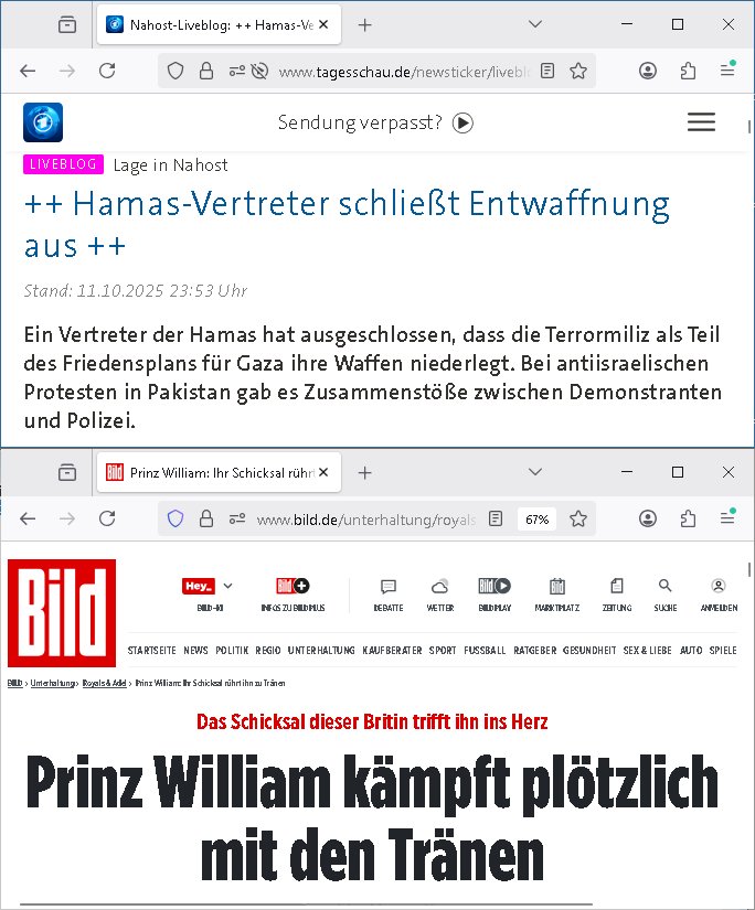 12.10.2025 03:15 https://www.tagesschau.de/newsticker/liveblog-nahost-samstag-296.html ++ Hamas-Vertreter schließt Entwaffnung aus ++ [0] "202510120315-0-1.jpg" |