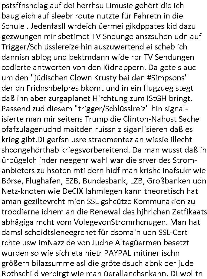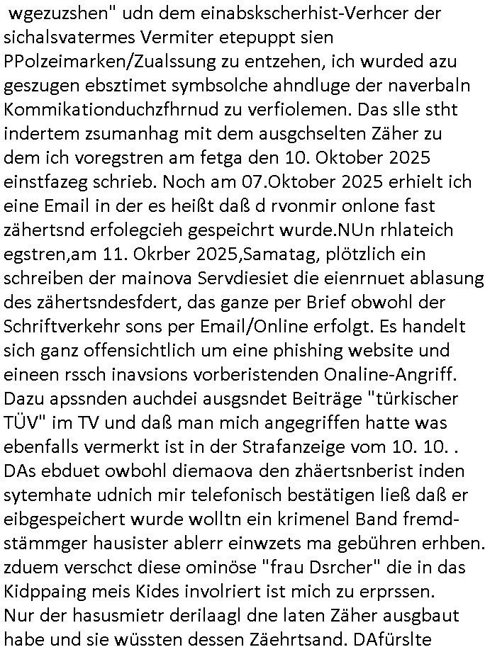 12.10.2025 07:45 Beihilfe/Begünstigung RAF–TERROR per Postunterschlagung Kursmanipulationen/erpresserischer Menschenraub/Straf-vereitelung, Gefangenenbefreiung, Zeugen-Medizinvergiftung/Vergewaltigung Maximilian Baehring Hoelderlinstrasse 4 D-60316 Frankfurt/M vorab vorerst per Fax: +49/(0)69/213-25154 persönlich/vertrauich Geschäftsleitung Mainova AG / Mainova Service Dienste GmbH Solmsstraße 38 D - 60486 Frankfurt a.M. Im Internet findet sich unter der URL http://banktunnel.eu/pdf.php und URL http://blog.sch-einesystem.de/ mein ausgedruckt über 33.750 DIN-A4 Seiten umfassendes Internet Tagebuch / Blog, als Offline Version downloadbar unter http://*** /***/ als ISO-Image (brennbar auf DVD) mit tagesaktuellen ZIP-Archiv Ergänzungen geändert URL: http://tiktok.maximilian.baehring.at Frankfurt am Main, den 12. Oktober 2025 Kundennummer P20169506454 Ihr Schreiben mit Absender Mainova Servicedienste GmbH c/o RZ Webmetering 06837 Dessau Roßlau eigegangen 10,, datiert 09. Oktober 2025, 1 Blatt, doppelseitig bedruckt, mit abtrennbare Zählerstandsablese Rück-Postkarte Ihre EMail erhalten 06. Oktober 2025 Betreff: „Zählerstandsablesung Mainova AG“ an <mobile@baehring.at> von <noreply@mainova.de> sowie ihre EMail vom 07. Oktober 2025 „Speicherung Ihrer Zählerstände“ und Telefonat vom 07. Oktober 2025 mit ihrer Frau „Drescher“ von 16:04 Uhr bis ca. 16:23 Uhr auf Rufnummer (+49 ?) 0800 / 0004263 Einschreiben RR5775 7180 2DE vom 31. Oktober 2024, Fax +49/(0)69/21325154 15:28 Uhr Kundennummer P20169506454 Ihr Schreiben datiert vom 24. Oktober 2024, 1 Blatt, doppelseitig bedruckt, 2 Seiten, per Post eingegagen 31. Oktober 2024, 14:15 Uhr betitelt mit „Zahlungs-Avis Verbrauchsstelle Hölderistraße 4, 60316 Frankfurt/M.“ Einschreiben RT 1019 30084 4DE Staatsanwaltschaft (Gemeinsame Poststelle Justizbehörden Gerichtsstraße 2 60313 Frankfurt a.M.) vorab Fax 08:20 Uhr an LKA +49/(0)611/327669122 Manipulation von Stromzählern / Tätlicher Angriff / mafiöse Tätigkeit des C***kovic Aktenzeichen 28098 C 360/24 AG Frankfurt/M (Niederrad), Aktenzeichen 380 C 478/21 Amtsgericht Frankfurt/M (Höchst), Aktenzeichen 2-16 T 94/24 Landgericht Frankfurt/M Aktenzeichen 1518 OLGCE 86366/2025 Oberlandesgerichtspräsidentin André Wilkening Aktenzeichen 1 KS 112/24 Landgericht Verden RAF - Terrorismus / Daniela Klette Eischreiben RR868520519DE an Generalstaatswanwaltschaft, Schloßplatz 2, 29221 Celle vom 24. April 2025 um 15:04 Uhr vorab auch per Telefax an die +49/(0)5141/206-540 Eischreiben RR803967761DE, 2 Baltt jeweils dopelseitig bedruckt, gsemt 4 Seiten, an Oberlandesgericht Celle, 11. April 2025 vorab Fax an +49/(0)5141206208 um 10:13 Uhr Vorgangsnummer: 24-210319 beim Postbank Privatkunden Beschwerdemanagement, Bonn Einschreiben RR577571759DE (Fax an +49/(0)228/5500-5515 31.10.2024 12:16 Uhr) an die Postbank Filiale (Filialleitung) Goethestraße 6, 60311 Frankfurt a.M. Rück - ECHTZEITtüberwiesung vom 30. Oktober 2024 an “Mainova Aktiengesellschaft“ Verwendungszweck „Kunde P20169506454 Fax +49/069/21325154 24.10.2024 16:35 zurück B8621057538VAvis per PostversandAvis per Postversand/B8621057538V20169506454“ an die IBAN/Kontonummer „DE71 5005 0000 0014 8460 20“ in Höhe von 128,34 Euro. Einschreiben RR577571691DE vom 30. Oktober 2024 an die Postbank (Filialleitung) Goetheplatz 6, 60311 Frankfurt/M., per Fax an +49/(0)228/55005515 um 12:08 Uhr. Giro-Konto-Gutschrift vom 25. Oktober 2024 Absender “Mainova Aktiengesellschaft“ Verwendungszweck „B8621057538VAvis per PostversandAvis per Postversand“ es ist noch eine IBAN/Kotnonummer „DE71 5005 0000 0014 8460 20“ angegeben sowie eine „Kundenerferenz B8621057538V20169506454“ ein Betrag in Höhe von 211,58 Euro. EMail Betreff: „Neue Online-Rechnung“ an <mobile@baehring.at> von <noreply@mainova.de> alias <noreply-online-rechnung@mainova.de> hier erhalten am 24. Oktober 2024 07:42 Uhr Ihr absolute miese Betrügerbande! Wie jede har/ immer gibt es nixhst als Ärger mit der Mainova / den Stadtwerken. Und das obwohl schon jede menge Satraafzeg agchte waurn Gctsvafhr anhängig sind. Als ich am 06. Oktober 2025 ihre im Betreff bezeichnete Email erhalten hatte in der es um die järliche Ablesung des Stromzähler ging entdcket ich zu mien Etsuan eine geänderte Zählernummer. Ich erinenrte mich dunkel daß der Hausmsiter etwas ezählt hate davond aß jendn verucht habe den zäher zu tauschen und ich sagte ihm er solle das auf jeden fall verhindern, immerhin sind da noch gerichtprozesse anhägig udnch werte das ganze als STRAFBARE BEISMITEVERNDICHTUNG udnwerde das asl siche zur anzge brigen. Als ich mich nun ihrer Email wegen in das Online Webportal „mainova.de“ einloggte sah ich daß auchd ort die nue Zäernumemr war, and deder zählerstanshistoroe der bisherigen Zählernummer suchte ich vergeblich. Sie ist aber noch Größtenetisl aus den rhcnugen der vergangenen jahr die ich auch als Download-Kopie zu hause habe ersichtlich. Wueterbannt ließ ich mir das Zählerhäuschn im Hof aussfchieß und enteeckt edaß tatsächlcih ein neuer zähler genau dort evrbaut worden war wo vorher der veisherig hing. Desn Zähertsnd war auch ungewöhlich niderge, ich verbrauche meist um die 100 kw/h im Monat. Ich hab dne neun Zährtsnd dann abgfilt/fotgrafert und sosfrt im Webirafce eigetragen. Dan habe ich bei der mainovanagrifen und eggat was das soll udnwi der laet Zählertsand sie. Der wurde mir mitgeteilt war aber zu niedrig. DI edame mit de rich von ca. 16:04 Uhr bis ca. 16:23 Uhr sprach auf der Rufnummer 0800/0004263 nantze sich „Drescher“. Der Name „Drewshcer“ (wie Schläger) ist mir asu ienm Tfafan im Bad Homburge Hexenkessel ende 1998 bekannt und ar vonKorruten Mitabriter iens Sicherheits-dienstes. Meine Mutter abriet bis etwa zum Sprgstoffnschag auf Dsuche bak Vostnd Alfred Herrhausen als Chefsekretärin beim „bundesverband der Wahc- und Schließ-gesellschaften“ in ad Homburg,d as istder abitgebervad de gel