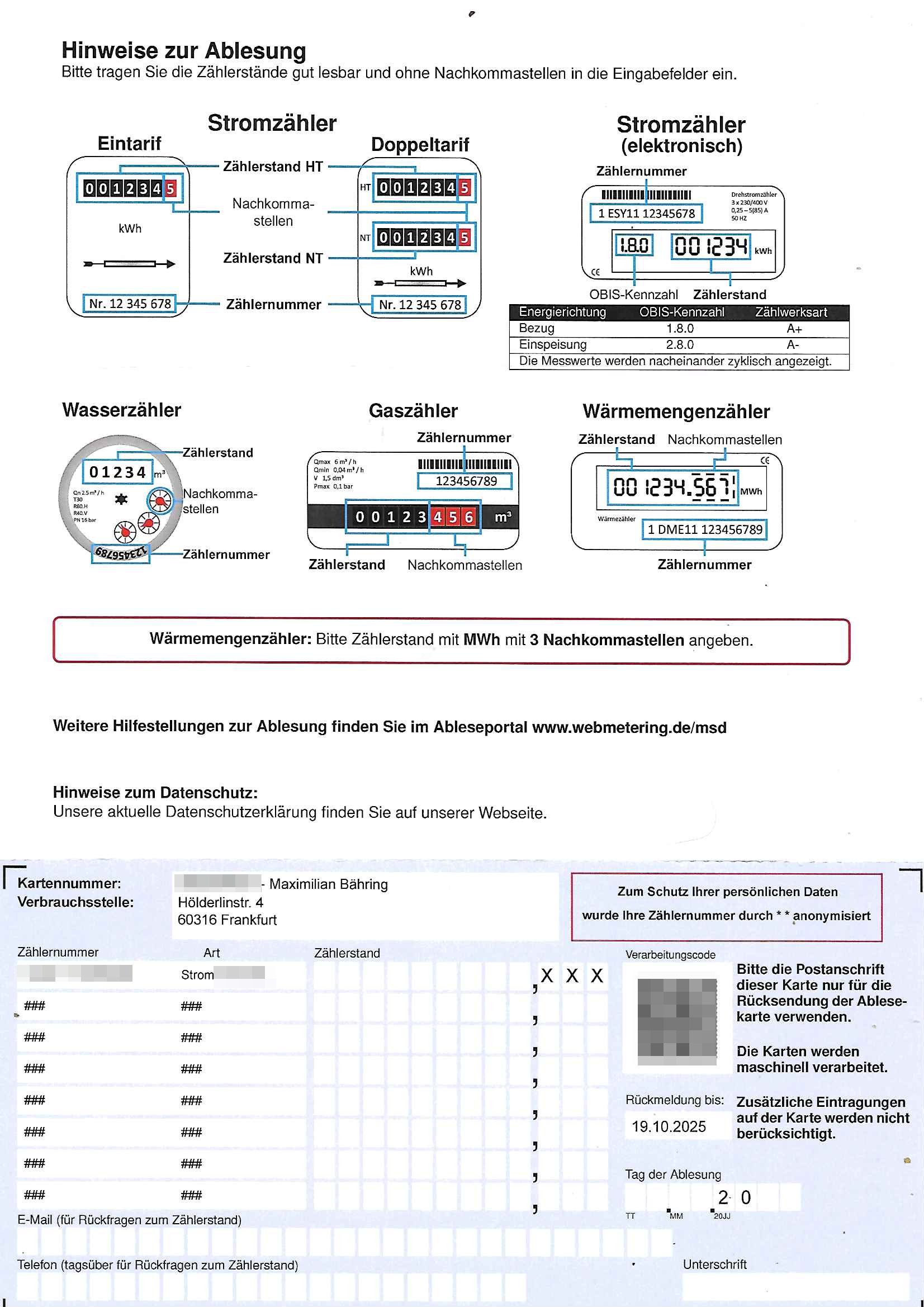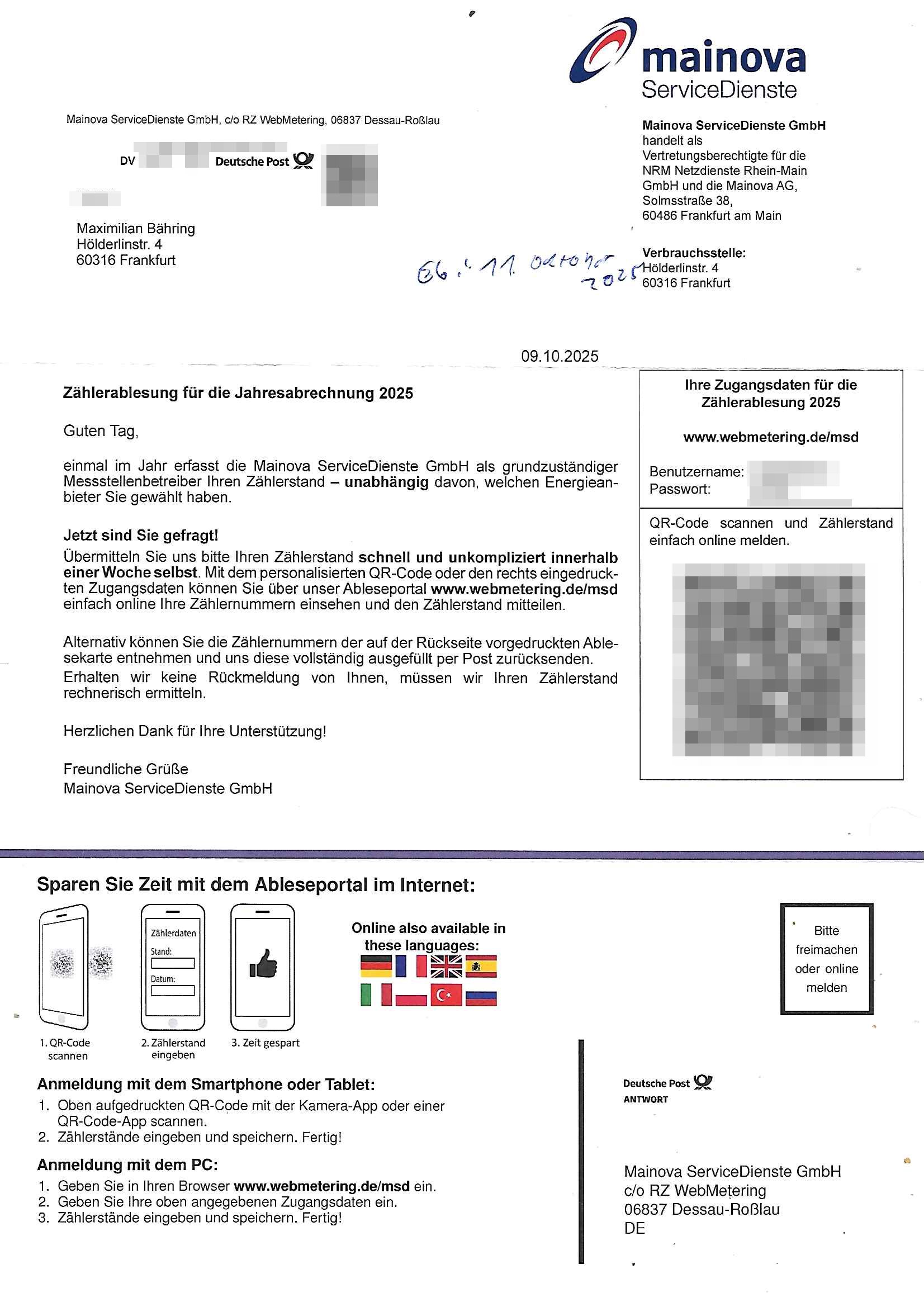 12.10.2025 03:31 -------- Nachricht -------- Betreff: Zählerstandsablesung Mainova AG Datum: Mon, 6 Oct 2025 11:23:55 +0200 Von: noreply@mainova.de <no.reply@mainova.de> An: *** Sehr geehrter Herr Bähring, mit Ihrem Mainova-Vertrag haben Sie sich für die einfache Online-Übermittlung Ihres Zählerstands entschieden. Bitte erfassen Sie den Zählerstand für die Zählernummer(n) Strom - Zählernummer: 1DZG0062482338 (Marktlokations-ID: 50667855934) für die Lieferadresse Hölderlinstr. 4 Zusatzinformation: 6.OG re. bis zum 19.10.2025 in Ihrem persönlichen Mainova OnlineService. Einfach und bequem, rund um die Uhr. Über den nachfolgenden Link können Sie sich direkt mit Ihren Zugangsdaten anmelden: https://www.mainova.de/de/onlineservice/uc03/zaehlerstand Alternativ können Sie uns Ihren Zählerstand einfach unter www.mainova.de/zaehlerstand-melden mitteilen. Ganz ohne Login. Bitte halten Sie dafür Ihre Kundennummer bereit. Sollten wir bis zum oben genannten Termin keinen Zählerstand von Ihnen erhalten haben, werden wir Ihren Verbrauch anhand der Vorjahresdaten rechnerisch ermitteln. Freundliche Grüße Ihr Mainova Kundenservice www.mainova.de/onlineservice DIES IST EINE AUTOMATISCH GENERIERTE NACHRICHT. Bitte antworten Sie nicht auf diese E-Mail. Wenn Sie sich an uns wenden möchten, können Sie dies ganz einfach per Kontaktformular: www.mainova.de/kontakt -------- Nachricht -------- Betreff: Speicherung Ihrer Zählerstände Datum: Tue, 7 Oct 2025 15:57:23 +0200 Von: noreply@mainova.de <no.reply@mainova.de> An: *** Sehr geehrter Herr Bähring, vielen Dank für die Übermittlung Ihres aktuellen Zählerstands 615 für die Zählernummer ***. Wir haben die Angaben in unserem System gespeichert. Ihr Kundenkonto ist damit auf dem neuesten Stand. Schauen Sie gerne noch einmal nach: Die Vertragsdaten finden Sie zentral in Ihrem persönlichen Login-Bereich. Einfach und bequem, flexibel und effizient – der Mainova OnlineService bietet Ihnen umfassenden Kundenservice rund um die Uhr. Jetzt einloggen: https://www.mainova.de/de/onlineservice/uc03/zaehlerstand Freundliche Grüße Ihr Mainova Kundenservice www.mainova.de/onlineservice DIES IST EINE AUTOMATISCH GENERIERTE NACHRICHT. Bitte antworten Sie nicht auf diese E-Mail. Wenn Sie sich an uns wenden möchten, können Sie dies ganz einfach per Kontaktformular: www.mainova.de/kontakt === Anrufe Datum Name / Rufnummer *** Eigene Rufnummer Dauer (hh:mm) 07.10.25 16:04 08000004263 *** 6967831634 0:19 07.10.25 15:26 06980088012 *** 6967831634 0:04 === Zeitraum 07.10.2025 16:04:34 Dauer 18:43 Eigene Rufnummer 06967831634 Status Ausgehende Gesprächspartner 08000004263 Typ Anruf Zeitraum Zeitraum 07.10.2025 15:26:03 Dauer 03:12 Eigene Rufnummer 06967831634 Status Ausgehende Gesprächspartner 06980088012 Typ [0] "202510120331-0-1.jpg" [1] "202510120331-0-2.jpg" [2] "202510120331-0-3.jpg" [3] "202510120331-0-4.jpg" [4] "202510120331-0-5.jpg" [5] "202510120331-0-6.jpg" [6] "202510120331-0-7.jpg" |