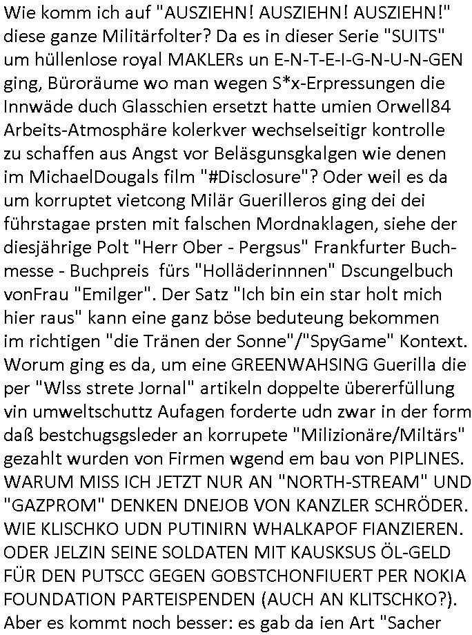 16.10.2025 04:00 Ich hab ja schon wiederrichtig gute Laune, kaum hatte ich mich bei der Polizei in Hamburg gemeldet vogstren gabes gestren dann Meldungen über die (Zeugenshcutz Code) "Mossad Abteilung 8200" Zeuge die Sonderbe-handlungen erhalten und einen geräumte Gerichtssaal. So kann dann logscherise auch kein Dritter aus dem Publikum / von der ress sagn daß das gar nicht die richtigen Zeugen sind, das man da versucht hat einen stalinistzchen Showprozess zu führen ähnlche dem was auf ZDFinfo über den Spionage-prozess gegen Oppenheier lief der posthum rehabilitiert werden musste. Wirt obe idner bild zatung parngten eldunegn üer Wuatsubüche iens cholerischn Pistorius den ich shcon lange schritflich zum Rücktritt auffoderte, im Parlamant hat seine Koalition ja das zegen alle Umfragen eindeutig keinerlei veölkerungs-Rückhalt mehr, die AfD ist in fast allen Umrfagn längst vor der CDU, das Wahl-Volk ist stinksauer über die Wahlbetrügereien von Merz der geaudie selebshcuiiße macht wie Scholz. Dazu gab es weiter oben auf der BIld-Online Website getsren wieder mal Nachrichten über angclieh "Manövertote" vonden es in Fachkrisn imwmr wider heißt dabei handele es sich in Wahrheit um regerchte militärinterne Hinrichtungen die dann offizeill als Unfall getarnt werden. Parllelljustiz wiel in Dsuchalnd das jüdische udnfrmdtsämmige Adelshaus GroßKaitalrgeirt aber schon seit Jahrn nicht mehr das deutche volk, siehe die Ukrien "Waffen ggen Rohstoffe - Habbuegrer Altegusmfragen in der Ukraine" und mit der Bible/Altes Testament begründeten Gebietsansprüchen israelischern Zisisten auf Palästina gerade gewaltsam durchgesetzt mit einem Massenmord an zigtausenden unschuldiegen Palästinensern die sich notwehrten am 07. Oktober gen das was ihnen Netanjahu-Israel antut. Wei esgta, ich hab mich vorgestren gemdlet, udn gestern stand deis schwachnsinn üer zeugen sonderbehandlkung in der zeitung sowie über ELEKTROSCHE TAGEBÜCHER die "christna BLOGck aus HMBUG" zurückhält ganz ähnlich "[schülerzeitung]E[xtra]P[lattjuwelenedel]STEIN-AKTE" (RAF Terroristein Daniele Klette Raub bei Juwelier Zeus zur Fluchtfinanzierzung nach dem Sprengtsoffsnchlag auf Herrhausen) im Kidnappingvarfahren. Ein maniplation duch Korrute Führugssptze polzsten udn AUSLÄNDISCHE geheimagenten jagt die nächste, von einem Rechtsstaat kann heir defitiv nicht mehr die Rede sein, inder BRD, das ist spästestens seit Fotefritz Merz eine Militärdiktatur die sich aus dubiosn "Sondervermögen" im Kauksus Öl/Gas/geschäft (Nawalny) finanziertm,sie whalkmapf-spenden/Präsidentenerpressungen (z.B.: Wulff). Es gab dan auch prompt noch Mdlugen üer briante email die im EPSTEIN fall das britische Könighaus daß ja zur zeit wiederver-einigung shcon in der ukrien erishchirne wollte schwer belasten. Feltnuch noch die Nennug von Cyber-Mafia Rothschild und Metllegtsslcft Öl gedlscähe Merton sowei "Olympia Kurpark Reiterclique" von der Leyen. https://www.bild.de/regional/hamburg/17-prozesstag-im-live-ticker-warum-vermittelte-dieser-spion-die-entfuehrer-an-christina-block-68ee37f90a0257c8ba896e8a https://www.bild.de/politik/inland/berlin-pistorius-wutausbruch-wegen-wehrdienst-gesetz-in-spd-fraktion-68ef398106329773ec672701 https://www.bild.de/unterhaltung/stars-und-leute/prinz-andrew-brisante-e-mail-an-jeffrey-epstein-aufgetaucht-68edeaaedd2b5af37a7b6f2f [0] "202510160400-0-1.jpg" [1] "202510160400-0-2.jpg" [2] "202510160400-0-3.jpg" |
