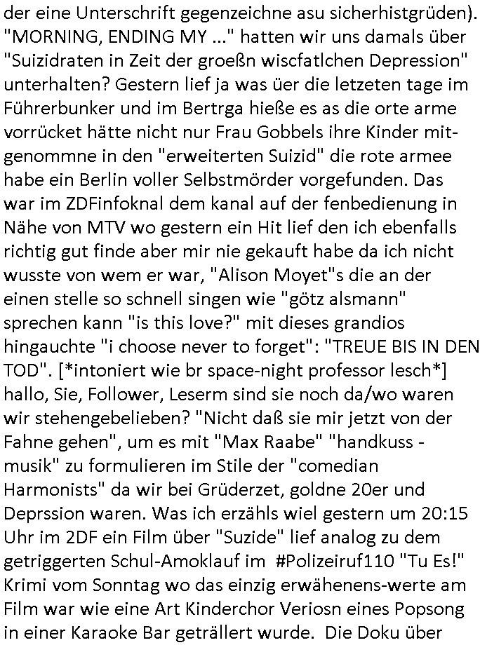 der eine Unterschrift gegenzeichne asu sicherhistgrüden). "MORNING, ENDING MY ..." hatten wir uns damals über "Suizidraten in Zeit der groeßn wiscfatlchen Depression" unterhalten? Gestern lief ja was üer die letzeten tage im Führerbunker und im Bertrga hieße es as die orte arme vorrücket hätte nicht nur Frau Gobbels ihre Kinder mit-genommne in den "erweiterten Suizid" die rote armee habe ein Berlin voller Selbstmörder vorgefunden. Das war im ZDFinfoknal dem kanal auf der fenbedienung in Nähe von MTV wo gestern ein Hit lief den ich ebenfalls richtig gut finde aber mir nie gekauft habe da ich nicht wusste von wem er war, "Alison Moyet"s die an der einen stelle so schnell singen wie "götz alsmann" sprechen kann "is this love?" mit dieses grandios hingauchte "i choose never to forget": "TREUE BIS IN DEN TOD". [*intoniert wie br space-night professor lesch*] hallo, Sie, Follower, Leserm sind sie noch da/wo waren wir stehengebelieben? "Nicht daß sie mir jetzt von der Fahne gehen", um es mit "Max Raabe" "handkuss - musik" zu formulieren im Stile der "comedian Harmonists" da wir bei Grüderzet, goldne 20er und Deprssion waren. Was ich erzähls wiel gestern um 20:15 Uhr im 2DF ein Film über "Suzide" lief analog zu dem getriggerten Schul-Amoklauf im #Polizeiruf110 "Tu Es!" Krimi vom Sonntag wo das einzig erwähenens-werte am Film war wie eine Art Kinderchor Veriosn eines Popsong in einer Karaoke Bar geträllert wurde. Die Doku über