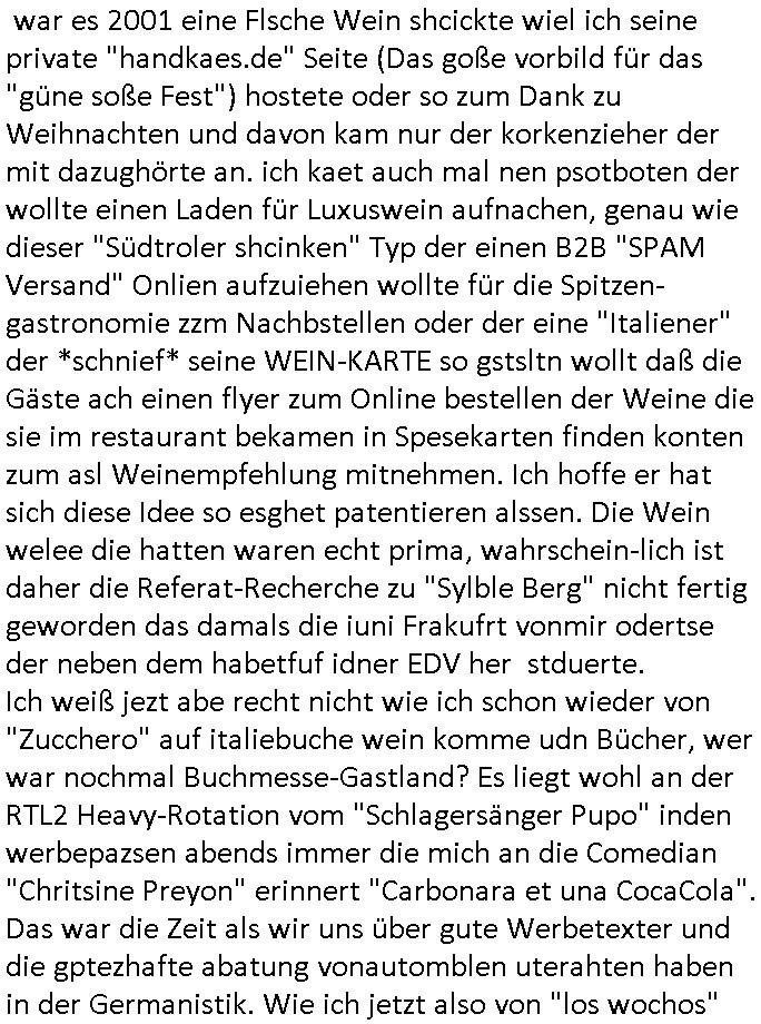 war es 2001 eine Flsche Wein shcickte wiel ich seine private "handkaes.de" Seite (Das goße vorbild für das "güne soße Fest") hostete oder so zum Dank zu Weihnachten und davon kam nur der korkenzieher der mit dazughörte an. ich kaet auch mal nen psotboten der wollte einen Laden für Luxuswein aufnachen, genau wie dieser "Südtroler shcinken" Typ der einen B2B "SPAM Versand" Onlien aufzuiehen wollte für die Spitzen-gastronomie zzm Nachbstellen oder der eine "Italiener" der *schnief* seine WEIN-KARTE so gstsltn wollt daß die Gäste ach einen flyer zum Online bestellen der Weine die sie im restaurant bekamen in Spesekarten finden konten zum asl Weinempfehlung mitnehmen. Ich hoffe er hat sich diese Idee so esghet patentieren alssen. Die Wein welee die hatten waren echt prima, wahrschein-lich ist daher die Referat-Recherche zu "Sylble Berg" nicht fertig geworden das damals die iuni Frakufrt vonmir odertse der neben dem habetfuf idner EDV her stduerte. Ich weiß jezt abe recht nicht wie ich schon wieder von "Zucchero" auf italiebuche wein komme udn Bücher, wer war nochmal Buchmesse-Gastland? Es liegt wohl an der RTL2 Heavy-Rotation vom "Schlagersänger Pupo" inden werbepazsen abends immer die mich an die Comedian "Chritsine Preyon" erinnert "Carbonara et una CocaCola". Das war die Zeit als wir uns über gute Werbetexter und die gptezhafte abatung vonautomblen uterahten haben in der Germanistik. Wie ich jetzt also von "los wochos"
