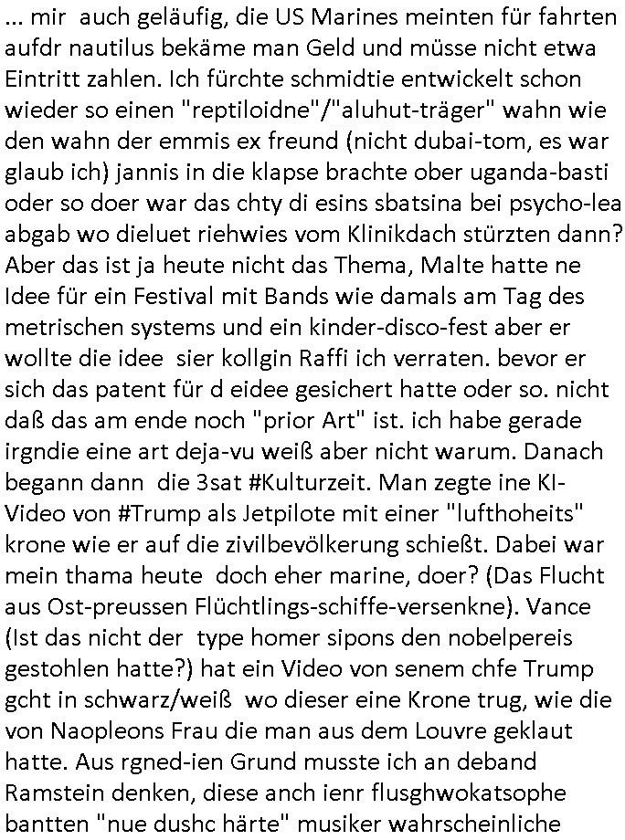 Adolfs Hochzeit im Führerbunker fand ich besser. [*intoniert wie ien beliebiger Leherr in der ersten Stund genervt einem shcüler gegeüber*] Ich versteh ja daß es schwierig ist mit dem Wachwerden. Soviel zum Thema Amoklauf-Terrorismus / Kriegs-"Slebstmord-kommado" (hatte ich das nicht mal als "Nickname") #SCHLÄFERn! (die examinierte krankenschwester aus der redkation riet mir übrigens mal sich nicht wie bei nem allrgeitest quer sondern der länge nach zu ritzen wenn die es nicht mehr schaffen sollen das wieder zusmmenzunähen, ich hab ja mal leuten die tür eintreten lassen wiel da sie in der schülerzeitung anleitungen zum suizide abdrucken wollten wies die "DGHS"/"Dignitas schweiz?" empfiehlt für krebskranke mitschüler: "TOD IN DER WANNE" , ich fand das ging weit über die übliche Milär-kriegstreiber Propaganda sich ien selbstmötderischen Unternehmen anzushcließen hinaus die zteungn sonst so abdrucken um die junge Generation inausshclsoe Atomkrieg zu hetzen). "Is this love" ist ja durchaus ien terssate frage wenn man sich mit Soldten Vegrlgungen-Schwagershften beschäftigt. Gestren hat die Farbbueta-atatcke "Grüne Partei" für ein Modell eine Art Wiedereinführung der Wehrpflicht (auch für frauen) Gefoderte, in den Nachrichten gestren war eien Politker der CDU as BaWü im Interview (wo die Grünen gerade das Verbrenneraus durchstzen wollen) den fand ich wesentlich bessre als Brandmauer Merz weil er einen LÖSUNSGORIENTIERTES