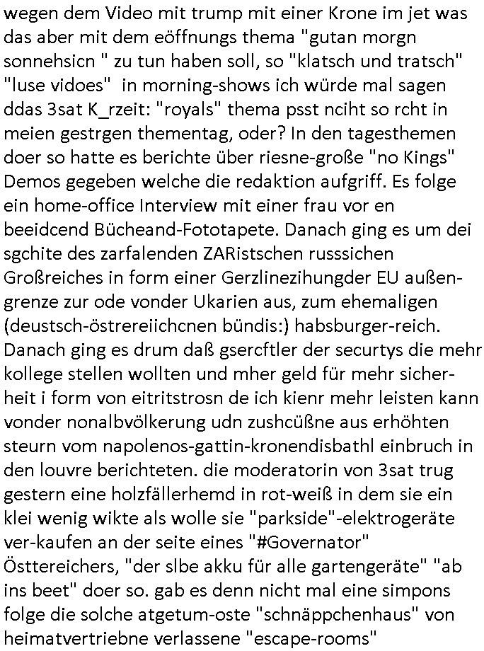 Frühprogramm Erweckunsgerlebnos mit fanatischen Anhängern a.k.a. "#WOKE" bewegung, ich einnere nur mal an die McSpicy "ketchup-Expertin" mit dem krell- gelben hemd im china muster Stalkerin welche "Sat1" #merkumussweg eine "Akte Sondersendung" widmete. Wer konnte denn ahnen daß Frisurkritik immer noch so ein solches Tabuthema ist in der nach gas-gerd Schröder Ära: (Hair) "Helmfrisur" und "good morning Starshine" , ich dachte diese düsteren Zeiten seien längst vorbei ! Jetzt hab ich aber total den Faden verloren glaub ich. Am besten wir machen einen "SCHNITT" as gäb es keine Wirtschaftsluaten-massntalssung Arbeistlosigkiet und danach gehts weiter mit TV-Kritik zum Vorbndprogramm von 18:00 Uhr vo egstren, Montag 20. Oktober 2025. gestern: "social Media" asu "smtphoens" macht süchtig behauptete die pro7 newstime udn es gab ein experiment wo man ohen freie meinungäußerung/presse auskommt: natürlich nicht, lieferrando-aus- "wählen ohne telefon" der staat will wieder mehr frontal-propaganda aus dem TV daß der bevölkerung die meinung vorgbit und damit man besser vetshet was Dikatatoren wollen draf nicht untereinander geredet werden beim Fernsehen, etwa einem Fußbal Länderspiel wo die Fans in der kneipe die Bidlrähre anbrüllen u spiler anzuferen die sie nicht hören können, asl säaßen sie asl Pyrtschnik züdenden Hooliagns auf der Stimmung mchenden stdion-tribüne. TRump nut dise Elemtn ja sher
