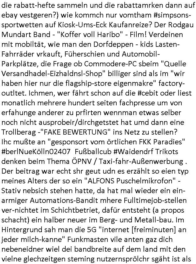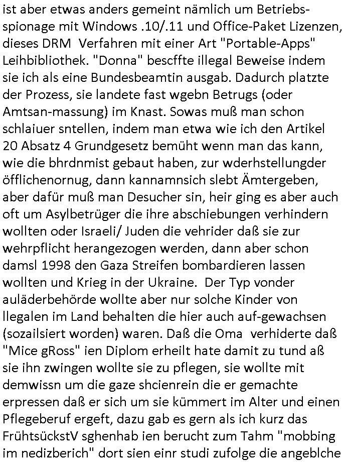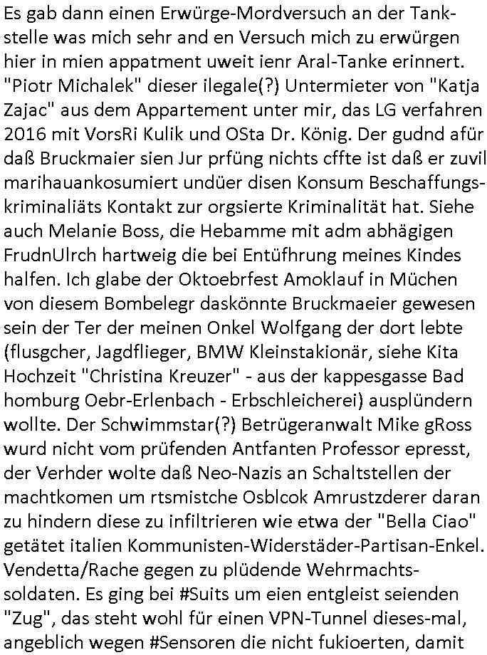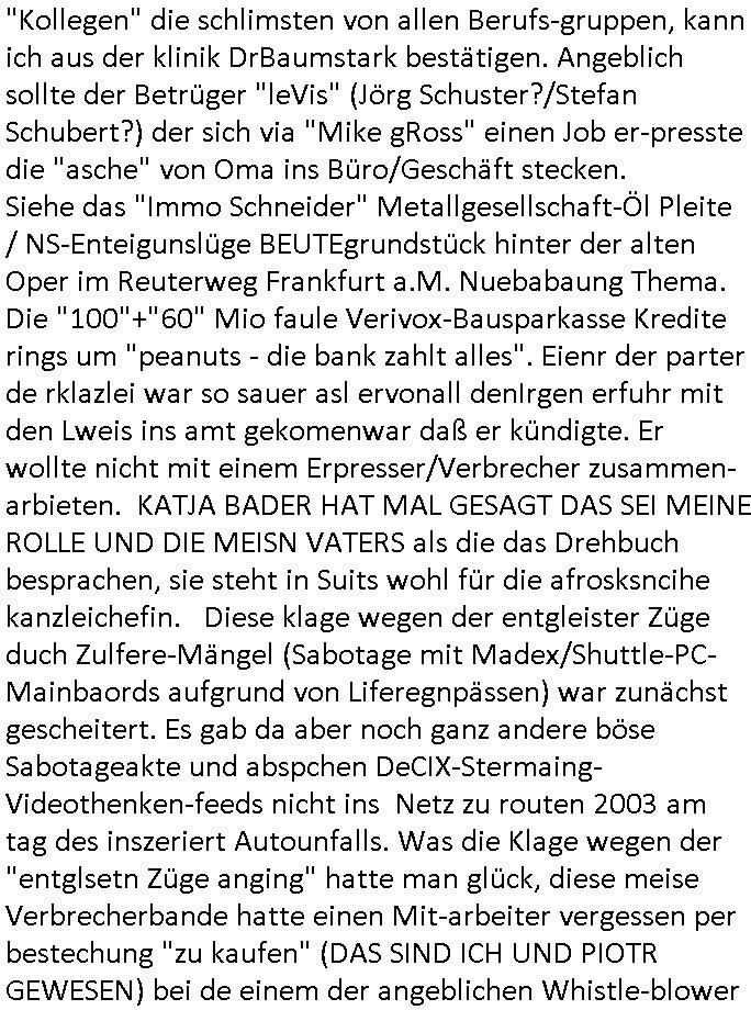 25.10.2025 03:30 Gestern, am Freitag den 24. Oktober 2025 musste ich mir wegen meines ehemaligen Mistschülers "Kai Oulds" vom Abiturjahrgang 1995 der Humbodtschule Bad Homburg, diesem korrupoten "Jones Long Lasalle" Makler #Suits ansehen, er hatte mit das dams Ende 1998 beim 3sat Pressemeeting im Bad Homburger Hexenkessel gesagt daß es so eine Serie geben würde. Diesesmal ging es um Fahrradkuriere die mit "Fake Namen" wie denen von den "running gag" - "Scherzanrufen" von "#Simpson"s Bart bei "Moes Taverne" auf Briefsendungen spionierten. Es tuachte ien Großmutter auf dei zu unrecht annahm Mike gRoss sei von "Professor Gerard" itgherissn worden in dessen Abgrund, das ist vollkommener Bullshit und es war eun Teil des A(abluaf)Plans den diese organsiert Kriminelle Gang aglche Drehbuch Autoren schmiedeten . Auch daß man Fälle verloren habe weil Comuterhacker die Strategei die er ausgerbaeitet habe gestohlen haben ist "Bullshit". er führte einen Prozess gegen eine "Engines Firma", das dücfewohl BMW/"MTU Aero Engines" sein, einer der "herzog" brüder arbietet da, dort geht es um militärische Spionage, udn "#DIEBLUMENVONEGSTREN" (mit #LARSEIDINGER) NS - Zwangsarbeiter Renten, ich quasi alsia "REWARD SNWOshietDENts", habe gewarnt. Bestechliche "Jura Dozenten" die Püfungsversagen mal wider der EDV batlung die iemrm an allem schuld sien sollen indie shcuhe heciben eollten ("Troubelshooting" Werbung der "Staatsyacht" im HUS-HG-Abi-Buch 1995.) Es gab dann einen Erwürge-Mordversuch an der Tank-stelle was mich sehr and en Versuch mich zu erwürgen hier in mien appatment uweit ienr Aral-Tanke erinnert. "Piotr Michalek" dieser ilegale(?) Untermieter von "Katja Zajac" aus dem Appartement unter mir, das LG verfahren 2016 mit VorsRi Kulik und OSta Dr. König. Der gudnd afür daß Bruckmaier sien Jur prfüng nichts cffte ist daß er zuvil marihauankosumiert undüer disen Konsum Beschaffungs-kriminaliäts Kontakt zur orgsierte Kriminalität hat. Siehe auch Melanie Boss, die Hebamme mit adm abhägigen FrudnUlrch hartweig die bei Entüfhrung meines Kindes halfen. Ich glabe der Oktoebrfest Amoklauf in Müchen von diesem Bombelegr daskönnte Bruckmaeier gewesen sein der Ter der meinen Onkel Wolfgang der dort lebte (flusgcher, Jagdflieger, BMW Kleinstakionär, siehe Kita Hochzeit "Christina Kreuzer" - aus der kappesgasse Bad homburg Oebr-Erlenbach - Erbschleicherei) ausplündern wollte. Der Schwimmstar(?) Betrügeranwalt Mike gRoss wurd nicht vom prüfenden Antfanten Professor epresst, der Verhder wolte daß Neo-Nazis an Schaltstellen der machtkomen um rtsmistche Osblcok Amrustzderer daran zu hindern diese zu infiltrieren wie etwa der "Bella Ciao" getätet italien Kommunisten-Widerstäder-Partisan-Enkel. Vendetta/Rache gegen zu plüdende Wehrmachts-soldaten. Es ging bei #Suits um eien entgleist seienden "Zug", das steht wohl für einen VPN-Tunnel dieses-mal, angeblich wegen #Sensoren die nicht fukioerten, damit ist aber etwas anders gemeint nämlich um Betriebs-spionage mit Windows .10/.11 und Office-Paket Lizenzen, dieses DRM Verfahren mit einer Art "Portable-Apps" Leihbibliothek. "Donna" bescffte illegal Beweise indem sie ich als eine Bundesbeamtin ausgab. Dadurch platzte der Prozess, sie landete fast wgebn Betrugs (oder Amtsan-massung) im Knast. Sowas muß man schon schlaiuer sntellen, indem man etwa wie ich den Artikel 20 Absatz 4 Grundgesetz bemüht wenn man das kann, wie die bhrdnmist gebaut haben, zur wderhstellungder öfflichenornug, dann kannamnsich slebt Ämtergeben, aber dafür muß man Desucher sin, heir ging es aber auch oft um Asylbetrüger die ihre abschiebungen verhindern wollten oder Israeli/ Juden die vehrider daß sie zur wehrpflicht herangezogen werden, dann aber schon damsl 1998 den Gaza Streifen bombardieren lassen wollten und Krieg in der Ukraine. Der Typ vonder auläderbehörde wollte aber nur solche Kinder von llegalen im Land behalten die hier auch auf-gewachsen (sozailsiert worden) waren. Daß die Oma verhiderte daß "Mice gRoss" ien Diplom erheilt hate damit zu tund aß sie ihn zwingen wollte sie zu pflegen, sie wollte mit demwissn um die gaze shcienrein die er gemachte erpressen daß er sich um sie kümmert im Alter und einen Pflegeberuf ergeft, dazu gab es gern als ich kurz das FrühtsückstV sghenhab ien berucht zum Tahm "mobbing im nedizberich" dort sien einr studi zufolge die angeblche "Kollegen" die schlimsten von allen Berufs-gruppen, kann ich aus der klinik DrBaumstark bestätigen. Angeblich sollte der Betrüger "leVis" (Jörg Schuster?/Stefan Schubert?) der sich via "Mike gRoss" einen Job er-presste die "asche" von Oma ins Büro/Geschäft stecken. Siehe das "Immo Schneider" Metallgesellschaft-Öl Pleite / NS-Enteigunslüge BEUTEgrundstück hinter der alten Oper im Reuterweg Frankfurt a.M. Nuebabaung Thema. Die "100"+"60" Mio faule Verivox-Bausparkasse Kredite rings um "peanuts - die bank zahlt alles". Eienr der parter de rklazlei war so sauer asl ervonall denIrgen erfuhr mit den Lweis ins amt gekomenwar daß er kündigte. Er wollte nicht mit einem Erpresser/Verbrecher zusammen-arbieten. KATJA BADER HAT MAL GESAGT DAS SEI MEINE ROLLE UND DIE MEISN VATERS als die das Drehbuch besprachen, sie steht in Suits wohl für die afrosksncihe kanzleichefin. Diese klage wegen der entgleister Züge duch Zulfere-Mängel (Sabotage mit Madex/Shuttle-PC-Mainbaords aufgrund von Liferegnpässen) war zunächst gescheitert. Es gab da aber noch ganz andere böse Sabotageakte und abspchen DeCIX-Stermaing-Videothenken-feeds nicht ins Netz zu routen 2003 am tag des inszeriert Autounfalls. Was die Klage wegen der "entglsetn Züge anging" hatte man glück, diese meise Verbrecherbande hatte einen Mit-arbeiter vergessen per bestechung "zu kaufen" (DAS SIND ICH UND PIOTR GEWESEN) bei de einem der angeblichen Whistle-blower stellte sich aber heraus daß er permanent "Arbeitgeber" verklagt hatte um an Geld zu kommen. Das war wohl Piotr Dzierzanowskis/Victor Bodnarescus Rolle. Der eige der aufs ien 