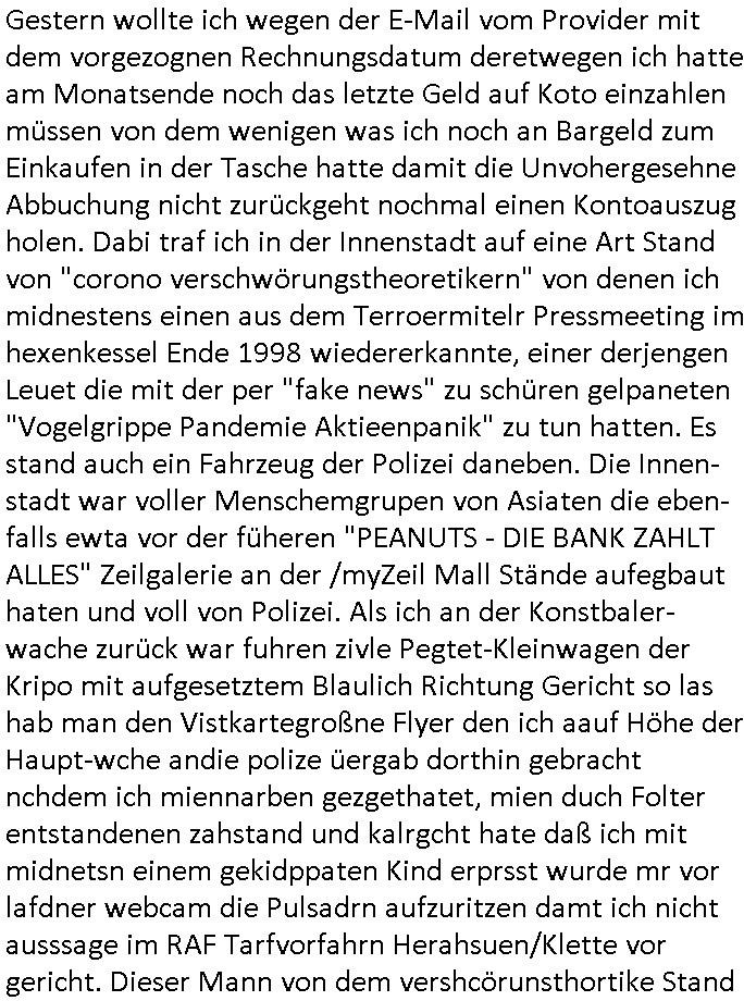 01.11.2025 05:45 Gestern wollte ich wegen der E-Mail vom Provider mit dem vorgezognen Rechnungsdatum deretwegen ich hatte am Monatsende noch das letzte Geld auf Koto einzahlen müssen von dem wenigen was ich noch an Bargeld zum Einkaufen in der Tasche hatte damit die Unvohergesehne Abbuchung nicht zurückgeht nochmal einen Kontoauszug holen. Dabi traf ich in der Innenstadt auf eine Art Stand von "corono verschwörungstheoretikern" von denen ich midnestens einen aus dem Terroermitelr Pressmeeting im hexenkessel Ende 1998 wiedererkannte, einer derjengen Leuet die mit der per "fake news" zu schüren gelpaneten "Vogelgrippe Pandemie Aktieenpanik" zu tun hatten. Es stand auch ein Fahrzeug der Polizei daneben. Die Innen- stadt war voller Menschemgrupen von Asiaten die eben-falls ewta vor der füheren "PEANUTS - DIE BANK ZAHLT ALLES" Zeilgalerie an der /myZeil Mall Stände aufegbaut haten und voll von Polizei. Als ich an der Konstbaler-wache zurück war fuhren zivle Pegtet-Kleinwagen der Kripo mit aufgesetztem Blaulich Richtung Gericht so las hab man den Vistkartegroßne Flyer den ich aauf Höhe der Haupt-wche andie polize üergab dorthin gebracht nchdem ich miennarben gezgethatet, mien duch Folter entstandenen zahstand und kalrgcht hate daß ich mit midnetsn einem gekidppaten Kind erprsst wurde mr vor lafdner webcam die Pulsadrn aufzuritzen damt ich nicht ausssage im RAF Tarfvorfahrn Herahsuen/Klette vor gericht. Dieser Mann von dem vershcörunsthortike Stand dem ich das erzählt habe ist ein Justiz-KTUler meines Wissens nach, er hat mir auch erzählt nachdem ich sagte daß ich in der Netz-poltik aktiv bin daß er den aufbau eiens Widerständler-Netzes plane auf Docker-basis udn fragt mich zumCCC asu, ich sgte ihm daß ich beim Intrnet-Onlinbbamking aufbau maßgelich miewikt habe DeCIX/interxion Hanauer-Land-planugen kannte üer die arbeit mer mItter im banken-sicherheits-arbeitgeber-verband undaß ich ein BGP Peering nahe des CCC unterhalte eines von mehereren falls er ien verfäschte version meiner Website sehen würde und wies ihn darauf hin daß ich getestet hätte daß miN Blog und die wbstiets aufde flyer vom Elektronikmarkt bei myZeil aus auf den vorführ-geräten dort aus abrufbar sind genau wie vonItrenecafes hier, dortkönn er gebenflsl gegnprüfen ob die Version die er erhalte durch MITM - Manipullation zensierter, kompromittteret oder verändert sei. Ich war wirk-lich sher beruhigt gestern daß Doandl Trump nch 33 jahrn pause endlich mal wieder "DIE SONNE aufgehen lässt" so wie in "fatBoySlims" Sonrise/BirdOfPrey, er hat ja neue Atom-waffetest anagkügte udn zetnah daz gab es Dohuge der Russen gegen (das NATO - Hauptquarter in ) Brüssel und wider einen gesperrten Flughafen in Berlin wegen Drohnen-sichtugen Terrororgansiations Cuise-Missiles vor denen ich ja shcon 2013 warnte bevro sich der Bundes-tag und EU mit der Frag der Regfluation beschäftitgten. Der letzte atom test (wurdn damsl nicht "Greenpeace" terroristen verhaftet und deren Boote versenkt von den franzosen wegen Spionage) fällt in die Nachwende-Zeit, im Jahr 1992 sei das gewesn schreibt die "Bild-Zeitung". Frankreichs ex-Päsident sitzt jetzt im Knast und aus ds britische Köngshaus hat wegen irgendwelcher Unter-schriften heftige probelme was Europas Atommächte betrifft, ich wieß ja nicht welchenn militärischen Rang Prinz Andrew hat so von wegen "Lufthoheit-KI-Videos" die Donald Trump verbreiten ließ auf denen die eigene Bevölkerung bombardiert wird. Ich erinnere mich daß einr der Royals vor der verweigerten Untershrift Bank-Budpräsdnet Horst Köhlers unter das nach "9/11" neue "Luftsischerheitsgesetz" mit für dei Kontrolle des NATO luftraums duchdei Siegrmächte eür der BRD zustädg war. Bin mir da aber nicht 100%ig sicher. Bitte überprüfen. Dei Chinesn habn derweil in den Medien heir darstellen wollen daß Eiegung im Zoll Streit und Atom-Drohungen zeitlich im exakte selben augen-blick geschehen, es kann sich also nur um Zufall handeln daß China genau in dem Moment unterschreibt als die USA nukleare Massen-vernichtung ins Spiel bringen das hat mit rehctugültgen aufgezwungenen Unterschriften also nichst zu tun. Die chisne bracuhne den Westen als Absatzmarkt (etwa für eAutos oder uch "es gibt ein peer mher auf Huawei" Elektronik) sonst ist der Aufschwung duch Exporte asu den Sonderwirtschaftszonen futsch. Der gloabls süden ist zwar ien goer makrt hab er kein Geld. https://www.bild.de/politik/ausland-und-internationales/trump-schock-in-china-explodieren-bald-wieder-atombomben-690325f7ce65bea0d55e4a39 https://www.bild.de/news/inland/fluege-umgeleitet-drohnen-alarm-am-berliner-flughafen-69052c74a6bc3e9242fc87f3 https://www.bild.de/politik/ausland-und-internationales/putin-vertrauter-droht-nato-land-dann-wird-belgien-verschwinden-6904dfaca6bc3e9242fc84e2 https://www.bild.de/unterhaltung/royals-adel/koenig-charles-zieht-schlussstrich-seine-handschrift-williams-sieg-690494f36af191ff5d2887e5 https://www.bild.de/unterhaltung/stars-und-leute/nicolas-sarkozy-im-gefaengnis-carla-bruni-besucht-ihren-mann-6904e3dbb9e7d6b545d108fc [0] "202511010545-0-1.jpg" [1] "202511010545-0-2.jpg" [2] "202511010545-0-3.jpg" [3] "202511010545-0-4.jpg" |