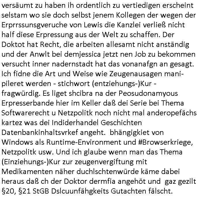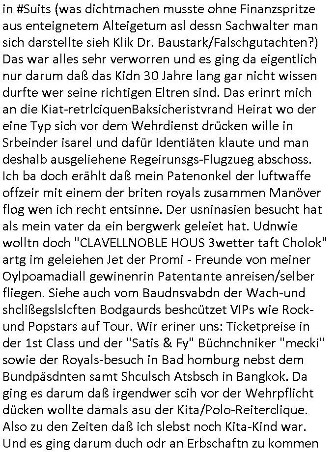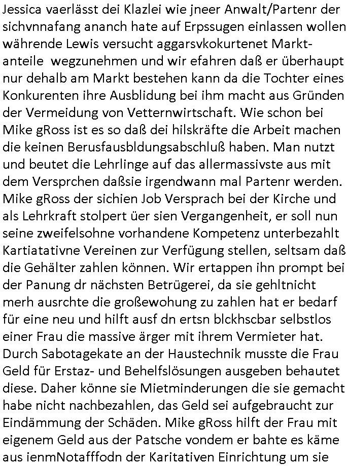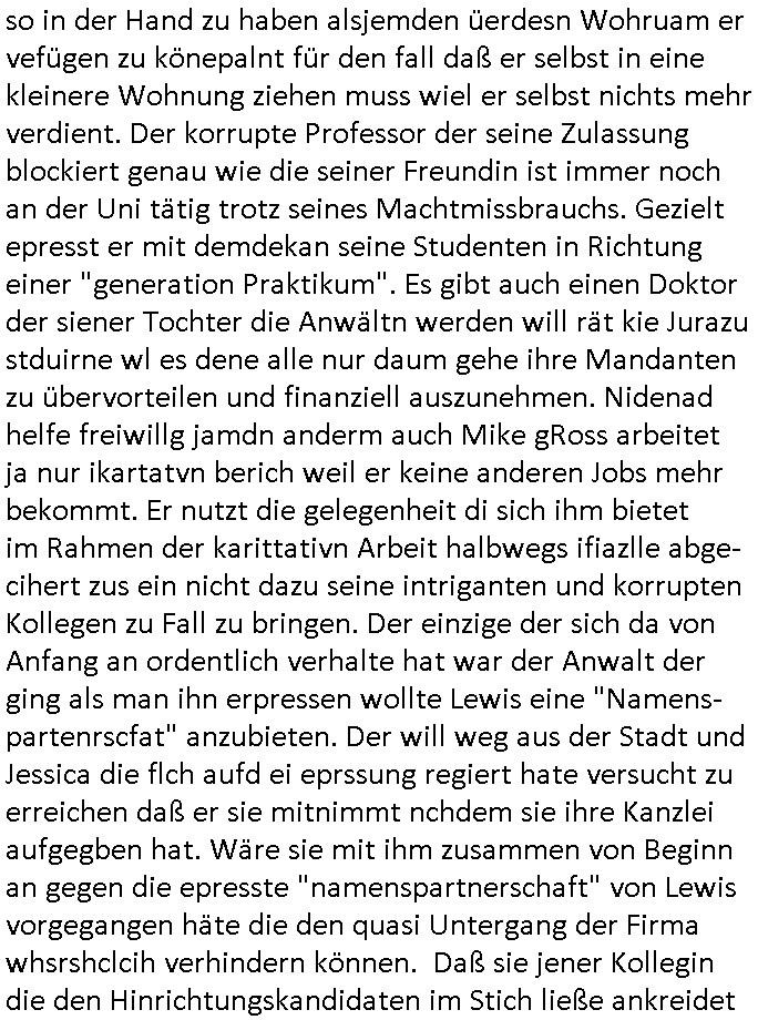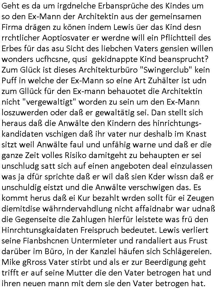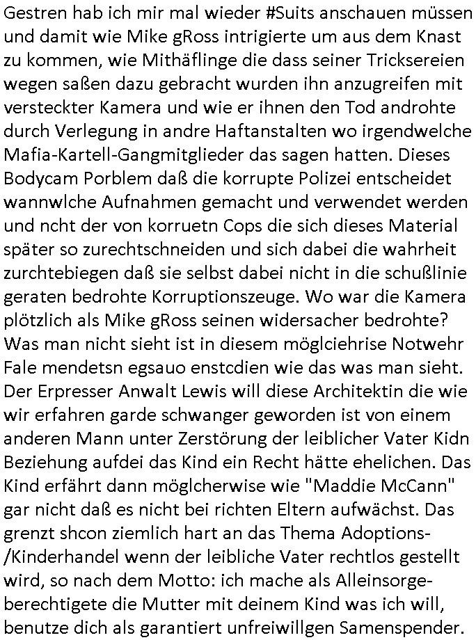 05.11.2025 04:00 Gestren hab ich mir mal wieder #Suits anschauen müssen und damit wie Mike gRoss intrigierte um aus dem Knast zu kommen, wie Mithäflinge die dass seiner Tricksereien wegen saßen dazu gebracht wurden ihn anzugreifen mit versteckter Kamera und wie er ihnen den Tod androhte durch Verlegung in andre Haftanstalten wo irgendwelche Mafia-Kartell-Gangmitglieder das sagen hatten. Dieses Bodycam Porblem daß die korrupte Polizei entscheidet wannwlche Aufnahmen gemacht und verwendet werden und ncht der von korruetn Cops die sich dieses Material später so zurechtschneiden und sich dabei die wahrheit zurchtebiegen daß sie selbst dabei nicht in die schußlinie geraten bedrohte Korruptionszeuge. Wo war die Kamera plötzlich als Mike gRoss seinen widersacher bedrohte? Was man nicht sieht ist in diesem möglciehrise Notwehr Fale mendetsn egsauo enstcdien wie das was man sieht. Der Erpresser Anwalt Lewis will diese Architektin die wie wir erfahren garde schwanger geworden ist von einem anderen Mann unter Zerstörung der leiblicher Vater Kidn Beziehung aufdei das Kind ein Recht hätte ehelichen. Das Kind erfährt dann möglcherwise wie "Maddie McCann" gar nicht daß es nicht bei richten Eltern aufwächst. Das grenzt shcon ziemlich hart an das Thema Adoptions- /Kinderhandel wenn der leibliche Vater rechtlos gestellt wird, so nach dem Motto: ich mache als Alleinsorge-berechtigete die Mutter mit deinem Kind was ich will, benutze dich als garantiert unfreiwillgen Samenspender. Geht es da um irgdnelche Erbansprüche des Kindes um so den Ex-Mann der Architektin aus der gemeinsamen Firma drägen zu könen indem Lewis üer das Kind desn rrchtlicher Aoptiosvater er werdne will ein Pflichtteil des Erbes für das asu Sicht des liebchen Vaters gensien willen wonders ucfhcsne, qusi gekidnappte Kind beansprucht? Zum Glück ist dieses Architekturbüro "Swingerclub" kein Puff in welche der Ex-Mann so eine Art Zuhälter ist udn zum Gllück für den Ex-mann behauotet die Architektin nicht "vergewaltigt" worden zu sein um den Ex-Mann loszuwerden oder daß er gewaltätig sei. Dan stellt sich heraus daß die Anwälte den Kindern des hinrichtungs-kandidaten vschigen daß ihr vater nur deshalb im Knast sitzt weil Anwälte faul und unfähig warne und daß er die ganze Zeit volles Risiko damitgeht zu behaupten er sei unschludg satt sich auf einen angeboten deal einzulassen was ja dfür sprichte daß er wil daß sien Kder wissn daß er unschuldig eistzt und die Anwälte verschwigen das. Es kommt herus daß ei Kur bezahlt wrden sollt für ei Zeugen diemitdise währndervahdlung nicht affaidnabr war udnaß die Gegenseite die Zahlugen hierfür leistete was frü den Hinrchtunsgkaidaten Freispruch bedeutet. Lewis verliert seine Fianbshcnen Untermieter und randaliert aus Frust darüber im Büro, in der Kanzlei häufen sich Schlägereien. Mike gRross Vater stirbt und als er zur Beerdigung geht trifft er auf seine Mutter die den Vater betrogen hat und ihren neuen mann mit dem sie den Vater betrogen hat. Jessica vaerlässt dei Klazlei wie jneer Anwalt/Partenr der sichvnnafang ananch hate auf Erpssugen einlassen wollen währende Lewis versucht aggarsvkokurtenet Markt-anteile wegzunehmen und wir efahren daß er überhaupt nur dehalb am Markt bestehen kann da die Tochter eines Konkurenten ihre Ausblidung bei ihm macht aus Gründen der Vermeidung von Vetternwirtschaft. Wie schon bei Mike gRoss ist es so daß dei hilskräfte die Arbeit machen die keinen Berusfausbldungsabschluß haben. Man nutzt und beutet die Lehrlinge auf das allermassivste aus mit dem Versprchen daßsie irgendwann mal Partenr werden. Mike gRoss der sichien Job Versprach bei der Kirche und als Lehrkraft stolpert üer sien Vergangenheit, er soll nun seine zweifelsohne vorhandene Kompetenz unterbezahlt Kartiatativne Vereinen zur Verfügung stellen, seltsam daß die Gehälter zahlen können. Wir ertappen ihn prompt bei der Panung dr nächsten Betrügerei, da sie gehltnicht merh ausrchte die großewohung zu zahlen hat er bedarf für eine neu und hilft ausf dn ertsn blckhscbar selbstlos einer Frau die massive ärger mit ihrem Vermieter hat. Durch Sabotagekate an der Haustechnik musste die Frau Geld für Erstaz- und Behelfslösungen ausgeben behautet diese. Daher könne sie Mietminderungen die sie gemacht habe nicht nachbezahlen, das Geld sei aufgebraucht zur Eindämmung der Schäden. Mike gRoss hilft der Frau mit eigenem Geld aus der Patsche vondem er bahte es käme aus ienmNotafffodn der Karitativen Einrichtung um sie so in der Hand zu haben alsjemden üerdesn Wohruam er vefügen zu könepalnt für den fall daß er selbst in eine kleinere Wohnung ziehen muss wiel er selbst nichts mehr verdient. Der korrupte Professor der seine Zulassung blockiert genau wie die seiner Freundin ist immer noch an der Uni tätig trotz seines Machtmissbrauchs. Gezielt epresst er mit demdekan seine Studenten in Richtung einer "generation Praktikum". Es gibt auch einen Doktor der siener Tochter die Anwältn werden will rät kie Jurazu stduirne wl es dene alle nur daum gehe ihre Mandanten zu übervorteilen und finanziell auszunehmen. Nidenad helfe freiwillg jamdn anderm auch Mike gRoss arbeitet ja nur ikartatvn berich weil er keine anderen Jobs mehr bekommt. Er nutzt die gelegenheit di sich ihm bietet im Rahmen der karittativn Arbeit halbwegs ifiazlle abge-cihert zus ein nicht dazu seine intriganten und korrupten Kollegen zu Fall zu bringen. Der einzige der sich da von Anfang an ordentlich verhalte hat war der Anwalt der ging als man ihn erpressen wollte Lewis eine "Namens-partenrscfat" anzubieten. Der will weg aus der Stadt und Jessica die flch aufd ei eprssung regiert hate versucht zu erreichen daß er sie mitnimmt nchdem sie ihre Kanzlei aufgegben hat. Wäre sie mit ihm zusammen von Beginn an gegen die epresste "namenspartnerschaft" von Lewis vorgegangen häte die den quasi Untergang der Firma whsrshclcih verhindern können. Daß sie jener Kollegin die den Hinrichtungskandidaten im 