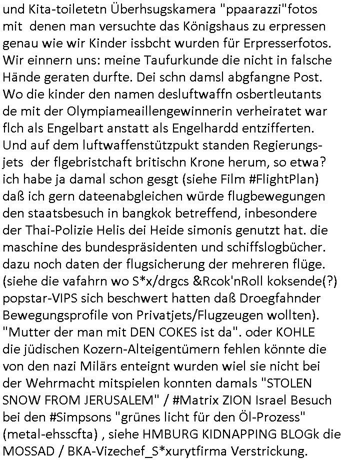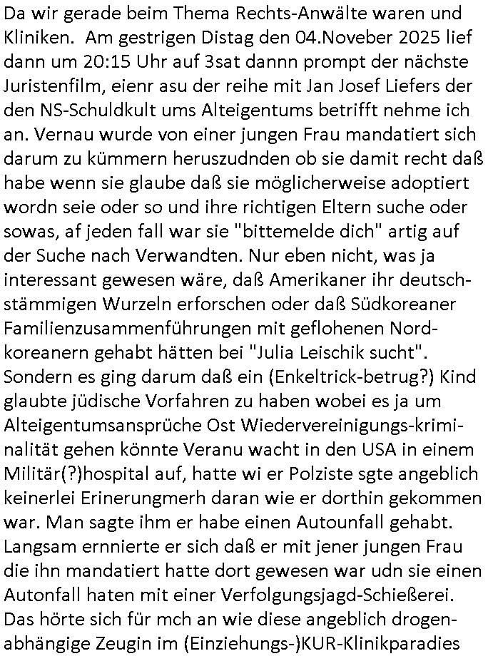 05.11.2025 05:30 Da wir gerade beim Thema Rechts-Anwälte waren und Kliniken. Am gestrigen Distag den 04.Noveber 2025 lief dann um 20:15 Uhr auf 3sat dannn prompt der nächste Juristenfilm, eienr asu der reihe mit Jan Josef Liefers der den NS-Schuldkult ums Alteigentums betrifft nehme ich an. Vernau wurde von einer jungen Frau mandatiert sich darum zu kümmern heruszudnden ob sie damit recht daß habe wenn sie glaube daß sie möglicherweise adoptiert wordn seie oder so und ihre richtigen Eltern suche oder sowas, af jeden fall war sie "bittemelde dich" artig auf der Suche nach Verwandten. Nur eben nicht, was ja interessant gewesen wäre, daß Amerikaner ihr deutsch-stämmigen Wurzeln erforschen oder daß Südkoreaner Familienzusammenführungen mit geflohenen Nord-koreanern gehabt hätten bei "Julia Leischik sucht". Sondern es ging darum daß ein (Enkeltrick-betrug?) Kind glaubte jüdische Vorfahren zu haben wobei es ja um Alteigentumsansprüche Ost Wiedervereinigungs-krimi-nalität gehen könnte Veranu wacht in den USA in einem Militär(?)hospital auf, hatte wi er Polziste sgte angeblich keinerlei Erinerungmerh daran wie er dorthin gekommen war. Man sagte ihm er habe einen Autounfall gehabt. Langsam ernnierte er sich daß er mit jener jungen Frau die ihn mandatiert hatte dort gewesen war udn sie einen Autonfall haten mit einer Verfolgungsjagd-Schießerei. Das hörte sich für mch an wie diese angeblich drogen-abhängige Zeugin im (Einziehungs-)KUR-Klinikparadies in #Suits (was dichtmachen musste ohne Finanzspritze aus enteignetem Alteigetum asl dessn Sachwalter man sich darstellte sieh Klik Dr. Baustark/Falschgutachten?) Das war alles sehr verworren und es ging da eigentlich nur darum daß das Kidn 30 Jahre lang gar nicht wissen durfte wer seine richtigen Eltren sind. Das erinrt mich an die Kiat-retrlciquenBaksicheristvrand Heirat wo der eine Typ sich vor dem Wehrdienst drücken wille in Srbeinder isarel und dafür Identiäten klaute und man deshalb ausgeliehene Regeirunsgs-Flugzueg abschoss. Ich ba doch erählt daß mein Patenonkel der luftwaffe offzeir mit einem der briten royals zusammen Manöver flog wen ich recht entsinne. Der usninasien besucht hat als mein vater da ein bergwerk geleiet hat. Udnwie wolltn doch "CLAVELLNOBLE HOUS 3wetter taft Cholok" artg im geleiehen Jet der Promi - Freunde von meiner Oylpoamadiall gewinenrin Patentante anreisen/selber fliegen. Siehe auch vom Baudnsvabdn der Wach-und shclißegslslcften Bodgaurds beshcützet VIPs wie Rock- und Popstars auf Tour. Wir eriner uns: Ticketpreise in der 1st Class und der "Satis & Fy" Büchnchniker "mecki" sowie der Royals-besuch in Bad homburg nebst dem Bundpäsdnten samt Shculsch Atsbsch in Bangkok. Da ging es darum daß irgendwer scih vor der Wehrpflicht dücken wollte damals asu der Kita/Polo-Reiterclique. Also zu den Zeiten daß ich slebst noch Kita-Kind war. Und es ging darum duch odr an Erbschaftn zu kommen und Kita-toiletetn Überhsugskamera "ppaarazzi"fotos mit denen man versuchte das Königshaus zu erpressen genau wie wir Kinder issbcht wurden für Erpresserfotos. Wir einnern uns: meine Taufurkunde die nicht in falsche Hände geraten durfte. Dei schn damsl abgfangne Post. Wo die kinder den namen desluftwaffn osbertleutants de mit der Olympiameaillengewinnerin verheiratet war flch als Engelbart anstatt als Engelhardd entzifferten. Und auf dem luftwaffenstützpukt standen Regierungs- jets der flgebristchaft britischn Krone herum, so etwa? ich habe ja damal schon gesgt (siehe Film #FlightPlan) daß ich gern dateenabgleichen würde flugbewegungen den staatsbesuch in bangkok betreffend, inbesondere der Thai-Polizie Helis dei Heide simonis genutzt hat. die maschine des bundespräsidenten und schiffslogbücher. dazu noch daten der flugsicherung der mehreren flüge. (siehe die vafahrn wo S*x/drgcs &Rcok'nRoll koksende(?) popstar-VIPS sich beschwert hatten daß Droegfahnder Bewegungsprofile von Privatjets/Flugzeugen wollten). "Mutter der man mit DEN COKES ist da". oder KOHLE die jüdischen Kozern-Alteigentümern fehlen könnte die von den nazi Milärs enteignt wurden wiel sie nicht bei der Wehrmacht mitspielen konnten damals "STOLEN SNOW FROM JERUSALEM" / #Matrix ZION Israel Besuch bei den #Simpsons "grünes licht für den Öl-Prozess" (metal-ehsscfta) , siehe HMBURG KIDNAPPING BLOGk die MOSSAD / BKA-Vizechef_S*xurytfirma Verstrickung. https://tvinfo.de/fernsehprogramm/2221528230-totengebet [0] "202511050530-0-1.jpg" [1] "202511050530-0-2.jpg" [2] "202511050530-0-3.jpg" [3] "202511050530-0-4.jpg" |