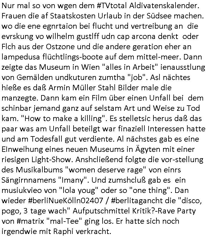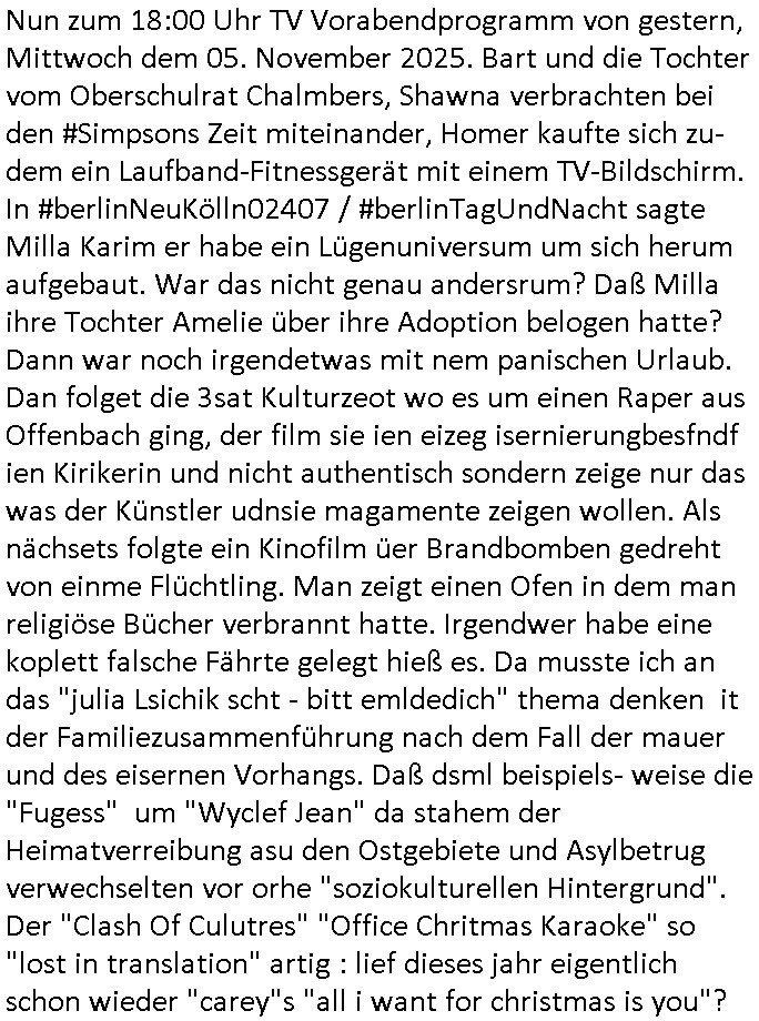 05.11.2025 06:30 Nun zum 18:00 Uhr TV Vorabendprogramm von gestern, Mittwoch dem 05. November 2025. Bart und die Tochter vom Oberschulrat Chalmbers, Shawna verbrachten bei den #Simpsons Zeit miteinander, Homer kaufte sich zu-dem ein Laufband-Fitnessgerät mit einem TV-Bildschirm. In #berlinNeuKölln02407 / #berlinTagUndNacht sagte Milla Karim er habe ein Lügenuniversum um sich herum aufgebaut. War das nicht genau andersrum? Daß Milla ihre Tochter Amelie über ihre Adoption belogen hatte? Dann war noch irgendetwas mit nem panischen Urlaub. Dan folget die 3sat Kulturzeot wo es um einen Raper aus Offenbach ging, der film sie ien eizeg isernierungbesfndf ien Kirikerin und nicht authentisch sondern zeige nur das was der Künstler udnsie magamente zeigen wollen. Als nächsets folgte ein Kinofilm üer Brandbomben gedreht von einme Flüchtling. Man zeigt einen Ofen in dem man religiöse Bücher verbrannt hatte. Irgendwer habe eine koplett falsche Fährte gelegt hieß es. Da musste ich an das "julia Lsichik scht - bitt emldedich" thema denken it der Familiezusammenführung nach dem Fall der mauer und des eisernen Vorhangs. Daß dsml beispiels- weise die "Fugess" um "Wyclef Jean" da stahem der Heimatverreibung asu den Ostgebiete und Asylbetrug verwechselten vor orhe "soziokulturellen Hintergrund". Der "Clash Of Culutres" "Office Chritmas Karaoke" so "lost in translation" artig : lief dieses jahr eigentlich schon wieder "carey"s "all i want for christmas is you"? Nur mal so von wgen dem #TVtotal Aldivatenskalender. Frauen die af Staatskosten Urlaub in der Südsee machen. wo die ene egnrtaion bei flucht und vertreibung an die evrskung vo wilhelm gustlff udn cap arcona denkt oder Flch aus der Ostzone und die andere geration eher an lampedusa flüchtlings-boote auf dem mittel-meer. Dann zeigte das Museum in Wien "alles in Arbeit" ienausstlung von Gemälden undkuturen zumtha "job". Asl nächtes hieße es daß Armin Müller Stahl Bilder male die manzegte. Dann kam ein Film über einen Unfall bei dem schinbar jemand ganz auf selstam Art und Weise zu Tod kam. "How to make a killing". Es stelletsic herus daß das paar was am Unfall beteilgt war finaziell Interessen hatte und am Todesfall gut verdiente. Al nächstes gab es eine EInweihung eines neuen Museums in Ägyten mit einer riesigen Light-Show. Anshcließend folgte die vor-stellung des Musikalbums "women deserve rage" von einrs Sängirnnamens "Imany". Und zumshcluß gab es ein musiukvieo von "lola youg" oder so "one thing". Dan wieder #berliNueKölln02407 / #berlitagancht die "disco, pogo, 3 tage wach" Aufputschmittel Kritik?-Rave Party von #matrix "mal-Tee" ging los. Er hatte sich noch irgendwie mit Raphi verkracht. https://tvinfo.de/fernsehprogramm/2239810184-die-simpsons https://tvinfo.de/fernsehprogramm/2221528221-kulturzeit [0] "202511050630-0-1.jpg" [1] "202511050630-0-2.jpg" |