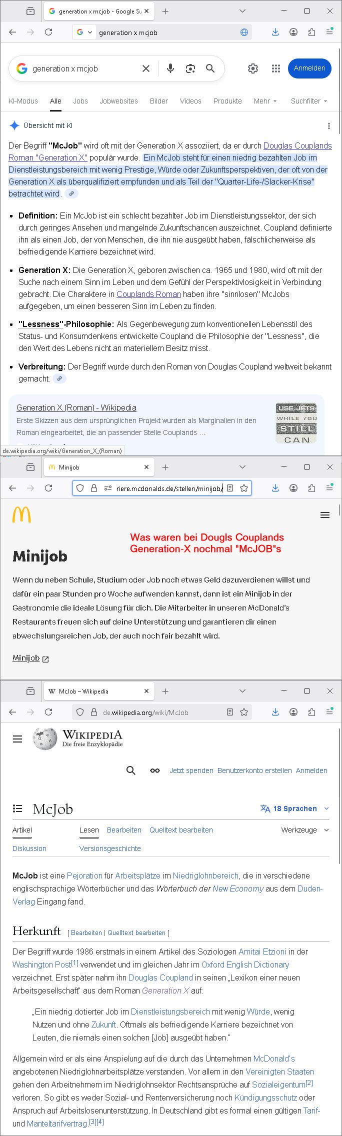 08.11.2025 05:00 Ich hab gestren das neue Winter-LosWochos-Commercial geshen von McDonalds im Fernsehen und daß sie jetzt zu SuperSizeMe HappyMeals auch WasIstWas-Kinderbücher beilegen udn da musteich an meine Lieblinsgwerbespot- Melodie für fastFood aus der b3-radio-show mit thomas (gottschalk) der dann immer an Kollege Günther Jauch übergab zum Ende hin denken "ich hab heute lust auf mcBacon von McDoald der winter hit" oder so ging das ein reim auf "kälte macht appetit". Und ich muste daran denken wie wir darübr gesprochen hatten daß an der kostablerwache im FastFood-Restaurant Toilettentüren verschlossen waren wegen der "Junkies" die da, das hab ich rechrechiert #Sesamstraßen Schlemil "hey, du? wer ich? ja du= willst du ein 'H' kaufen" artig Drogen kauften. Und ich mußte an die Stelle in diesem Science Fiction Film #DemolitionMan denken wo die Polizusten im Auto der Zukunft ein Tape mit alten Werbe-Jingels einlegen und an dieses #LostInTranslation Xmas-#Karaoke und dan stieß ich beim googlen nach dem Text und den Noten von dem McBacon Jingle udn Bider von den "WasIsWwas" Büchern auf eine Karriere Website von McDonalds mit "MiniJobs" was ich wegen des Begriffs "McJob" asu "Generation X" dem Roman von "Douglas Coupland" sensationell fand. Weil ich meien mich daran zu erinnern Stellenanzeigen für Schülernebenjobs Diskussionstehma waren (ic habriet a für Top-Management hadhuter) in der Redaktion die ähnlich wie bei Comuterhersteller "HP" hewlett packard (IC-Chip-Erfinder?) gesehen die eine Berbunsg_Dtanbank hatten im neuen Schülerzugs BBS/WWW verteilt werden sollten. Es hertscht damals ja auch ne hohe Arbeitslosigket nch der Wend ud chspch mit luten vom Abriostamt üer Azubi-Stellenanzeigen Netze. Der "und nach dem besuch beimHitettsunus #mcDrive fahren unsre Hinterwälder immer in irgendne Dorfdisse" schhef so soga ins #tarantino 's #pulpficion https://www.google.com/search?q=generation+x+mcjob https://karriere.mcdonalds.de/stellen/minijob/ https://de.wikipedia.org/wiki/McJob [0] "202511080500-0-1.jpg" [1] "202511080500-0-2.jpg" [2] "202511080500-0-3.jpg" [3] "202511080500-0-4.jpg" |