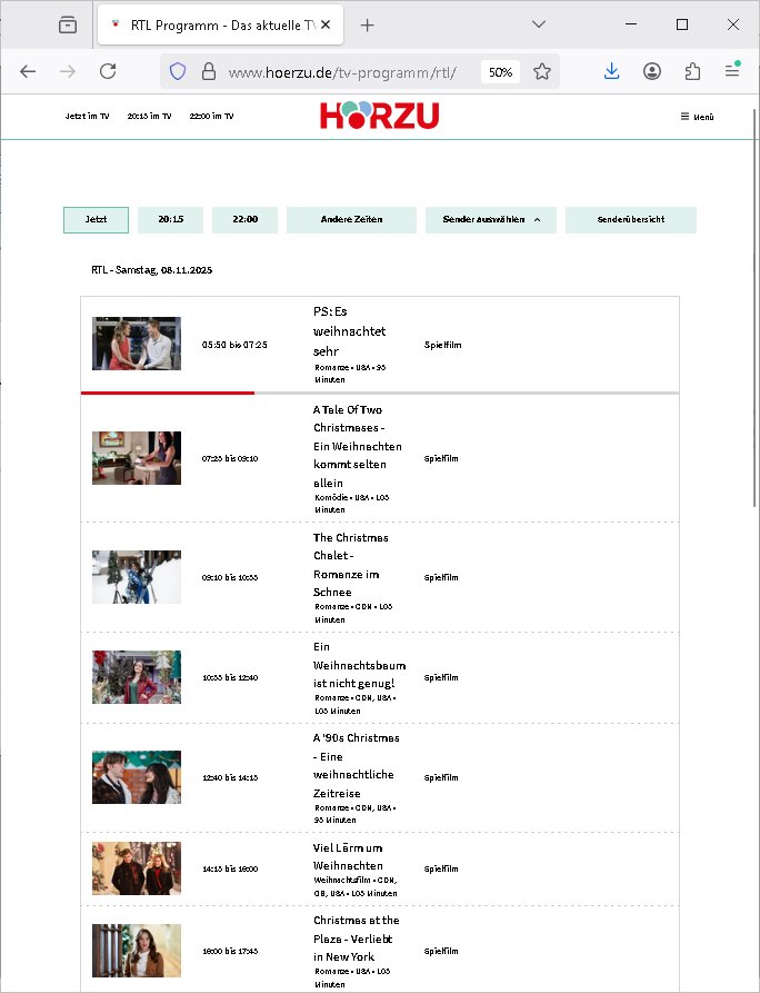 08.11.2025 06:37 RTL - Samstag, 08.11.2025 05:50 bis 07:25 PS: Es weihnachtet sehr Romanze • USA • 95 Minuten Spielfilm 07:25 bis 09:10 A Tale Of Two Christmases - Ein Weihnachten kommt selten allein Komödie • USA • 105 Minuten Spielfilm 09:10 bis 10:55 The Christmas Chalet - Romanze im Schnee Romanze • CDN • 105 Minuten Spielfilm 10:55 bis 12:40 Ein Weihnachtsbaum ist nicht genug! Romanze • CDN, USA • 105 Minuten Spielfilm 12:40 bis 14:15 A '90s Christmas - Eine weihnachtliche Zeitreise Romanze • CDN, USA • 95 Minuten Spielfilm 14:15 bis 16:00 Viel Lärm um Weihnachten Weihnachtsfilm • CDN, GB, USA • 105 Minuten Spielfilm 16:00 bis 17:45 Christmas at the Plaza - Verliebt in New York Romanze • USA • 105 Minuten Spielfilm https://www.hoerzu.de/tv-programm/rtl/ Update/Nachtrag: https://simpsonspedia.net/index.php/Sommer-Weihnacht_in_Springfield https://simpsons.fandom.com/wiki/A_Springfield_Summer_Christmas_for_Christmas https://en.wikipedia.org/wiki/A_Springfield_Summer_Christmas_for_Christmas https://www.imdb.com/de/title/tt13394880/ [0] "202511080637-0-1.jpg" [1] "202511080637-0-2.jpg" [2] "202511080637-0-3.jpg" [3] "202511080637-0-4.jpg" |