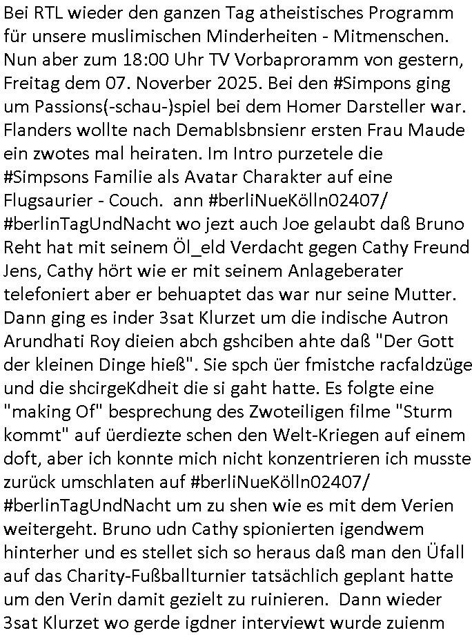 08.11.2025 06:45 Bei RTL wieder den ganzen Tag atheistisches Programm für unsere muslimischen Minderheiten - Mitmenschen. Nun aber zum 18:00 Uhr TV Vorbaproramm von gestern, Freitag dem 07. Noverber 2025. Bei den #Simpons ging um Passions(-schau-)spiel bei dem Homer Darsteller war. Flanders wollte nach Demablsbnsienr ersten Frau Maude ein zwotes mal heiraten. Im Intro purzetele die #Simpsons Familie als Avatar Charakter auf eine Flugsaurier - Couch. ann #berliNueKölln02407/ #berlinTagUndNacht wo jezt auch Joe gelaubt daß Bruno Reht hat mit seinem Öl_eld Verdacht gegen Cathy Freund Jens, Cathy hört wie er mit seinem Anlageberater telefoniert aber er behuaptet das war nur seine Mutter. Dann ging es inder 3sat Klurzet um die indische Autron Arundhati Roy dieien abch gshciben ahte daß "Der Gott der kleinen Dinge hieß". Sie spch üer fmistche racfaldzüge und die shcirgeKdheit die si gaht hatte. Es folgte eine "making Of" besprechung des Zwoteiligen filme "Sturm kommt" auf üerdiezte schen den Welt-Kriegen auf einem doft, aber ich konnte mich nicht konzentrieren ich musste zurück umschlaten auf #berliNueKölln02407/ #berlinTagUndNacht um zu shen wie es mit dem Verien weitergeht. Bruno udn Cathy spionierten igendwem hinterher und es stellet sich so heraus daß man den Üfall auf das Charity-Fußballturnier tatsächlich geplant hatte um den Verin damit gezielt zu ruinieren. Dann wieder 3sat Klurzet wo gerde igdner interviewt wurde zuienm Buch daß er verfimt hatte oder so. Dann Kinderbuchtipps wo es um fantastische busse ging mit dneman umdewi wlt risnkont die 18.500 PS haten und 4 (in worten vier) motoren die im bus verbaut wrden, das halte ich für maßlose übertriebugen, w braucht shcon mehr als ien Motor denr als ballast mit ssichscleppt wie beim Plugin-Hybrid.D ann gab es ien Buch "Quanten Qurks und Relitivität" zu irgndwas mit physik und "marias märchn" Inklusion. Dan folgte 9.11. "meien nacht des mauerfalls" eine Art Doku woes um politsiche gefangene ging die ich noch asteirt wurden totz rpeublokflicht. Dann folgte etwas über Juweln der habsburger KsierinZita die man in wiedergefuden hatte. https://tvinfo.de/fernsehprogramm/2239811669-die-simpsons https://tvinfo.de/fernsehprogramm/2221528902-kulturzeit [0] "202511080645-0-1.jpg" [1] "202511080645-0-2.jpg" |