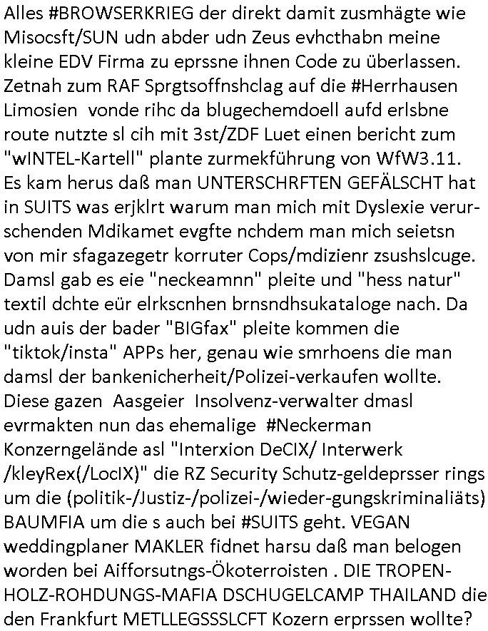 12.11.2025 03:30 Friedrich Merz 70ter Geburtstag ist vorbei. Er hatte der Bild-Zeitung erzählt man habe um 00:00 Uhr sein Handy abgeschaltet, und es gab Bilder von Torten und hinter seinem(?) Schreitisch etwas das wie alte Luftaufnahmen aussah zu sehen, zudem was zum um den Hals knoten. Hatte ich gestern auf "bombER junior's Musik Auktionen" ähnlich der "für BONO (vox von U2s sohn)" hingewiesen im täglichen Video anläßlch deiseer frage wie Luet wie "Katja" (BIGfax Pleite) "Bader" und "Peanuts - Die Bank zahlt alles" jdsüche Osblock Baumafia Immo Schneider sich finanzierten und die "SUBPRIME/EURO-Finanzkrise" entstand sowie de "NEW ECONOYY/KI Investitionsblase"? Seit Scholz und Merz mit Sondervermögen eine Cyber- Abwehrisnhiet der budswhr grüdeten udn KI egführt wurde ist das Netz nur noch voller mIltärdiktatur Fake- News, angefangen hatten die massiven Probleme mit der Ära Merkel und zeitnah zur EU-Osterweiterung und wiederveigunsgebdingter Subvnsionsbtrug-Kriminalität. "ELF AQUITANE" / "GASZ-PROM NORTH STERAM (2)", es gab gestern um etwa 18:00 Uhr in den Pro7 - News nen bericht über Song-Texte die angeblche KI generiert seien und daß die GEMA geklagt hatte. Also mir hat die GEMA nichts bezahlt für RAMMSTEINs DEUTSCHLAND Klau oder BABYLON BERLIN SONDTRACK Textfragrmente. Außerdem gab es auf ZDFinfo "Öl. Macht. Geschichte" . Wie finanziert sich Putin und Klitschko nochmal laut der Recherchen meines Blogger-Kollegen Nawalny der asl Hooligan seinen Gegnern Halsadern aufschlitzen wollte? Wie gegenfinanzuiert nocmal der jüdsche TerrorClown Selensksi die ihm geliefrten Waffen zum gewaltsam er-zwungenen "Warschaur Pakt" NCholfgeroga Ausstieg? Um (Metallgesellscgft Öl "Kon")-KURSMANIPUATIONEN ging es auch bei #SUITS gestern. Die "Anwälte" gerieten unter Druck, frühere Teilhaber die man herusgerdängt hatte versuchen wieder einzusteigen, siehe "#MERTON". Der betrügerisch ins Amt gekommene Kanzlei-"Namens"-partner" Lewis "wolfram illumnated?" LITt pimpert mit einer Uni-Miartbeiterin die wie der korrupte Professor sowei diese korrupten (IHK/AHK/Anwalts-)kammer mit daran betilget ist Ämter käuflich zu machen, siehe etwa die Stiftunsgpfressur für Prof Christian Metz von 3sat, ien he,lger miscüder de rmich medikmantö evrgfiten ließ und siehe "habkkemmKios Sndweg Frankfurt) per Kidnapping an seinen Kulturzeit Job kam, genau wie Bruckmaier udn Assmann an Ämter in Bad Homburg. Die Musikersohn Harvey Therpeutin will Donna feuern die ein Jobangebot hat vom KURSMANIPULTAIONS Broker Ex - Untermieter. Harvey sagteer wolle irhe küdgung nicht akzeptieren, ich glab nicht daß er das üerbaut darf, wär ich Donna würde ich bei keinem dieser Betrügerläden mehr mitmachen. Häte Harvey die Kündigung akzeoteirt wärd der kanzlei nicht gleich das nächste problem um die Ohren geflogen, die Baumafia (Kai Oluds, Jones Long Lasalle) wile ihnen scheinbar ein Firmensitze-haus verkaufen indem sie per betrügersiche Mietwucher EPRESSUGEN der Kanzlei ihr Büro streitig machen wollen (siehe Umzug von Kisseleff- 10 in Louisen- 101, Kidppaing eprssung Hessenring 87a). "PEnust ide bank Zhalt lales Immobilens hcider udndie Bknscheriszterband-RZ.-becher Schutgeldepressermafia. Donna hat Scheiße gebaut und ale die Anderen sollen daruter leiden, ien klarer Fall von ANWALTSHAFTUNG. (die ifnzeiren ja jetzt shcon Schadenersatz aus Urheber-rechtes-Eprssungen die ihnen gar nicht gehören, siehe "JUWELIER ZEUS" udn bigfax "library code" von mir den man mit kidnapping aufzukaufen zu erpressen versuchte, dazu die rhcte an meinen recherchen und filmen/musik ) Es hätte einen ganz einfachen Ausweg aus der Erpressung mitdem Mietvertrag gegeben. Donna hätte den Kopf hinhalten müssen. Satt dessen evrchte Donne nun den Vermieter der kein lust hat denw ert sienr immobilen wetr zu mdenr indem er dort ein betrügerbande behrberget zu betrügen mit angeblchen (juden alteigentum baurecht) "Luftbaurechten". (Sieh meine täglcieh Videos wenn es um das Thema "Nachver-dichtung/Aufstockung" geht). Das gibt ien basutopp udn da wnderndie ganzen Verbrecher ertsmal in den knast, dann püfe wir die zu Urhct eien dsuchen pass erhalten ahbn identitätetn der Ostblock und Balkan Gangs verächtg ist wer nch 1989 ins Land kam oder dmals gastarbietr heir war. Aso, der Ausweg aus dem Dilemma wäre gaz einfach: die Kündigung von Donna akzeptieren anstatt wie Harvey es tat versuchen sie zurückzunehmen. Seine führer therapeutin und neue Freundin hat ihm geraten Donna zu feuern und es war die beste Lösung für deren Problem. Als Donna zurück-komt un sich dank des gar nicht durch sie verdienten sondern vom SysOp der Firme vedienten Geld einkauft in die gesllschafter-versmamlung (was die anderen Mit-geselschafter auch gar nicht wollen, blöd wenn man Aktien ausgibt die öffentlich gehandelt werden können) verursacht sie die Immobilen/Miet-Problematik. Ich wette am ende komt herus daß sie da irgndwie mit-verdient derkazlei ienen neu Firmensitz zu verkaufen seitens der bau-RECHENZENTRUMS-SCHUZTGELD-mafia die das (decIX INTERXION arge) ganze "KI-Projekt" des SysOps inszeniert hat um überteuterte "Luft-Baurechte" verkaufen zu können wordn Baurabeiter/gewerkschaftler (Armuts-zuwanderer) miteverdienen. Seit wann/wieso ducften etwa (jdüshe latgetusm dbtatt) juden außerhalb von (spartssustchen Zionisten-)ghettos bauen? Oder in Palästina unter britischer Kolonialamcht-Besatzung des Öl-Geschäfts wegen? Seit der Daimler/Diesel und Ford Technikrevolution Erfing von Motorne die lechtgenug für Motorflug waren udn KFZ/LKW/PKW/Traktoren und der Spekualtionsblasen die in der "Gründerzet" enstanden viels davonshceelbsllsytem ähnlich der "new Economy" der "Internet Spekulationsblasen" durch das von mir erdachte WWW. "google" küdegt egrde den bau eiens nuen KI Rhczetrums an, ich willdie Dtschutzs-Skandal- Firma "google" hgeir beoswnegs iehenwie "facebook"/ "tiktok", "apple ITunes DRM" und Co. Bill Gates wollte in RlP beenflls Rchztzrenbau 