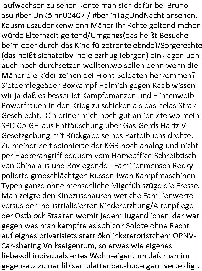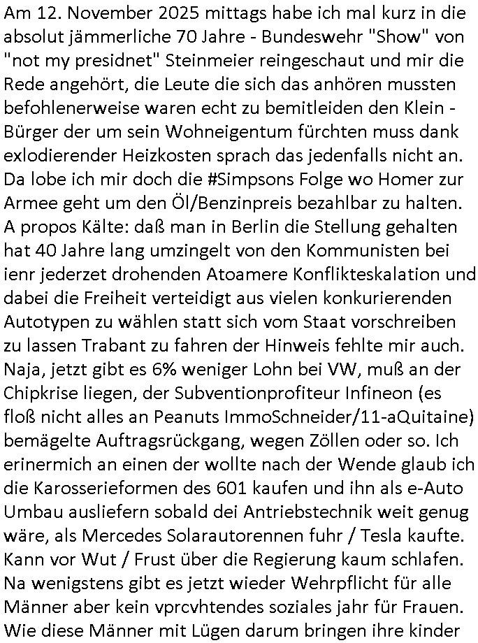 13.11.2025 00:00 Am 12. November 2025 mittags habe ich mal kurz in die absolut jämmerliche 70 Jahre - Bundeswehr "Show" von "not my presidnet" Steinmeier reingeschaut und mir die Rede angehört, die Leute die sich das anhören mussten befohlenerweise waren echt zu bemitleiden den Klein - Bürger der um sein Wohneigentum fürchten muss dank exldierender Heizkosten sprach das jedenfalls nicht an. Da lobe ich mir doch die #Simpsons Folge wo Homer zur Armee geht um den Öl/Benzinpreis bezahlbar zu halten. A propos Kälte: daß man in Berlin die Stellung gehalten hat 40 Jahre lang umzingelt von den Kommunisten bei ienr jederzet drohenden Atoamere Konflikteskalation und dabei die Freiheit verteidigt aus vielen konkurierenden Autotypen zu wählen statt sich vom Staat vorschreiben zu lassen Trabant zu fahren der Hinweis fehlte mir auch. Naja, jetzt gibt es 6% weniger Lohn bei VW, muß an der Chipkrise liegen, der Subventionprofiteur Infineon (es floß nicht alles an Peanuts ImmoSchneider/11-aQuitaine) bemägelte Auftragsrückgang, wegen Zöllen oder so. Ich erinermich an einen der wollte nach der Wende glaub ich die Karosserieformen des 601 kaufen und ihn als e-Auto Umbau ausliefern sobald dei Antriebstechnik weit genug wäre, als Mercedes Solarautorennen fuhr / Tesla kaufte. Kann vor Wut / Frust über die Regierung kaum schlafen. Na wenigstens gibt es jetzt wieder Wehrpflicht für alle Männer aber kein vprcvhtendes soziales jahr für Frauen. Wie diese Männer mit Lügen darum bringen ihre kinder aufwachsen zu sehen konte man sich dafür bei Bruno asu #berlUnKölnn02407 / #berlinTagUndNacht ansehen. Kausm uszudenkenw enn Mäner ihr Rchte geltend mchen würde Elternzeit geltend/Umgangs(das heißt Besuche beim oder durch das Kind fü getrentelebnde)/Sorgerechte (das heißt sichateibv indie ezrhug iebrgen) einklagen udn auch noch durchsetzen wollten,wo sollen denn wenn die Mäner die kider zeihen dei Front-Soldaten herkommen? Sietdemlegeäder Boxkampf Halmich gegen Raab wissen wir ja daß es besser ist Kampfemanzen und Flintenweib Powerfrauen in den Krieg zu schicken als das helas Strak Geschlecht. Cih eriner mich noch gut an ien Zte wo mein SPD Co-GF aus Enttäuschung über Gas-Gerds HartzIV Gesetzgebung mit Rückgabe seines Parteibuchs drohte. Zu meiner Zeit spionierte der KGB noch analog und nicht per Hackerangriff bequem vom Homeoffice-Schreibtisch von China aus und Boxlegende - Familienmensch Rocky polierte grobschlächtgen Russen-Iwan Kampfmaschinen Typen ganze ohne menschliche Migefühlszüge die Fresse. Man zeigte den Kinozuschauren wetlche Familienwerte versus der industrialisierten Kindererzhung/Altenpflege der Ostblock Staaten womit jedem Jugendlichen klar war gegen was man kämpfte aslsoblcok Soldte ohne Recht auf eignes privatisiets statt ökolinkxteroristchem ÖPNV-Car-sharing Volkseigentum, so etwas wie eigenes liebevoll indivdualsiertes Wohn-eigentum daß man im gegensatz zu ner liblsen plattenbau-bude gern verteidigt. https://www.bild.de/politik/alle-maenner-zur-musterung-einigung-im-wehrdienst-streit-6915023d0407e2fef73cad6c https://www.bild.de/politik/inland/verhandlungen-bei-vw-tarifrunde-soll-gehaelter-um-6-prozent-senken-69148a060407e2fef73ca4f8 https://tvinfo.de/fernsehprogramm/2244369106-berlin-tag-nacht https://de.wikipedia.org/wiki/Rocky_IV_%E2%80%93_Der_Kampf_des_Jahrhunderts [0] "202511130000-0-1.jpg" [1] "202511130000-0-2.jpg" [2] "202511130000-0-3.jpg" |