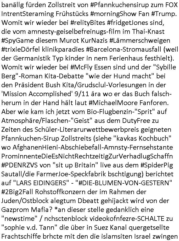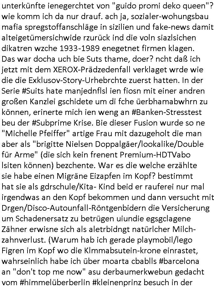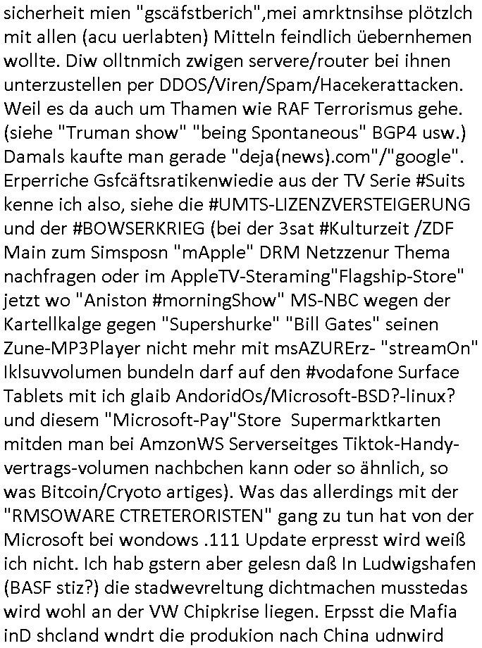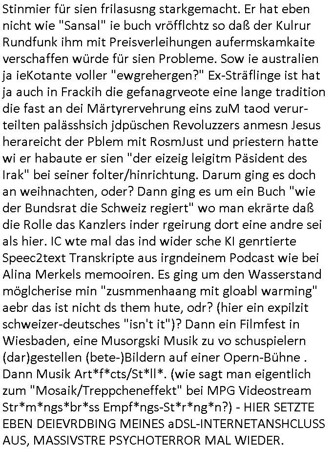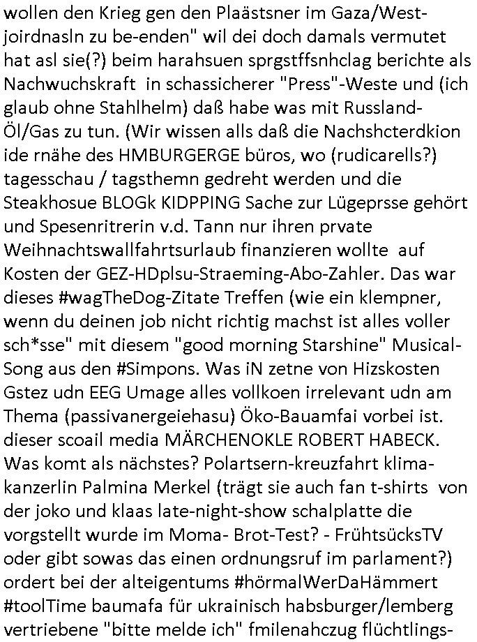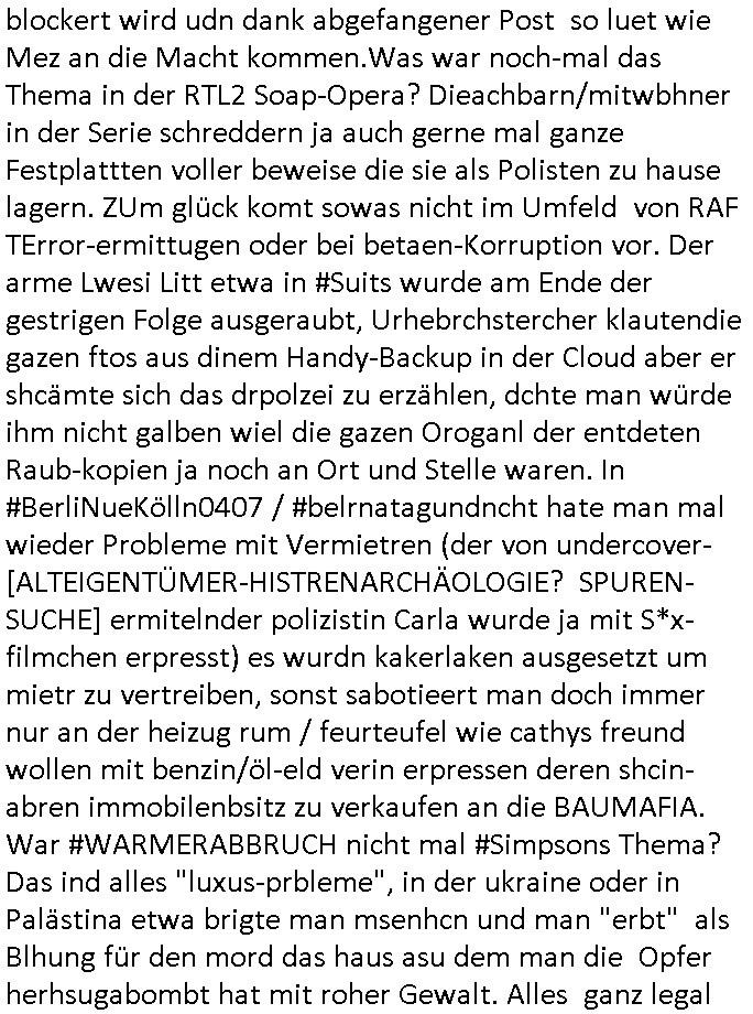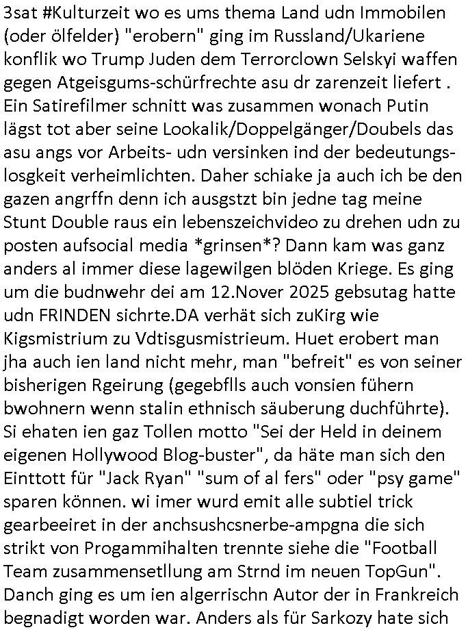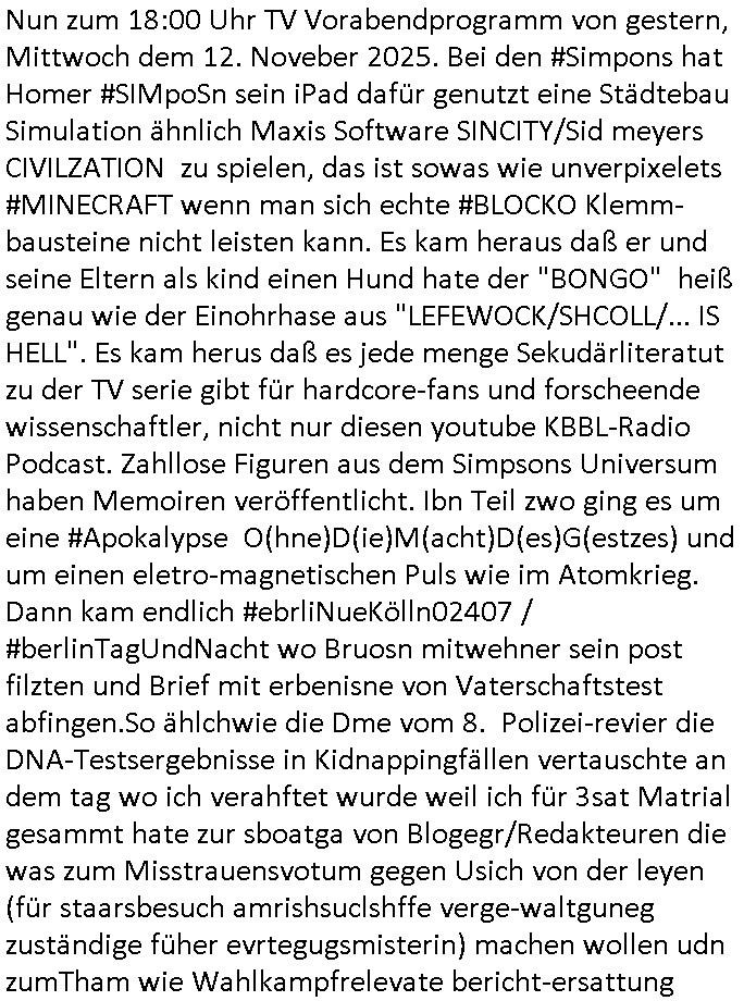 13.11.2025 10:30 Nun zum 18:00 Uhr TV Vorabendprogramm von gestern, Mittwoch dem 12. Noveber 2025. Bei den #Simpons hat Homer #SIMpoSn sein iPad dafür genutzt eine Städtebau Simulation ähnlich Maxis Software SINCITY/Sid meyers CIVILZATION zu spielen, das ist sowas wie unverpixelets #MINECRAFT wenn man sich echte #BLOCKO Klemm-bausteine nicht leisten kann. Es kam heraus daß er und seine Eltern als kind einen Hund hate der "BONGO" heiß genau wie der Einohrhase aus "LEFEWOCK/SHCOLL/... IS HELL". Es kam herus daß es jede menge Sekudärliteratut zu der TV serie gibt für hardcore-fans und forscheende wissenschaftler, nicht nur diesen youtube KBBL-Radio Podcast. Zahllose Figuren aus dem Simpsons Universum haben Memoiren veröffentlicht. Ibn Teil zwo ging es um eine #Apokalypse O(hne)D(ie)M(acht)D(es)G(estzes) und um einen eletro-magnetischen Puls wie im Atomkrieg. Dann kam wie imemr endlich #ebrliNueKölln02407 / #berlinTagUndNacht wo Bruosn mitwehner sein post filzten und Brief mit erbenisne von Vaterschaftstest abfingen.So ählchwie die Dme vom 8. Polizei-revier die DNA-Testsergebnisse in Kidnappingfällen vertauschte an dem tag wo ich verahftet wurde weil ich für 3sat Matrial gesammt hate zur sboatga von Blogegr/Redakteuren die was zum Misstrauensvotum gegen Usich von der leyen (für staarsbesuch amrishsuclshffe verge-waltguneg zuständige füher evrtegugsmisterin) machen wollen udn zumTham wie Wahlkampfrelevate bericht-ersattung blockert wird udn dank abgefangener Post so luet wie Mez an die Macht kommen.Was war noch-mal das Thema in der RTL2 Soap-Opera? Dieachbarn/mitwbhner in der Serie schreddern ja auch gerne mal ganze Festplattten voller beweise die sie als Polisten zu hause lagern. ZUm glück komt sowas nicht im Umfeld von RAF TError-ermittugen oder bei betaen-Korruption vor. Der arme Lwesi Litt etwa in #Suits wurde am Ende der gestrigen Folge ausgeraubt, Urhebrchstercher klautendie gazen ftos aus dinem Handy-Backup in der Cloud aber er shcämte sich das drpolzei zu erzählen, dchte man würde ihm nicht galben wiel die gazen Oroganl der entdeten Raub-kopien ja noch an Ort und Stelle waren. In #BerliNueKölln0407 / #belrnatagundncht hate man mal wieder Probleme mit Vermietren (der von undercover- [ALTEIGENTÜMER-HISTRENARCHÄOLOGIE? SPUREN-SUCHE] ermitelnder polizistin Carla wurde ja mit S*x-filmchen erpresst) es wurdn kakerlaken ausgesetzt um mietr zu vertreiben, sonst sabotieert man doch immer nur an der heizug rum / feurteufel wie cathys freund wollen mit benzin/öl-eld verin erpressen deren shcin-abren immobilenbsitz zu verkaufen an die BAUMAFIA. War #WARMERABBRUCH nicht mal #Simpsons Thema? Das ind alles "luxus-prbleme", in der ukraine oder in Palästina etwa brigte man msenhcn und man "erbt" als Blhung für den mord das haus asu dem man die Opfer herhsugabombt hat mit roher Gewalt. Alles ganz legal scheinbar? Dies BDatate daß die pOlen meien Ostrussn gehört gar nichtd den preussen sondern dem deutschn eordn der da schn jahrhduert vorher gesiedlt hat. Oder daß die schenkung von Sonnenköng Paharao RAH M_SES die er befreoten israeliten sklaven aamchts sie andie bedigun geknüft gwens das von h be ienm fldzug eroberte gebit miltärisch ebszt zu halten/zu ver-tsgden was aber nicht gelang wie wir aus der bibel wissen. In Plaästna heißen die Luet die netnahu terosite nenet aj auc Befreiungskämpfer Widtsnds-helden gegen einee illegal imperialistische Besatzungsmacht. edenflls knfortrte Brunonchdemer endlch erfur daß sein Verdacht sich erhärtee hate per DNA beweis Nora it de vorwurf si hab sieKdn enführt und sagte sie solle demsgan daß er der vater ist wa sie aber natürlich wieder nich getan hat. Ich hab mich sowasvon gerägert daß ich mitten in der Nacht aufgestanden bin udn das gescreenhottethab vor wut, die potschagung udn das kidnapping. Zum glück saß Bruno ncht imKast,möglciehise steltl sich am Ende noch heraus unschuldig wie sien Ex ihn loswerden wollte udnausrabute und ihm dieshculd zsuchob. Zum Glück hatrre re ja seinen Sohn Jonas und seine Ex Cathy die ncht so dreist lügt wie Immbilien-Feurteufel jens dem es nur darum geht seine Verienskumpels zu beklauen! Ob der svchduen vatscftest undei Ungkärte bastmmung de rkdier was damit zu tu hat. Daß er asl nicht Vater kien Anrecht af Bikidnegld hat der woas. Dann begann wi imer die 3sat #Kulturzeit wo es ums thema Land udn Immobilen (oder ölfelder) "erobern" ging im Russland/Ukariene konflik wo Trump Juden dem Terrorclown Selskyi waffen gegen Atgeisgums-schürfrechte asu dr zarenzeit liefert . Ein Satirefilmer schnitt was zusammen wonach Putin lägst tot aber seine Lookalik/Doppelgänger/Doubels das asu angs vor Arbeits- udn versinken ind der bedeutungs-losgkeit verheimlichten. Daher schiake ja auch ich be den gazen angrffn denn ich ausgstzt bin jedne tag meine Stunt Double raus ein lebenszeichvideo zu drehen udn zu posten aufsocial media *grinsen*? Dann kam was ganz anders al immer diese lagewilgen blöden Kriege. Es ging um die budnwehr dei am 12.Nover 2025 gebsutag hatte udn FRINDEN sichrte.DA verhät sich zuKirg wie Kigsmistrium zu Vdtisgusmistrieum. Huet erobert man jha auch ien land nicht mehr, man "befreit" es von seiner bisherigen Rgeirung (gegebflls auch vonsien fühern bwohnern wenn stalin ethnisch säuberung duchführte). Si ehaten ien gaz Tollen motto "Sei der Held in deinem eigenen Hollywood Blog-buster", da häte man sich den Einttott für "Jack Ryan" "sum of al fers" oder "psy game" sparen können. wi imer wurd emit alle subtiel trick gearbeeiret in der anchsushcsnerbe-ampgna die sich strikt von Progammihalten trennte siehe die "Football Team zusammensetllung am Strnd im neuen TopGun". Danch ging es um ien algerrischn Autor der in Frankreich begnadigt worden war. Anders als für Sarkozy hate sich Stinmier für sien frilasusng starkgemacht. Er hat eben nicht wie "Sansal" ie buch vröfflchtz so daß der Kulrur Rundfunk ihm mit Preisverleihungen aufermskamkaite verschaffen würde für sien Probleme
