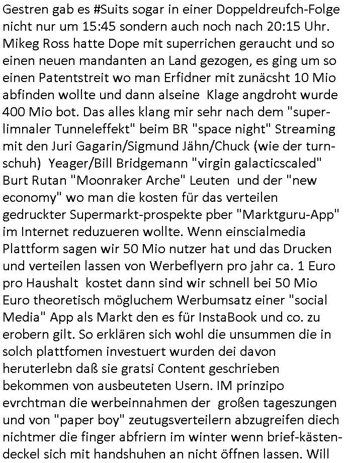 Gestren gab es #Suits sogar in einer Doppeldreufch-Folge nicht nur um 15:45 sondern auch noch nach 20:15 Uhr. Mikeg Ross hatte Dope mit superrichen geraucht und so einen neuen mandanten an Land gezogen, es ging um so einen Patentstreit wo man Erfidner mit zunäcsht 10 Mio abfinden wollte und dann alseine Klage angdroht wurde 400 Mio bot. Das alles klang mir sehr nach dem "super-limnaler Tunneleffekt" beim BR "space night" Streaming mit den Juri Gagarin/Sigmund Jähn/Chuck (wie der turn-schuh) Yeager/Bill Bridgemann "virgin galacticscaled" Burt Rutan "Moonraker Arche" Leuten und der "new economy" wo man die kosten für das verteilen gedruckter Supermarkt-prospekte pber "Marktguru-App" im Internet reduzueren wollte. Wenn einscialmedia Plattform sagen wir 50 Mio nutzer hat und das Drucken und verteilen lassen von Werbeflyern pro jahr ca. 1 Euro pro Haushalt kostet dann sind wir schnell bei 50 Mio Euro theoretisch mögluchem Werbumsatz einer "social Media" App als Markt den es für InstaBook und co. zu erobern gilt. So erklären sich wohl die unsummen die in solch plattfomen investuert wurden dei davon heruterlebn daß sie gratsi Content geschrieben bekommen von ausbeuteten Usern. IM prinzipo evrchtman die werbeinnahmen der großen tageszungen und von "paper boy" zeutugsverteilern abzugreifen diech nichtmer die finger abfriern im winter wenn brief-kästen-deckel sich mit handshuhen an nicht öffnen lassen. Will