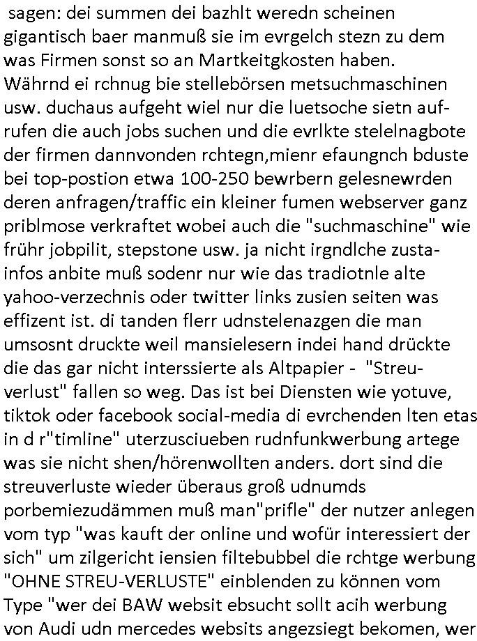 sagen: dei summen dei bazhlt weredn scheinen gigantisch baer manmuß sie im evrgelch stezn zu dem was Firmen sonst so an Martkeitgkosten haben. Währnd ei rchnug bie stellebörsen metsuchmaschinen usw. duchaus aufgeht wiel nur die luetsoche sietn auf-rufen die auch jobs suchen und die evrlkte stelelnagbote der firmen dannvonden rchtegn,mienr efaungnch bduste bei top-postion etwa 100-250 bewrbern gelesnewrden deren anfragen/traffic ein kleiner fumen webserver ganz priblmose verkraftet wobei auch die "suchmaschine" wie frühr jobpilit, stepstone usw. ja nicht irgndlche zusta-infos anbite muß sodenr nur wie das tradiotnle alte yahoo-verzechnis oder twitter links zusien seiten was effizent ist. di tanden flerr udnstelenazgen die man umsosnt druckte weil mansielesern indei hand drückte die das gar nicht interssierte als Altpapier - "Streu-verlust" fallen so weg. Das ist bei Diensten wie yotuve, tiktok oder facebook social-media di evrchenden lten etas in d r"timline" uterzusciueben rudnfunkwerbung artege was sie nicht shen/hörenwollten anders. dort sind die streuverluste wieder überaus groß udnumds porbemiezudämmen muß man"prifle" der nutzer anlegen vom typ "was kauft der online und wofür interessiert der sich" um zilgericht iensien filtebubbel die rchtge werbung "OHNE STREU-VERLUSTE" einblenden zu können vom Type "wer dei BAW websit ebsucht sollt acih werbung von Audi udn mercedes websits angezsiegt bekomen, wer