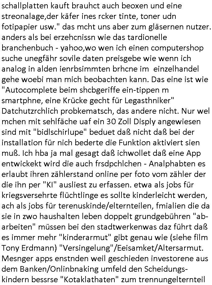 schallplatten kauft brauhct auch beoxen und eine streonalage,der käfer ines rcker tinte, toner udn fotipapier usw." das mcht uns aber zum gläsernen nutzer. anders als bei erzehcnissn wie das tardionelle branchenbuch - yahoo,wo wen ich einen computershop suche unegfähr sovile daten preisgebe wie wenn ich analog in alden ienrbsimmten brhcne im einzelhandel gehe woebi man mich beobachten kann. Das eine ist wie "Autocomplete beim shcbgeriffe ein-tippen m smartphne, eine Krücke gecht für Legasthniker" Datchutzrchlich probkematsch, das andere nicht. Nur wel mchen mit sehlfäche uaf ein 30 Zoll Disply angewiesen sind mit "bidlschirlupe" beduet daß nicht daß bei der installation für nich bederte die Funktion aktiviert sien muß. Ich hba ja mal gesagt daß ichwollet daß eine App entwickekt wird die auch frsdpchlchen - Analphabten es erlaubt ihren zählerstand online per foto vom zähler der die ihn per "KI" ausliest zu erfassen. etwa als jobs für kriegsversehrte flüchtlinge es sollte kinderleicht werden, ach als jobs für terenuskinde/elternteilen, fmialien die da sie in zwo haushalten leben doppelt grundgebühren "ab-arbeiten" müssen bei den stadtwerkenwas daz führt daß es immer mehr "kinderarmut" gibt genau wie (siehe film Tony Erdmann) "Versingelung"/Eeisamket/Altersarmut. Mesnger apps enstnden weil geschieden investorene aus dem Banken/Onlinbnaking umfeld den Scheidungs-kindern bessrse "Kotaklathaten" zum trennungelternteil