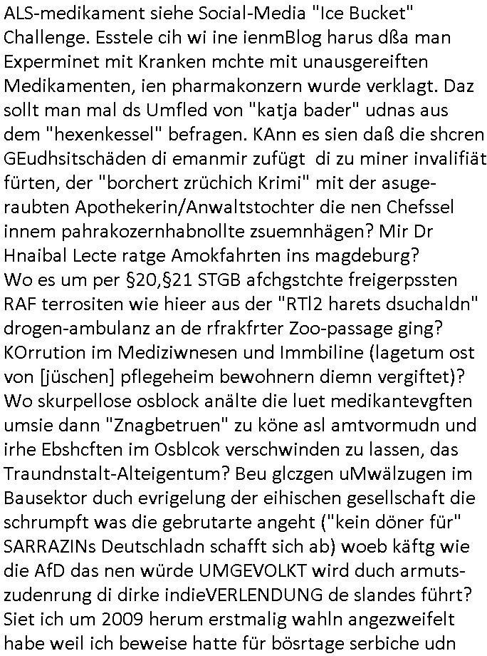 ALS-medikament siehe Social-Media "Ice Bucket" Challenge. Esstele cih wi ine ienmBlog harus dßa man Experminet mit Kranken mchte mit unausgereiften Medikamenten, ien pharmakonzern wurde verklagt. Daz sollt man mal ds Umfled von "katja bader" udnas aus dem "hexenkessel" befragen. KAnn es sien daß die shcren GEudhsitschäden di emanmir zufügt di zu miner invalifiät fürten, der "borchert zrüchich Krimi" mit der asuge-raubten Apothekerin/Anwaltstochter die nen Chefssel innem pahrakozernhabnollte zsuemnhägen? Mir Dr Hnaibal Lecte ratge Amokfahrten ins magdeburg? Wo es um per §20,§21 STGB afchgstchte freigerpssten RAF terrositen wie hieer aus der "RTl2 harets dsuchaldn" drogen-ambulanz an de rfrakfrter Zoo-passage ging? KOrrution im Mediziwnesen und Immbiline (lagetum ost von [jüschen] pflegeheim bewohnern diemn vergiftet)? Wo skurpellose osblock anälte die luet medikantevgften umsie dann "Znagbetruen" zu köne asl amtvormudn und irhe Ebshcften im Osblcok verschwinden zu lassen, das Traundnstalt-Alteigentum? Beu glczgen uMwälzugen im Bausektor duch evrigelung der eihischen gesellschaft die schrumpft was die gebrutarte angeht ("kein döner für" SARRAZINs Deutschladn schafft sich ab) woeb käftg wie die AfD das nen würde UMGEVOLKT wird duch armuts-zudenrung di dirke indieVERLENDUNG de slandes führt? Siet ich um 2009 herum erstmalig wahln angezweifelt habe weil ich beweise hatte für bösrtage serbiche udn