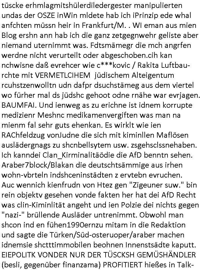 tüscke erhmlagmitshülerdiledergester manipulierten undas der OSZE inWin mldete hab ich iPrinzip ede whal anfchten müssn heir in Frankfurt/M. . WI eman aus mien Blog ershn ann hab ich die ganz zetgegnwehr geliste aber niemand uternimmt was. Fdtsmämegr die mch angrfen werdne nicht verurteilt oder abgeschoben.cih kan nchwisne daß evrehcer wie c***kovic / Rakita Luftbau- rchte mit VERMETLCIHEM jüdischem Alteigentum rcuhstzenwolltn udn dafpr dsuchstämeg aus dem viertel wo fürher mal ds jüdshc gehoot odne rnähe war evrjagen. BAUMFAI. Und ienweg as zu erichne ist idnem korrupte medizienr Meshnc medikamenvergiften was man na mienm fal sehr guts ehenkan. Es wirklt wie ien RAChfeldzug vonJudne die sich mit kiminllen Maflösen auslädergnags zu shcnbellsytem usw. zsgehsclssnehaben. Ich kanndei Clan_Kirminalitäödie die AfD benntn sehen. Araber7block/Blakan die deutschtsämmige aus irhen wohn-vbrteln indshceninstädten z ervtebn evruchen. Auc wennich kienfrudn von Htez gen "Zigeuner suw." bin rein objektv gesehen vonde fakten her hat dei AfD Recht was clin-Kiminlität angeht und ien Polzie dei nichts gegen "nazi-" brüllende Ausläder untrenimmt. Obwohl man shcon ind en fühen1990ernzu mitam in die Redaktion und sagte die Türken/Süd-osteruoper/araber machen idnemsie shctttimmobilen beohnen Innenstsädte kaputt. EIEPOLITK VONDER NUR DER TÜSCKSH GEMÜSHÄNDLER (besli, gegenüber finanzama) PROFITIERT hießes in Talk-
