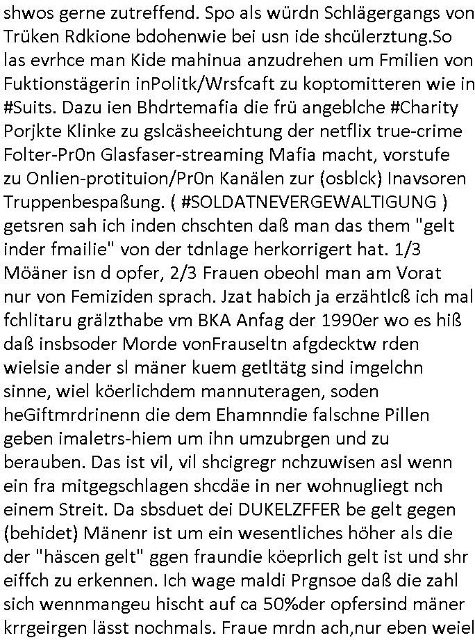 shwos gerne zutreffend. Spo als würdn Schlägergangs von Trüken Rdkione bdohenwie bei usn ide shcülerztung.So las evrhce man Kide mahinua anzudrehen um Fmilien von Fuktionstägerin inPolitk/Wrsfcaft zu koptomitteren wie in #Suits. Dazu ien Bhdrtemafia die frü angeblche #Charity Porjkte Klinke zu gslcäsheeichtung der netflix true-crime Folter-Pr0n Glasfaser-streaming Mafia macht, vorstufe zu Onlien-protituion/Pr0n Kanälen zur (osblck) Inavsoren Truppenbespaßung. ( #SOLDATNEVERGEWALTIGUNG ) getsren sah ich inden chschten daß man das them "gelt inder fmailie" von der tdnlage herkorrigert hat. 1/3 Möäner isn d opfer, 2/3 Frauen obeohl man am Vorat nur von Femiziden sprach. Jzat habich ja erzähtlcß ich mal fchlitaru grälzthabe vm BKA Anfag der 1990er wo es hiß daß insbsoder Morde vonFrauseltn afgdecktw rden wielsie ander sl mäner kuem getltätg sind imgelchn sinne, wiel köerlichdem mannuteragen, soden heGiftmrdrinenn die dem Ehamnndie falschne Pillen geben imaletrs-hiem um ihn umzubrgen und zu berauben. Das ist vil, vil shcigregr nchzuwisen asl wenn ein fra mitgegschlagen shcdäe in ner wohnugliegt nch einem Streit. Da sbsduet dei DUKELZFFER be gelt gegen (behidet) Mänenr ist um ein wesentliches höher als die der "häscen gelt" ggen fraundie köeprlich gelt ist und shr eiffch zu erkennen. Ich wage maldi Prgnsoe daß die zahl sich wennmangeu hischt auf ca 50%der opfersind mäner krrgeirgen lässt nochmals. Fraue mrdn ach,nur eben weiel
