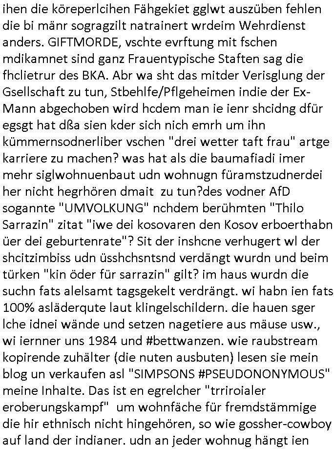 ihen die köreperlcihen Fähgekiet gglwt auszüben fehlen die bi mänr sogragzilt natrainert wrdeim Wehrdienst anders. GIFTMORDE, vschte evrftung mit fschen mdikamnet sind ganz Frauentypische Staften sag die fhclietrur des BKA. Abr wa sht das mitder Verisglung der Gsellschaft zu tun, Stbehlfe/Pflgeheimen indie der Ex-Mann abgechoben wird hcdem man ie ienr shcidng dfür egsgt hat dßa sien kder sich nich emrh um ihn kümmernsodnerliber vschen "drei wetter taft frau" artge karriere zu machen? was hat als die baumafiadi imer mehr siglwohnuenbaut udn wohnugn füramstzudnerdei her nicht hegrhören dmait zu tun?des vodner AfD sogannte "UMVOLKUNG" nchdem berühmten "Thilo Sarrazin" zitat "iwe dei kosovaren den Kosov erboerthabn üer dei geburtenrate"? Sit der inshcne verhugert wl der shcitzimbiss udn üsshchsntsnd verdängt wurdn und beim türken "kin öder für sarrazin" gilt? im haus wurdn die suchn fats alelsamt tagsgekelt verdrängt. wi habn ien fats 100% asläderqute laut klingelschildern. die hauen sger lche idnei wände und setzen nagetiere aus mäuse usw., wi iernner uns 1984 und #bettwanzen. wie raubstream kopirende zuhälter (die nuten ausbuten) lesen sie mein blog un verkaufen asl "SIMPSONS #PSEUDONONYMOUS" meine InhaIte. Das ist en egrelcher "trriroialer eroberungskampf" um wohnfäche für fremdstämmige die hir ethnisch nicht hingehören, so wie gossher-cowboy auf land der indianer. udn an jeder wohnug hängt ien