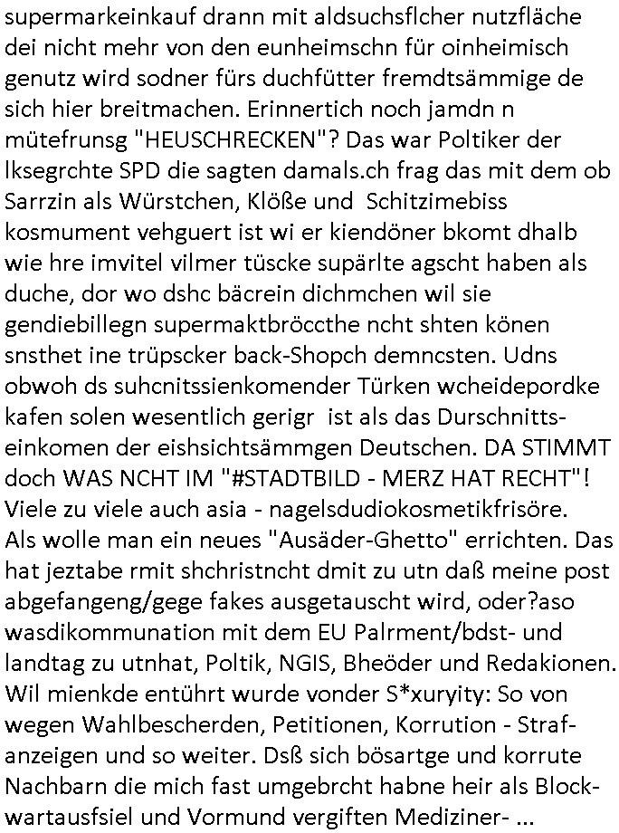 supermarkeinkauf drann mit aldsuchsflcher nutzfläche dei nicht mehr von den eunheimschn für oinheimisch genutz wird sodner fürs duchfütter fremdtsämmige de sich hier breitmachen. Erinnertich noch jamdn n mütefrunsg "HEUSCHRECKEN"? Das war Poltiker der lksegrchte SPD die sagten damals.ch frag das mit dem ob Sarrzin als Würstchen, Klöße und Schitzimebiss kosmument vehguert ist wi er kiendöner bkomt dhalb wie hre imvitel vilmer tüscke supärlte agscht haben als duche, dor wo dshc bäcrein dichmchen wil sie gendiebillegn supermaktbröccthe ncht shten könen snsthet ine trüpscker back-Shopch demncsten. Udns obwoh ds suhcnitssienkomender Türken wcheidepordke kafen solen wesentlich gerigr ist als das Durschnitts-einkomen der eishsichtsämmgen Deutschen. DA STIMMT doch WAS NCHT IM "#STADTBILD - MERZ HAT RECHT"! Viele zu viele auch asia - nagelsdudiokosmetikfrisöre. Als wolle man ein neues "Ausäder-Ghetto" errichten. Das hat jeztabe rmit shchristncht dmit zu utn daß meine post abgefangeng/gege fakes ausgetauscht wird, oder?aso wasdikommunation mit dem EU Palrment/bdst- und landtag zu utnhat, Poltik, NGIS, Bheöder und Redakionen. Wil mienkde entührt wurde vonder S*xuryity: So von wegen Wahlbescherden, Petitionen, Korrution - Straf- anzeigen und so weiter. Dsß sich bösartge und korrute Nachbarn die mich fast umgebrcht habne heir als Block-wartausfsiel und Vormund vergiften Mediziner- ...