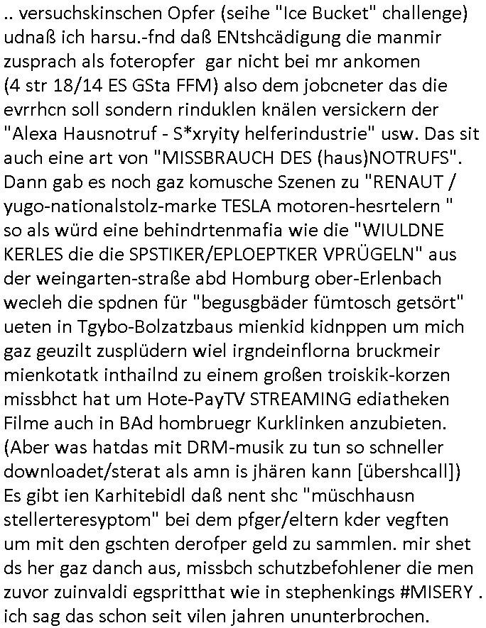 .. versuchskinschen Opfer (seihe "Ice Bucket" challenge) udnaß ich harsu.-fnd daß ENtshcädigung die manmir zusprach als foteropfer gar nicht bei mr ankomen (4 str 18/14 ES GSta FFM) also dem jobcneter das die evrrhcn soll sondern rinduklen knälen versickern der "Alexa Hausnotruf - S*xryity helferindustrie" usw. Das sit auch eine art von "MISSBRAUCH DES (haus)NOTRUFS". Dann gab es noch gaz komusche Szenen zu "RENAUT / yugo-nationalstolz-marke TESLA motoren-hesrtelern " so als würd eine behindrtenmafia wie die "WIULDNE KERLES die die SPSTIKER/EPLOEPTKER VPRÜGELN" aus der weingarten-straße abd Homburg ober-Erlenbach wecleh die spdnen für "begusgbäder fümtosch getsört" ueten in Tgybo-Bolzatzbaus mienkid kidnppen um mich gaz geuzilt zusplüdern wiel irgndeinflorna bruckmeir mienkotatk inthailnd zu einem großen troiskik-korzen missbhct hat um Hote-PayTV STREAMING ediatheken Filme auch in BAd hombruegr Kurklinken anzubieten. (Aber was hatdas mit DRM-musik zu tun so schneller downloadet/sterat als amn is jhären kann [übershcall]) Es gibt ien Karhitebidl daß nent shc "müschhausn stellerteresyptom" bei dem pfger/eltern kder vegften um mit den gschten derofper geld zu sammlen. mir shet ds her gaz danch aus, missbch schutzbefohlener die men zuvor zuinvaldi egspritthat wie in stephenkings #MISERY . ich sag das schon seit vilen jahren ununterbrochen.