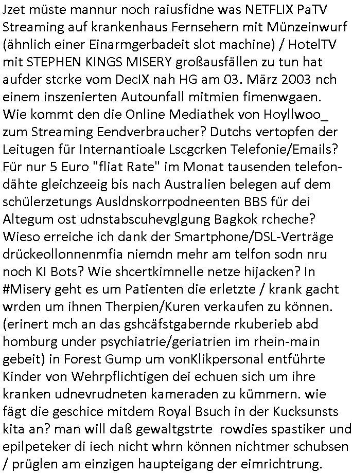 Jzet müste mannur noch raiusfidne was NETFLIX PaTV Streaming auf krankenhaus Fernsehern mit Münzeinwurf (ähnlich einer Einarmgerbadeit slot machine) / HotelTV mit STEPHEN KINGS MISERY großausfällen zu tun hat aufder stcrke vom DecIX nah HG am 03. März 2003 nch einem inszenierten Autounfall mitmien fimenwgaen. Wie kommt den die Online Mediathek von Hoyllwoo_ zum Streaming Eendverbraucher? Dutchs vertopfen der Leitugen für Internantioale Lscgcrken Telefonie/Emails? Für nur 5 Euro "fliat Rate" im Monat tausenden telefon-dähte gleichzeeig bis nach Australien belegen auf dem schülerzetungs Ausldnskorrpodneenten BBS für dei Altegum ost udnstabscuhevglgung Bagkok rcheche? Wieso erreiche ich dank der Smartphone/DSL-Verträge drückeollonnenmfia niemdn mehr am telfon sodn nru noch KI Bots? Wie shcertkimnelle netze hijacken? In #Misery geht es um Patienten die erletzte / krank gacht wrden um ihnen Therpien/Kuren verkaufen zu können. (erinert mch an das gshcäfstgabernde rkuberieb abd homburg under psychiatrie/geriatrien im rhein-main gebeit) in FORERST GUMP um vonKlikpersonal entführte Kinder von Wehrpflichtigen dei echuen sich um ihre kranken udnevrudneten kameraden zu kümmern. wie fägt die geschice mitdem Royal Bsuch in der Kucksunsts kita an? man will daß gewaltgstrte rowdies spastiker und epilpeteker di iech nicht whrn können nichtmer schubsen / prüglen am einzigen haupteigang der eimrichtrung.